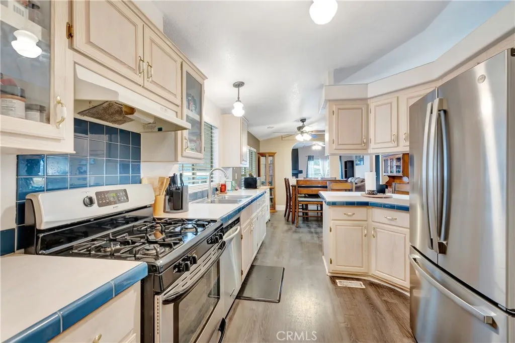 Welcome to one of the most desirable homes currently available in the community—this spacious 3-bedroom, 2-bath double-wide offers the largest floor plan on the market today under $300k, paired with a premium, private location. Ideally situated in the upper back corner of the park, this home enjoys a quiet, low-traffic setting with no rear neighbors. Instead, a beautifully landscaped greenbelt slope provides a serene backdrop and added privacy. The space behind the shed offers room for a patio table or seating area, perfect for relaxing or entertaining in a nice secluded setting. Inside, the home features an expansive and functional layout with abundant natural light throughout. The spacious living room flows seamlessly into a dedicated dining area, and then a separate family room with a cozy fireplace. The kitchen is centrally positioned with a breakfast bar & opens to both the living and dining spaces—ideal for everyday living and gatherings. The generously sized primary suite includes an en-suite bathroom with dual vanities, a large soaking tub, and a separate walk-in shower. There are two additional bedrooms. A convenient indoor laundry room with direct access to the carport adds to the home's functionality. Exterior was recently freshly painted, the home was leveled and pads replaced. Residents enjoy access to community amenities including a pool, spa, clubhouse, and billiards room—offering both relaxation and recreation just steps from home. A rare opportunity to own one of the largest and best-located homes in the community—combining space, privacy, and comfort in one exceptional offering.