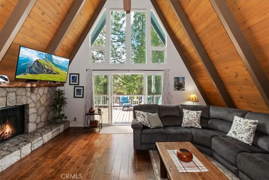 Lake Arrowhead Lake Right Home ~ Home is great for your mountain “get-away” or your primary residence ~ Stunningly Gorgeous Split Granite Fireplace ~ Grand room living ~ Open Kitchen ~ Home has Beautiful wood floors ~ Spacious expansive BBQ Deck ~ Hand Hewn and distressed wood finish throughout ~ Remodeled Baths and Kitchen ~ Large Bonus room/game room newly finished, includes full bath and laundry closet ~ Lots Of Level Parking!! Room For Your R.V. & Boat Along With Several Cars, as well ~ Near 1/4 Acre Corner Lot With Street To Street (Circular) Drive.