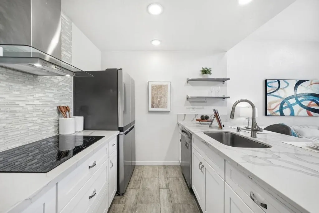 Welcome to this prime end-unit condo with 2 beds and 2 baths in the heart of Palo Alto, set within a gated community. This two-story home offers a thoughtful layout, starting with a spacious lower-level bedroom and a nearby full bath featuring a floating vanity and a sleek stall shower. Down the hall, the cozy kitchen includes quartz countertops, a stylish backsplash, stainless steel appliances, and a breakfast bar. The bright living room boasts a vaulted ceiling and large windows, filling the space with natural light. A sliding door opens to a private balcony-perfect for relaxing outdoors. Upstairs, the primary suite features a bedroom with a vaulted ceiling and an en-suite bath with a shower over tub and skylight, plus direct access to an upper-level balcony. A washer and dryer on the same level add everyday convenience. Additional highlights include engineered hardwood flooring, double-pane windows, and recessed lighting throughout. The home comes with two assigned parking spaces and extra storage in an underground garage. Ideally located near downtown, shops, and restaurants, and within the top-rated Palo Alto school district. Do not miss this great opportunity!