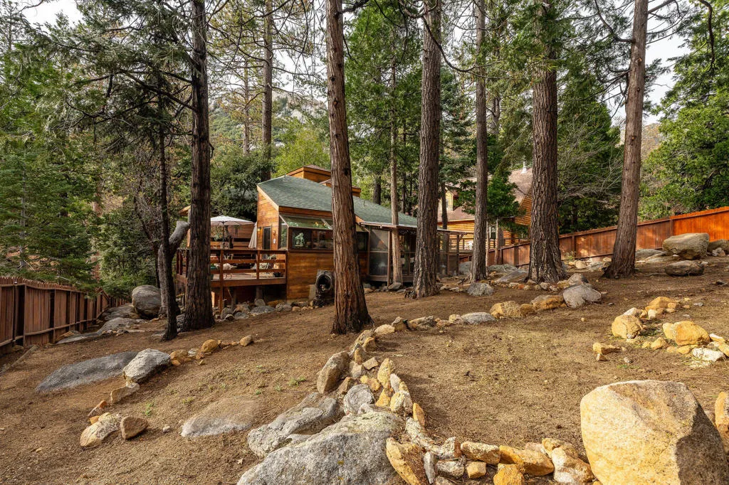 Architectural lines meet mountain ease in this refined 3-bedroom, 3-bath residence with a versatile den, offering a thoughtful blend of design, comfort, and functionality. Clean lines, warm wood tones, and abundant natural light create a balanced, elevated interior with an inviting sense of openness. Vaulted ceilings and expansive windows enhance the living spaces, allowing the outdoors to become an integral part of the home's experience. The layout flows effortlessly from room to room, creating an ideal setting for both everyday living and effortless entertaining.The main living area is anchored by a sense of warmth and simplicity, where natural textures and curated finishes come together to create a calming, cohesive environment. The versatile den on the main level offers flexibility as a home office, creative studio, or additional guest space, adapting easily to your lifestyle needs. Each bedroom is thoughtfully positioned to provide comfort and privacy, while the bathrooms reflect a clean, modern aesthetic with functional design in mind.Step outside to the front deck, where views of iconic Suicide Rock create a striking natural backdrop and a daily connection to Idyllwild's rugged beauty. A screened-in porch with a tranquil fountain extends the living experience outdoors, offering a peaceful space to relax in any season--whether enjoying quiet mornings or unwinding in the evening. Expansive decking surrounds the home, providing multiple areas for lounging, dining, and entertaining beneath the pines.The fully fenced yard offers both usability and a sense of enclosure, blending seamlessly with the surrounding natural landscape while allowing space for gatherings, pets, or gardening. The attached 1-car garage provides convenient interior access, adding ease and practicality, especially during cooler mountain months.Thoughtful upgrades throughout the home enhance both form and function, contributing to a move-in-ready experience that balances modern convenience with timeless mountain character. Every detail has been considered to create a home that feels both refined and welcoming.Ideally positioned to capture the essence of mountain living, this property offers a rare combination of architectural appeal, natural beauty, and everyday livability. Whether envisioned as a full-time residence or a weekend retreat, this is a home designed to inspire connection--to nature, to comfort, and to a more intentional way of living.