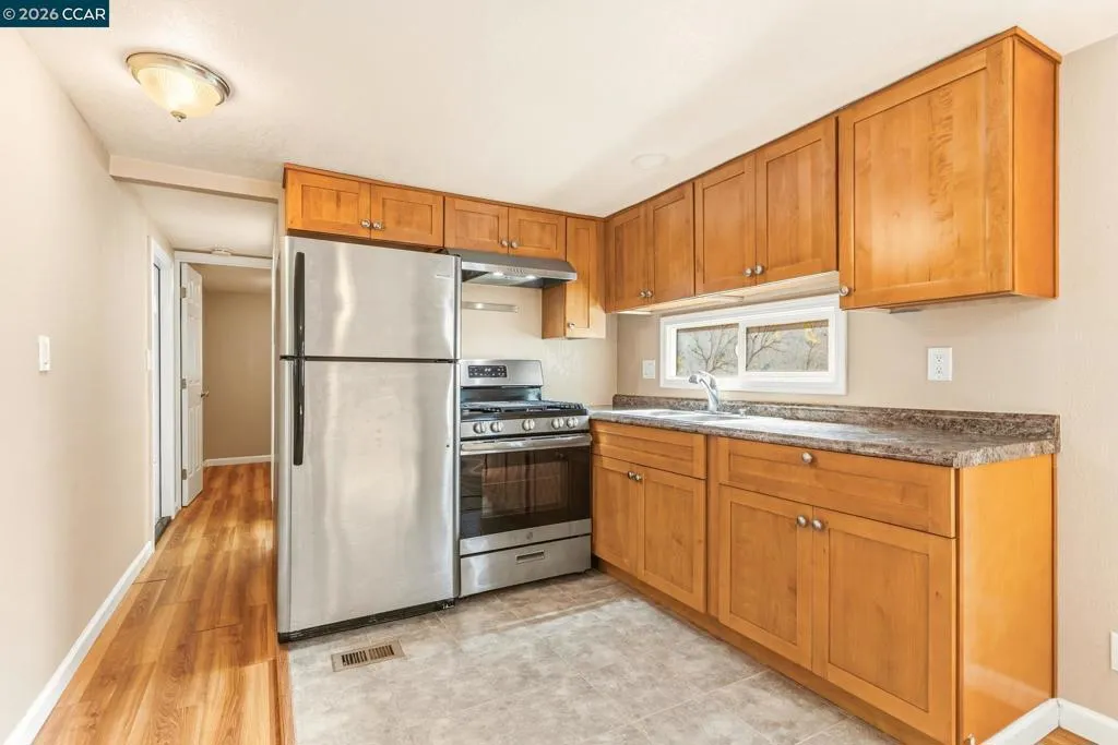 Check out this incredibly budget-friendly, move-in ready home in downtown San Leandro. Offering simple, low-maintenance living, this space is clean, functional, and updated with practical touches throughout. The bright, straightforward floor plan features durable, easy-to-clean laminate flooring in the main living areas. You’ll appreciate the highly functional kitchen, which comes equipped with an impressive suite of stainless steel appliances (gas range, refrigerator, and hood), along with warm wood shaker style cabinetry and solid surface countertop. The bathroom has also been renovated, featuring clean tile work, walk in shower and modern fixtures. Additional perks include mirrored closet doors, a frosted glass entry door and a rare private, enclosed backyard perfect for a mini shade garden. Located on a tree-lined lot, this home is ideally situated near BART, shopping, and public transportation, with quick access to Highways 580 and 880 for a super easy commute. This is the perfect, no-nonsense opportunity to own your own updated space for a fraction of what you'd expect to pay in the East Bay Fireplaces: NO