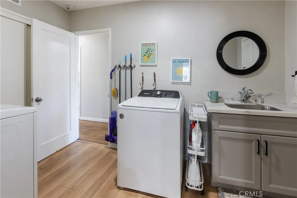 WOOD STREETS - Located on a tree-lined street in one of Riverside’s most loved neighborhoods, this inviting mid-century, single-story home offers 1,258 sqft with 2 bedrooms and 2 bathrooms on a 9,148 sqft lot. Loads of natural light and spacious living spaces make this home especially warm and welcoming. Beautifully refinished original hardwood floors line the large family room with a wood burning fireplace and extend into the dining room, which offers a double-glass door exit to the backyard. Adjacent to the dining room is a tastefully updated kitchen featuring numerous cabinets with pull-outs and soft-close hardware, beautiful quartz counters, and stainless appliances. Both bedrooms are well-proportioned with generous closet space. The home offers a full bathroom with tub/shower combo as well as an additional half bathroom. The interior is completed by a sizeable utility room which houses washing machine hooks ups, a gas dryer supply, a large utility sink, storage closet and a secondary access to the backyard. An expansive covered patio at the rear of the home offers a welcoming lounging and entertaining setting. The oversized and fully-fenced backyard offers a great space for kids or pets to play, or a potential space for an ADU. Other amenities are numerous and include: newer cost-effective heating and cooling mini-split units, newer plumbing, updated light fixtures and recessed lighting throughout, luxury vinyl plank throughout the kitchen and bathrooms, mature fruit producing citrus trees, irrigated yards, an attached pull-through garage, ample driveway parking and more! A perfect retreat nestled in a quiet, coveted neighborhood that's conveniently close to everything including shopping, schools, churches, parks, eateries and more! Truly special and a must see! Low taxes! Not in high fire!