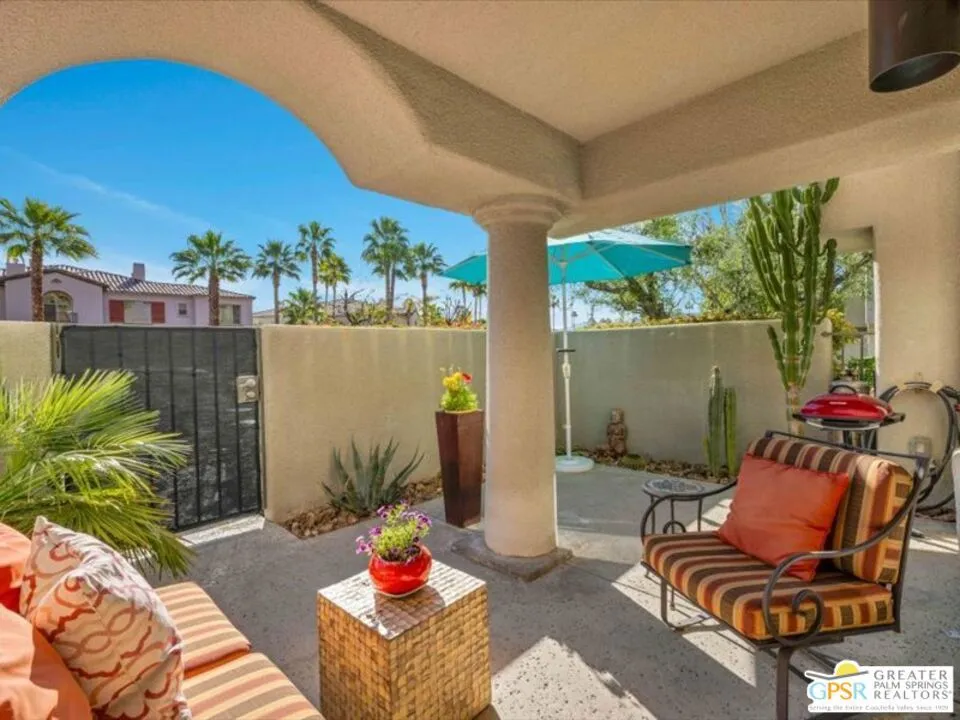 Welcome to your perfect Palm Springs getaway. This stylish one-bedroom condo puts you right in the heart of it all, just minutes from the restaurants, shops, and energy of Palm Canyon Drive, yet tucked away in a peaceful, gated community. Inside, the home has been thoughtfully updated with sleek slate flooring, a modern kitchen and bath, and a spacious walk-in tiled shower. Recessed lighting and in-unit laundry add comfort and convenience, while extra bedroom storage makes everyday living easy. Step outside and you'll find not one, but two private patios ideal for morning coffee, evening cocktails, or weekend BBQs under the desert sky. Offered fully furnished, this move-in ready condo also includes access to resort-style amenities: two sparkling pools, hot tubs, and tennis courts.Whether you're here for a season or something longer, this is effortless Palm Springs living at its best.