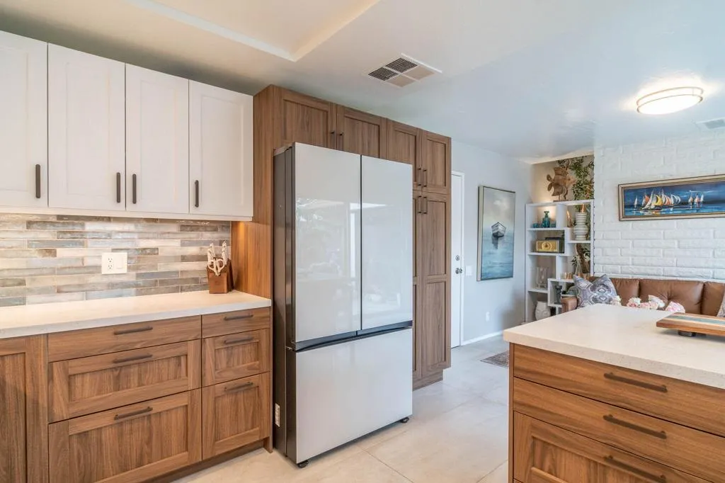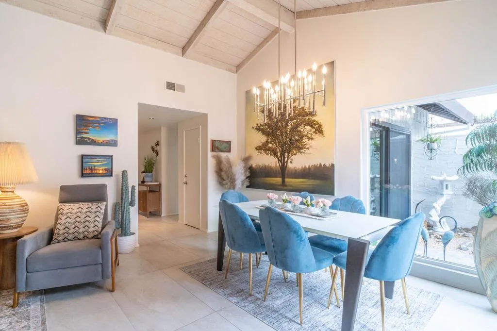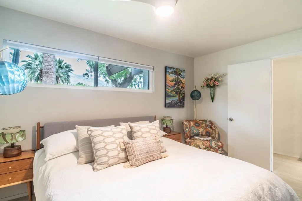 A stunning redesigned 2 bedroom, 2 bath condo showcases high-quality custom finishes throughout. Enjoy the feel of a single-family home with no shared walls. Located in the highly desirable Canyon Sands community in south Palm Springs. The open, light filled kitchen is perfect for entertaining, while the tastefully renovated bathrooms elevate the home's modern appeal. New kitchen appliances, ceiling fans, water heater. Mountain view from the bedroom. Thoughtful upgrades include expansive large-format tile flooring, new windows and sliders. The living space seamlessly extends to a private, newly landscaped patio, creating an effortless indoor-outdoor lifestyle. The spacious living room showcases vaulted ceilings with exposed beams and a cozy fireplace. Features a pristine, attached two-car garage featuring epoxy flooring and ample storage. Residents enjoy beautiful landscaping and resort-style amenities including 7 salt water pools and spas, 5 tennis courts, and 3 pickleball courts with on-site management. Mature desert landscape, variety of trees: grapefruit, lemon, orange, and tangerine. Canyon Sands offers an on-site HOA known for its excellent management. HOA dues are $665/month (including water, trash, cable, roof, and WIFI). Land lease $134/month through 2061. Owners are permitted to rent their units for a minimum of 29 days.