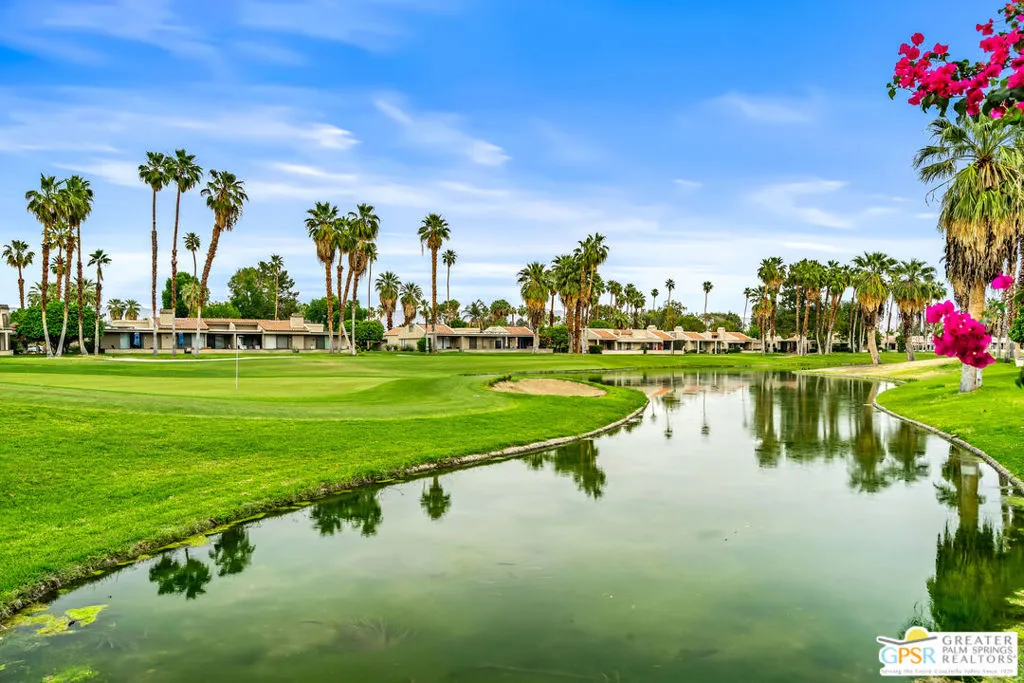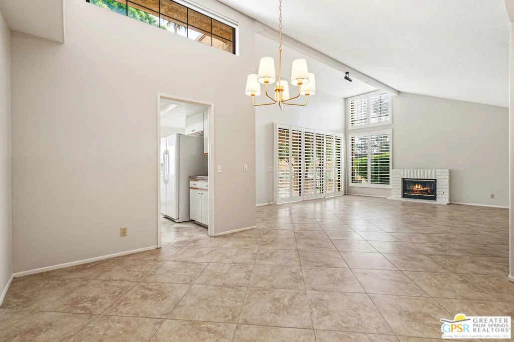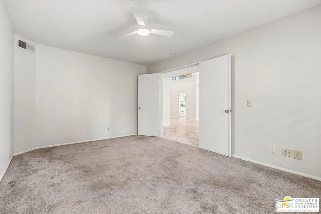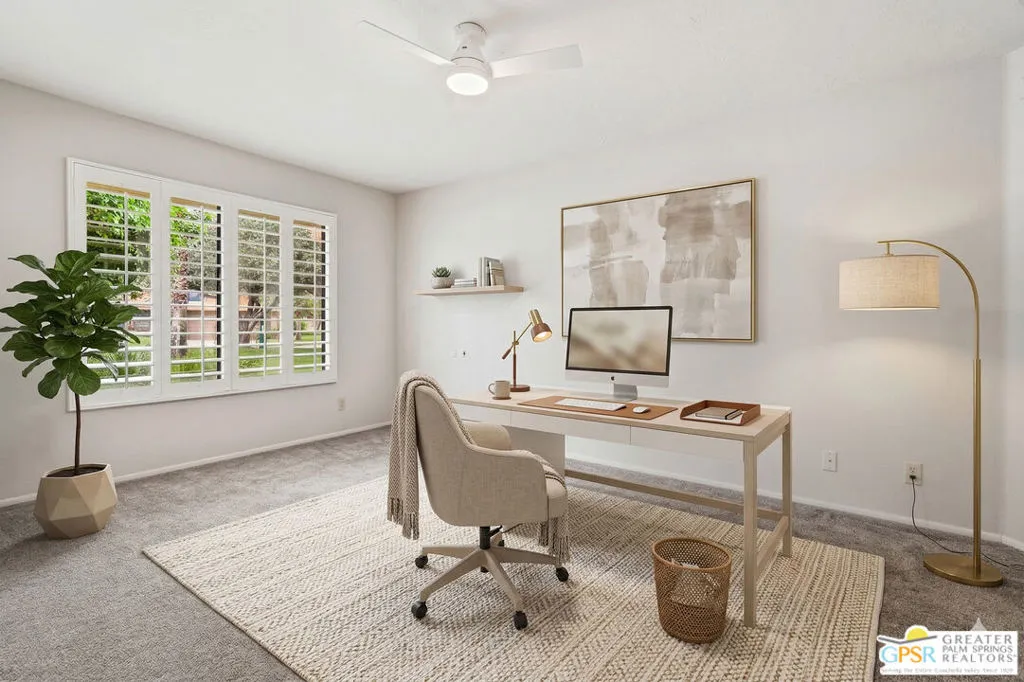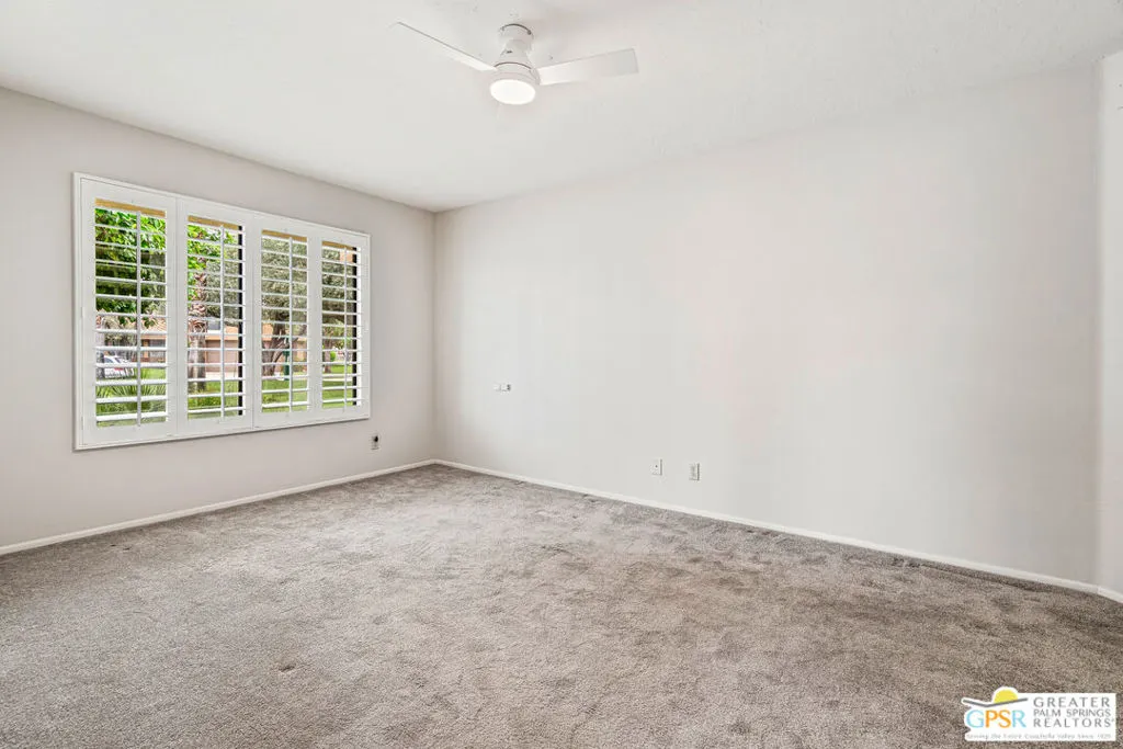 Palm Springs, 2,027-square-foot condominium located in the Cathedral Canyon Country Club in South Palm Springs. This is a single-level condo, with 2 Bedrooms, den/flex room, and 2 Bathrooms. Interior Features: Living room with vaulted ceilings (9ft+), and fireplace. Kitchen: granite countertops, updated appliances, breakfast room with direct access to the covered patio. Primary suite: with vaulted ceiling, walk in closet, shower and soaking tub, dual sink vanity. Upgraded window coverings throughout the home, ceramic tile floors in common areas, carpeted bedrooms and flex room, updated ceiling fans in all rooms. A two car attached garage with direct access and plenty of storage, inside laundry room, patio with pony wall and extended patio cover. This unit is conveniently located near a community pool and spa. The Cathedral Canyon Country Club offers controlled access, professional maintenance grounds, all this with a Palm Springs address!