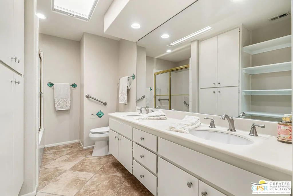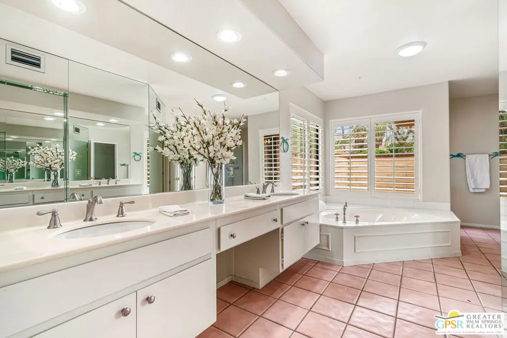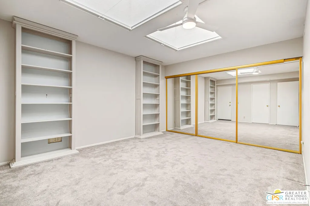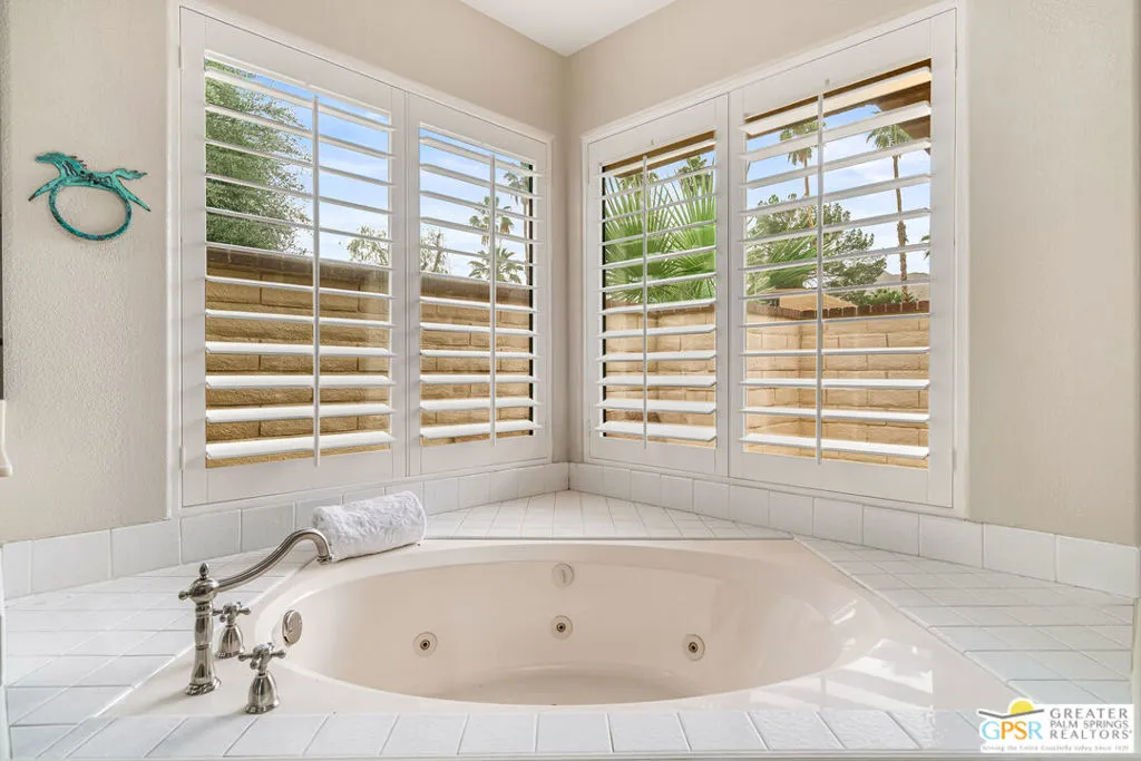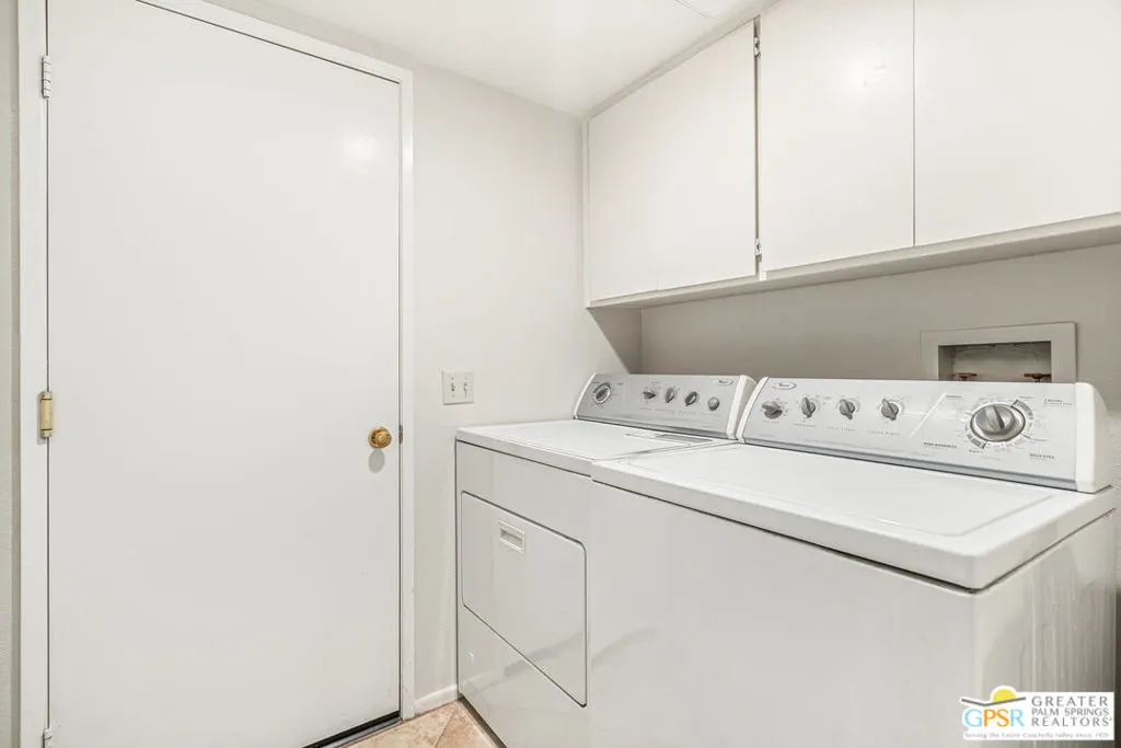 Palm Springs, 2,027-square-foot condominium located in the Cathedral Canyon Country Club in South Palm Springs. This is a single-level condo, with 2 Bedrooms, den/flex room, and 2 Bathrooms. Interior Features: Living room with vaulted ceilings (9ft+), and fireplace. Kitchen: granite countertops, updated appliances, breakfast room with direct access to the covered patio. Primary suite: with vaulted ceiling, walk in closet, shower and soaking tub, dual sink vanity. Upgraded window coverings throughout the home, ceramic tile floors in common areas, carpeted bedrooms and flex room, updated ceiling fans in all rooms. A two car attached garage with direct access and plenty of storage, inside laundry room, patio with pony wall and extended patio cover. This unit is conveniently located near a community pool and spa. The Cathedral Canyon Country Club offers controlled access, professional maintenance grounds, all this with a Palm Springs address!