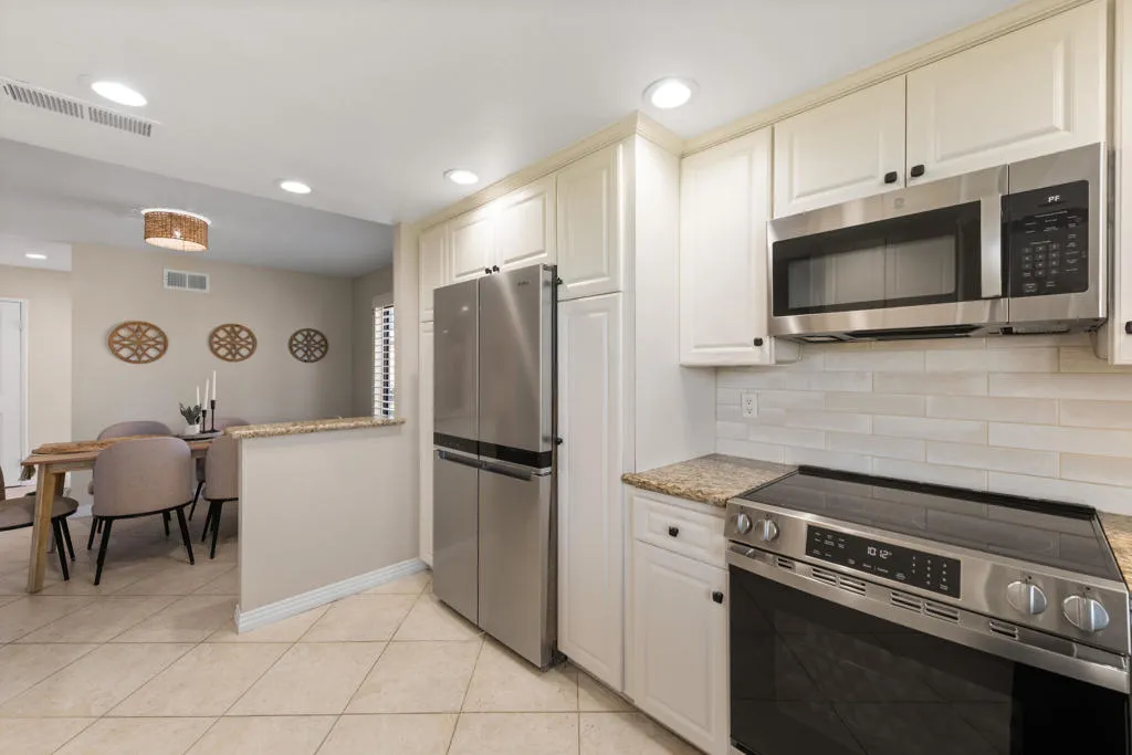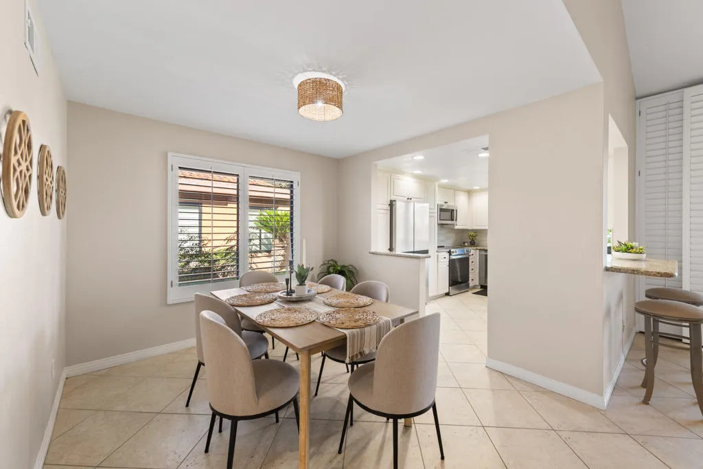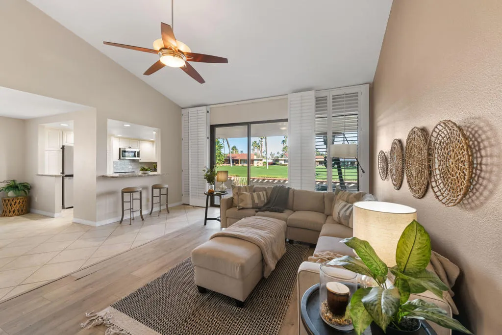 Discover this exceptional Sunrise Country Club residence nestled within one of Rancho Mirage's premier gated communities. This spacious home overlooking the lush 14th fairway offers serene golf course and mountain vistas. Step inside to an inviting open layout showcasing approximately 1,650 sq ft. This expanded desirable Barcelona model features 2 bedrooms, 2 baths, plus a versatile den/office/3rd bedroom. The bright living room boasts vaulted ceilings and sliding glass door that connect indoor living to the private patio - ideal for morning coffee or sunset relaxation. Additional features: dual pane windows, plantation shutters, newer AC, garage door, and laminate flooring. The kitchen with granite counters and newer appliances, offers abundant cabinetry and counter space with a natural flow into the adjacent dining area. The comfortable primary suite includes an ensuite bathroom and walk-in shower. Convenience meets functionality with an indoor laundry room that opens directly to the attached 2 car garage. Sunrise Country Club offers an exceptional resort-style living with 24 hour security, golf, 21 swimming pools, 19 spas, tennis and bocce courts, fitness center, clubhouse amenities, and more, all within a beautifully landscaped enclave just minutes from world class dining, shopping, and desert recreation.