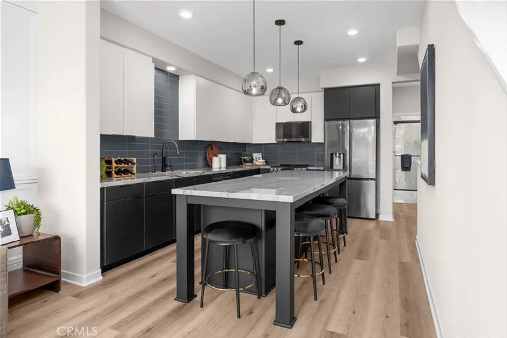 Welcome to Tesoro Walk, an exclusive gated community in the heart of Downey, featuring 33 beautifully crafted townhomes. This exceptional residence is the model home, showcasing professionally curated, designer-selected upgrades throughout—offering a truly elevated and turnkey living experience. The popular “Ruby” floorplan welcomes you with a private, enclosed patio that leads to your front door, creating a warm and inviting entry. Inside, the first level features a spacious foyer and convenient coat closet, along with direct access to your two-car garage. The second floor serves as the main living level and is designed for both everyday living and entertaining. Enjoy a stunning open-concept layout with a spacious kitchen featuring a large eat-in island, upgraded finishes, and seamless flow into the bright and airy living room. This level also includes a full bedroom and full bath—perfect for guests, multigenerational living, or a home office. Upstairs, the third level offers a thoughtfully designed layout with a convenient laundry room, a luxurious primary suite complete with a walk-in closet, and a secondary bedroom featuring its own private en-suite bath and walk-in closet. As the model home, this residence is filled with high-end designer touches and premium upgrades throughout, delivering style, comfort, and sophistication at every turn. Don’t miss this rare opportunity to own a beautifully appointed showcase home in one of Downey’s most desirable new communities!