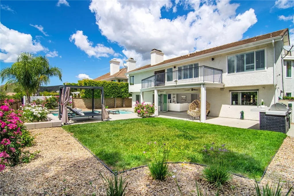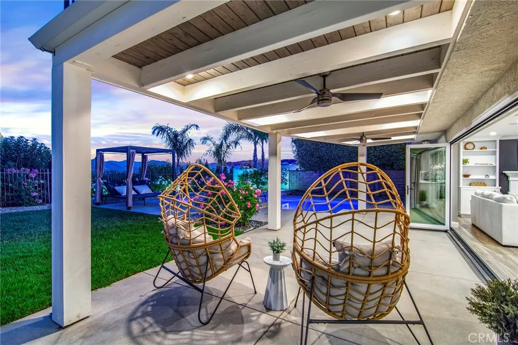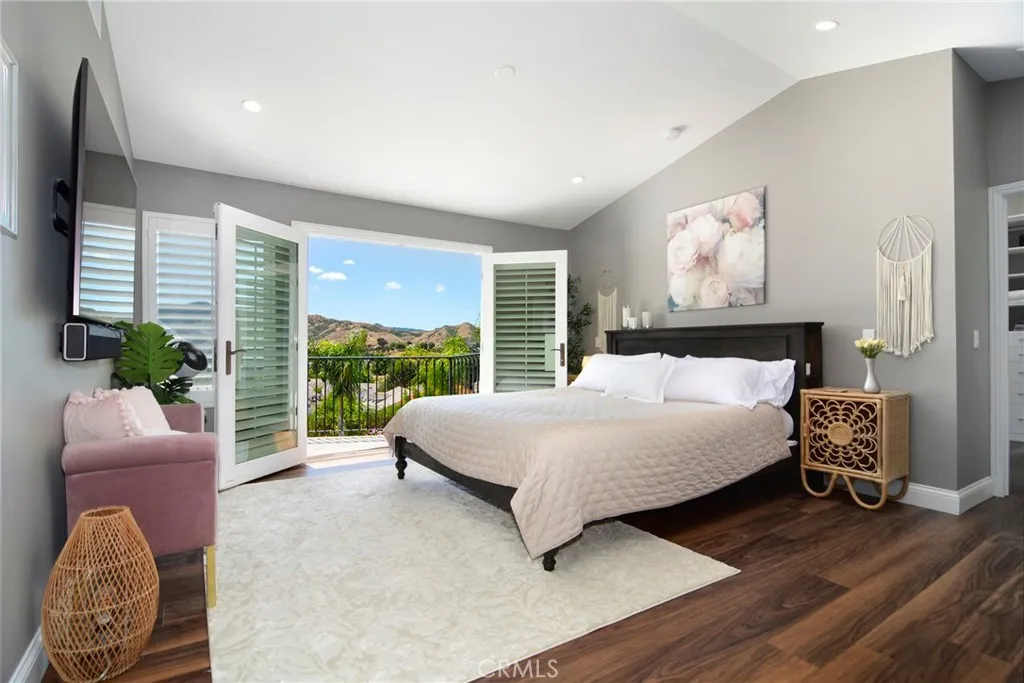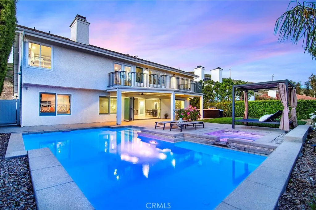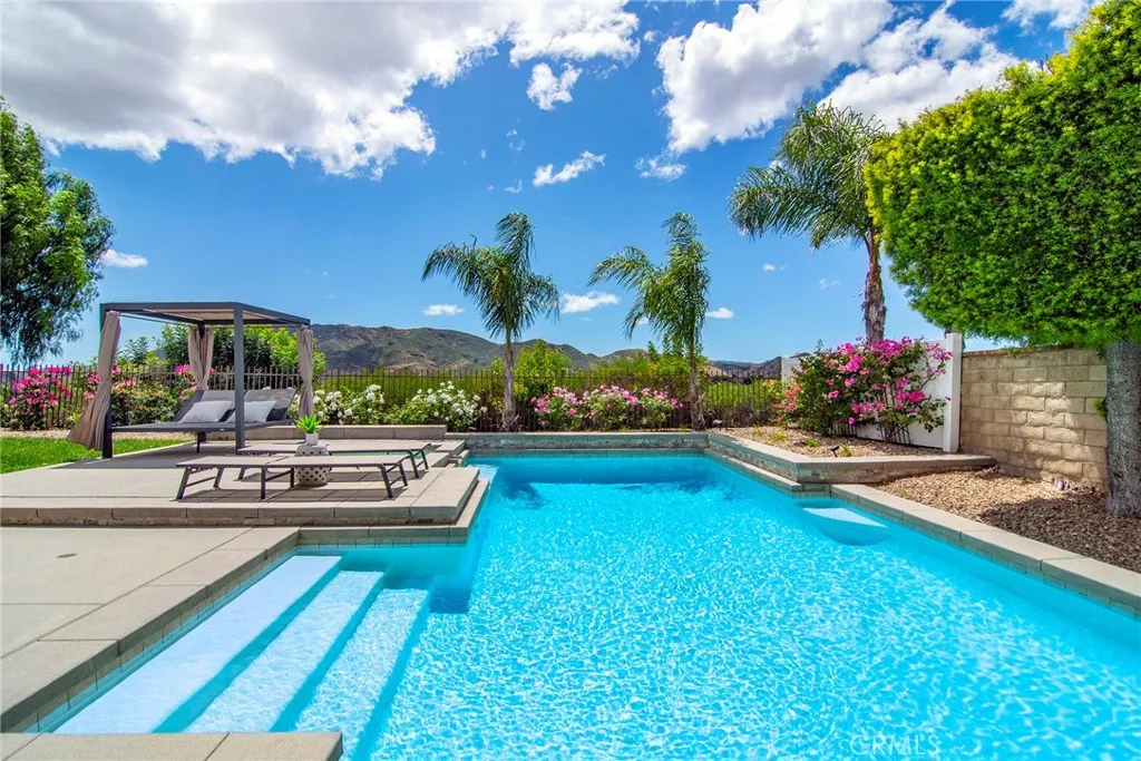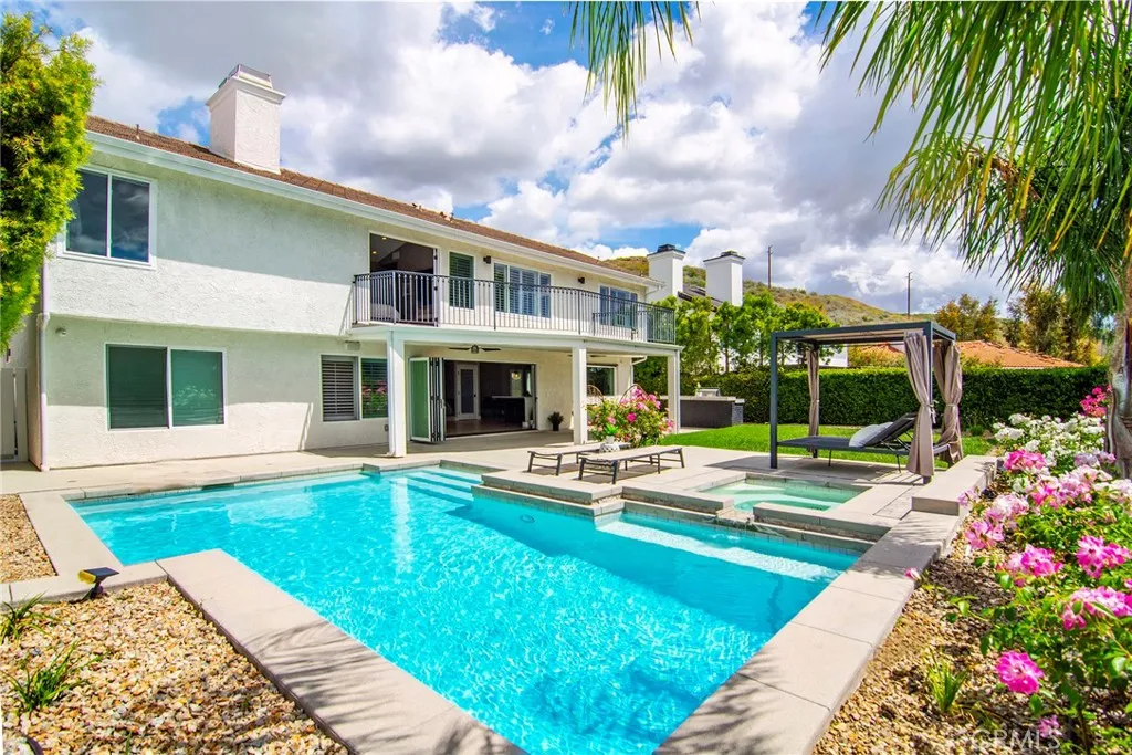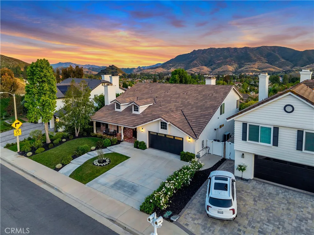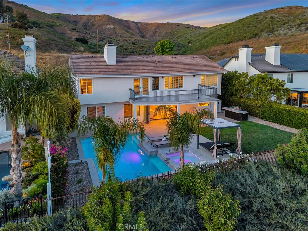 Located in Morrison South Meadows, this 4-bedroom, 3-bath home offers approximately 3,141 sq ft and captures sweeping, direct views of Ladyface Mountain and the Santa Monica Mountains. Set on a quiet residential street, the home is designed to maximize natural light, privacy, and a seamless indoor-outdoor lifestyle. Extensively updated in 2020, improvements include copper plumbing, updated electrical, newer roof, HVAC system, garage door, EV charger, roof-mounted fire sprinklers, and cement siding at the front elevation. The interior is designed for both everyday living and entertaining, featuring an open-concept layout that connects the kitchen, dining, and living spaces. The remodeled kitchen is finished with a premium Thermador appliance suite and quality materials throughout. A main-level bedroom and full bath offer flexibility for guests, office, or multigenerational living. The primary suite is positioned to capture sunset and mountain views and includes a private balcony and a large, finished walk-in closet with its own views, creating a true retreat experience. Outdoor spaces are built for entertaining and relaxation, with a redesigned pool, multiple seating and dining areas, and open sightlines to the surrounding hills—blending indoor and outdoor living. Additional features include a 2-car garage with direct access, custom cabinetry, epoxy flooring, and a storage loft. Located near Morrison Park, Chumash Park, Santa Monica Mountains trailheads, shopping, dining, and convenient access to the 101 freeway.