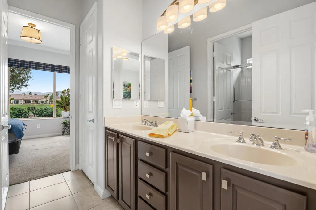 Presenting a rare chance to own the highly sought after San Rafael model ideally situated on the golf course with a spacious, south-facing lot. This exceptional home features three full bedrooms, an additional office or den, two and a half bathrooms, and a FULL 3-CAR GARAGE to accommodate all your needs. Enjoy breathtaking sunsets from the oversized backyard, which features both water and panoramic views of the magnificent Santa Rosa mountain range. The outdoor space is perfect for relaxing or entertaining, offering an unmatched setting within the community. The home is thoughtfully updated with a modern kitchen featuring QUARTZ COUNTERTOPS and newer appliances. Additional highlights include a 2019 HVAC system for year-round comfort, a mini-split AC unit in the garage, a NEW LG washer and dryer, as well as an extra refrigerator and upright freezer in the garage. The garage also offers new cabinetry and overhead storage, while the bedrooms are fitted with NEW carpeting. The sale includes NEW patio furniture and a golf cart equipped with NEW batteries. Enhanced with numerous technology advancements, such as smart home switches, automated blinds, and a surround sound system, ensuring both comfort and convenience for modern living. PRIME LOCATION. Location is key--this property is just a five-minute walk from the main Montecito Clubhouse, making it easy to enjoy the community's extensive amenities. RESORT STYLE LIVING-Sun City Shadow Hills is a renowned 55+ active adult community known for its vibrant atmosphere and exceptional resort-style amenities. Residents enjoy access to two expansive clubhouses, each equipped with state-of-the-art fitness centers, indoor and outdoor pools, relaxing spas, and a robust calendar of classes and events. The community features two meticulously maintained championship golf courses, as well as courts for tennis and pickleball. Social clubs abound, catering to a wide range of interests including arts and crafts, travel, and dining. Additional recreational opportunities include Pickleball, Tennis, bocce, billiards, and participation in over 50 different social clubs, ensuring an active and fulfilling lifestyles for all residents.