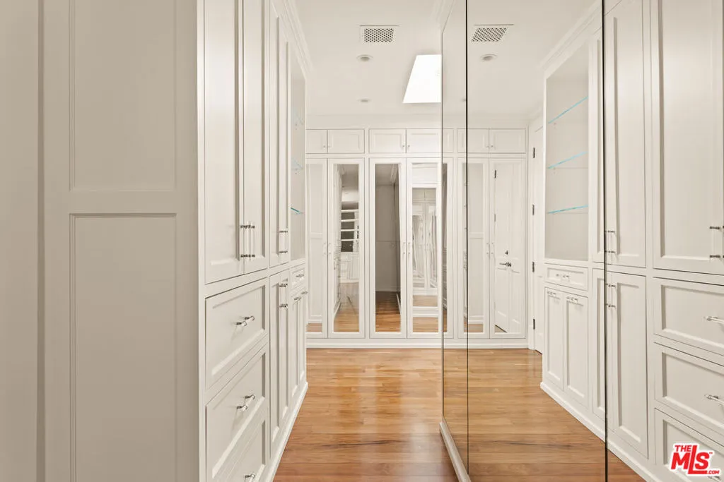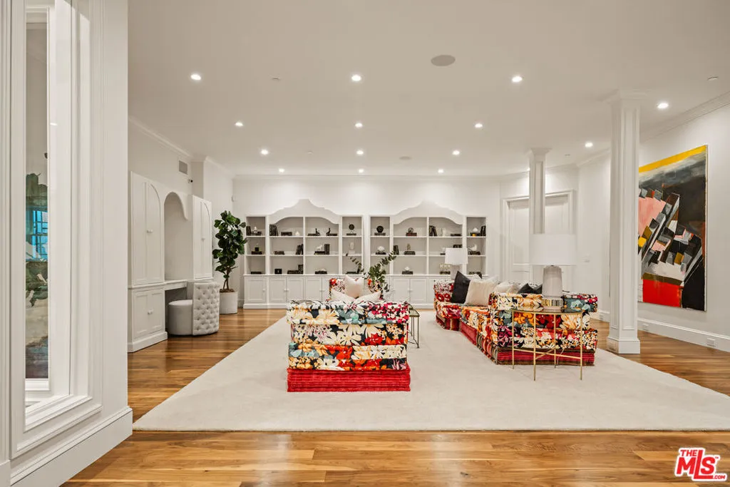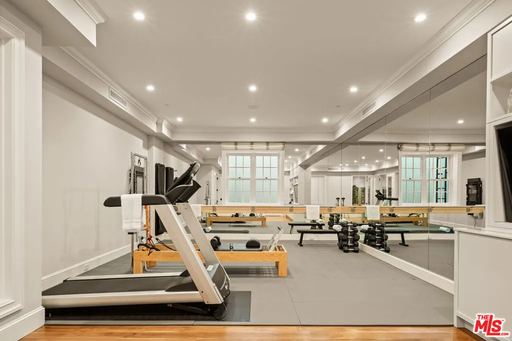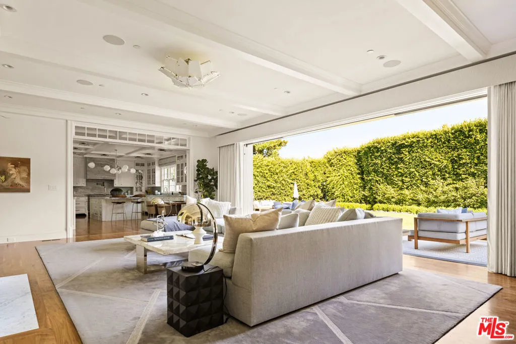 Tucked away in the highly sought-after Lower Riviera of Pacific Palisades, this exceptional traditional estate captures the spirit of understated luxury through impeccable craftsmanship, refined details, and a calm, sophisticated atmosphere. From timeless finishes to thoughtfully executed upgrades and distinctive architectural windows, the home has been designed with both beauty and livability in mind.Spanning three expansive levels, the residence offers a natural sense of flow and balance. On the main floor, bathrooms accented with amethyst and rose quartz bring a subtle, tranquil elegance. Formal spaces include a richly detailed study and a graceful dining room, complemented by a hidden butler's pantry and separate wet barideal for both intimate dinners and larger gatherings.At the center of the home, the chef's kitchen stands out with its honed marble hood, top-tier appliances, and a welcoming breakfast nook. Just beyond, the family room opens effortlessly to a secluded outdoor setting featuring a bluestone terrace, pool and spa with automated cover, built-in BBQ, wood-fired pizza oven, and mature hedging for privacy.Natural light pours into the upper level through skylights, where two ensuite bedrooms and a versatile bonus roomcomplete with custom wallpaper and whiteboard wallsoffer flexibility for work, study, or play. The primary suite is a true retreat, highlighted by vaulted ceilings, linen-upholstered walls, a statement fireplace, motorized blackout shades, and a private balcony with subtle ocean glimpses. Its spa-like bath features hand-laid Michael Aram floral marble, heated floors, dual walk-in closets, and a dual-suite configuration with individual Japanese toilets.The lower level is designed for both relaxation and recreation, showcasing a cutting-edge home theater with a full-scale screen, cinema-quality projection, custom seating, and rich black mohair walls. This floor also includes a generous flex space, an additional bedroom, a custom wine cellar, and a fully equipped gym with mirrored walls and a ballet barre.Additional features include a comprehensive security system, Crestron whole-home audio and video integration, three retractable outdoor awnings, a vegetable garden, and completed post-fire inspection with air-quality remediation for added reassurance.Blending classic elegance with modern comfort, this home presents a rare opportunity to live in one of Los Angeles' premier neighborhoods, just moments from the renowned Riviera Country Club. Offered partially furnished, it includes a thoughtfully curated selection of designer and custom furnishings throughout.