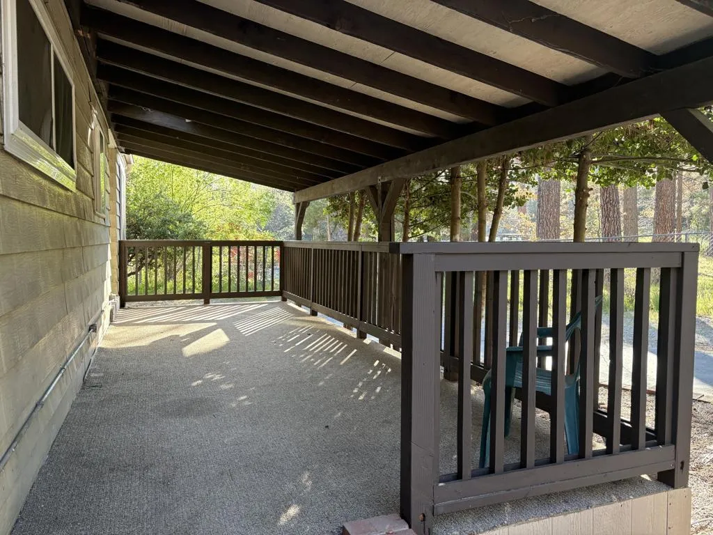 Welcome to one of the largest and most private mobile homes in Idyllwild Trailer Park, a 55+ senior-only mobile park located in downtown Idyllwild. This approximately 1,200 sq. foot light and airy home, located at the end of the road in the park, offers lots of space, peace, and quiet for full-time or part-time living. The home features two large bedrooms with ample closet space, two bathrooms (one full, one 3/4), a separate office space, a large living room, large kitchen, dining area, and separate laundry room, as well as outdoor decking. The home has new flooring, new indoor paint, dual pane windows, and the primary bathroom has been remodeled. Off of your parking area you enter through a spacious covered patio into the open concept living, dining, and kitchen areas that include lots of cabinets and a built-in hutch, as well as a slider to the back side deck. Off the hallway you have access to the laundry area with further access to the separate bonus room/office that opens onto the second deck in the in backyard. Continuing down the hall, on your left you have the guest bedroom, which is across the hall from the 3/4 bathroom. At the end of the hall is the oversized primary suite that includes a large closet and an en suite remodeled full bathroom. Upgrades include new exterior and closet doors, dual pane windows, primary bathroom vanity and tile, redone footings and skirting, as well as a newer refrigerator. All appliances are included. The space includes fruit trees planted to the right of the home. Space rent at is $817 per month, which includes water and snow plowing fees.