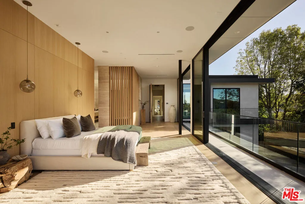 The Glassridge Residence. A Tadao Ando inspired organic modern with walls of glass that open to ocean and Getty views. Privately gated and set along one of Bel Air's most prominent ridgelines, the estate was newly completed in 2025 by Studio MD - AIA, with interiors by James Rosen. The main level is conceived as an open-plan environment with soaring 12' ceilings and sliding glass walls that connect living, dining, and kitchen spaces directly to the surrounding landscape. The kitchen reads like a gallery installation, featuring full-height travertine surfaces, a 15' waterfall island, and seamless, handle-less cabinetry that conceals an integrated Miele appliance suite, including double ovens and a built-in espresso machine. On the top level, a private vestibule with a stone-clad prep bar, integrated sink, and refrigerator precedes the primary suite, creating a quiet transition before the view reveals itself. Designed to honor its breathtaking setting, the bedroom is lined with floor-to-ceiling sliding glass walls that open to a wraparound private terrace, extending the suite outdoors and framing uninterrupted hillside and ocean views. The en-suite bath is resort-caliber, finished in travertine with a freestanding soaking tub, walk-in shower, and custom double floating vanities. A linear skylight draws natural light into the space, while a custom walk-in closet sits adjacent, integrated with matching wood millwork. The lower level is organized as a sequence of architectural moments featuring a linear corridor set against an exposed board-formed concrete wall, left intentionally raw, accented by wide-plank oak flooring. This level includes a private three-tier theater, temperature-controlled wine room, gym and steam shower, bar and lounge area that opens to a separate outdoor deck, all designed as a self-contained environment for leisure, wellness, and entertaining. A fully integrated Control4 system manages lighting, climate, audio, and security. The backyard showcases a 41' infinity pool that visually disappears into the landscape, flowing into a waterfall feature visible from the lower deck below. Lounge areas, dining zones, a built-in Alfa wood-fired pizza oven, grill, and a level lawn are arranged as distinct outdoor settings, all oriented toward the surrounding hills. 1149 Linda Flora Drive stands apart as an architecturally distinguished estate thoughtfully designed for privacy and wellness.