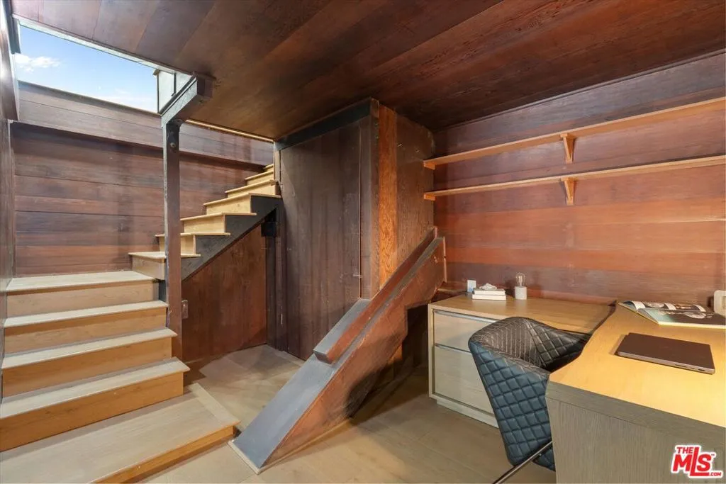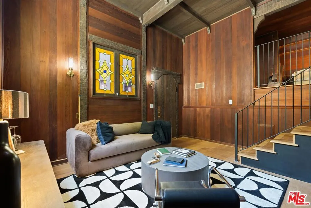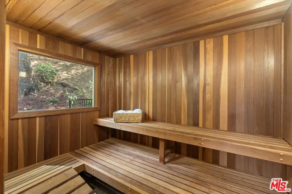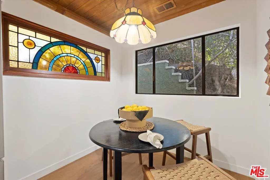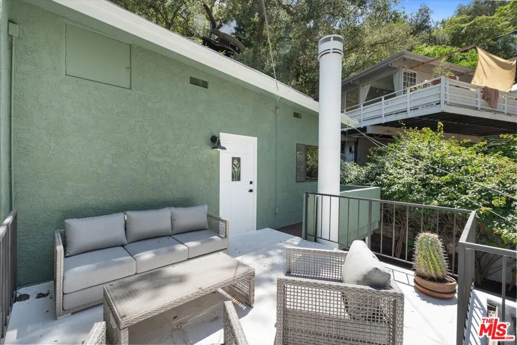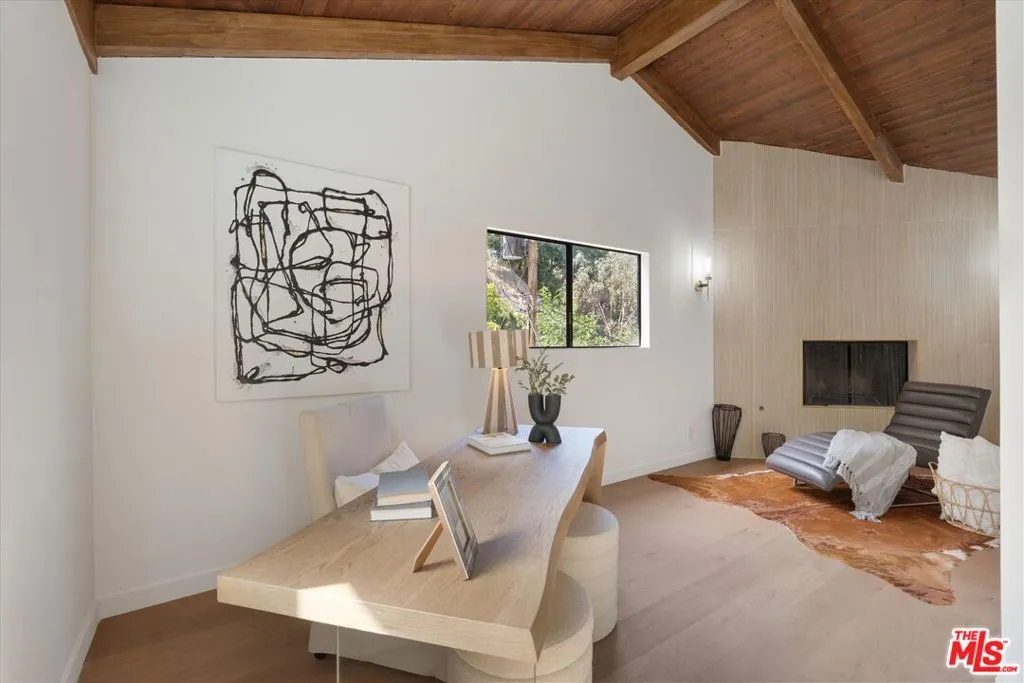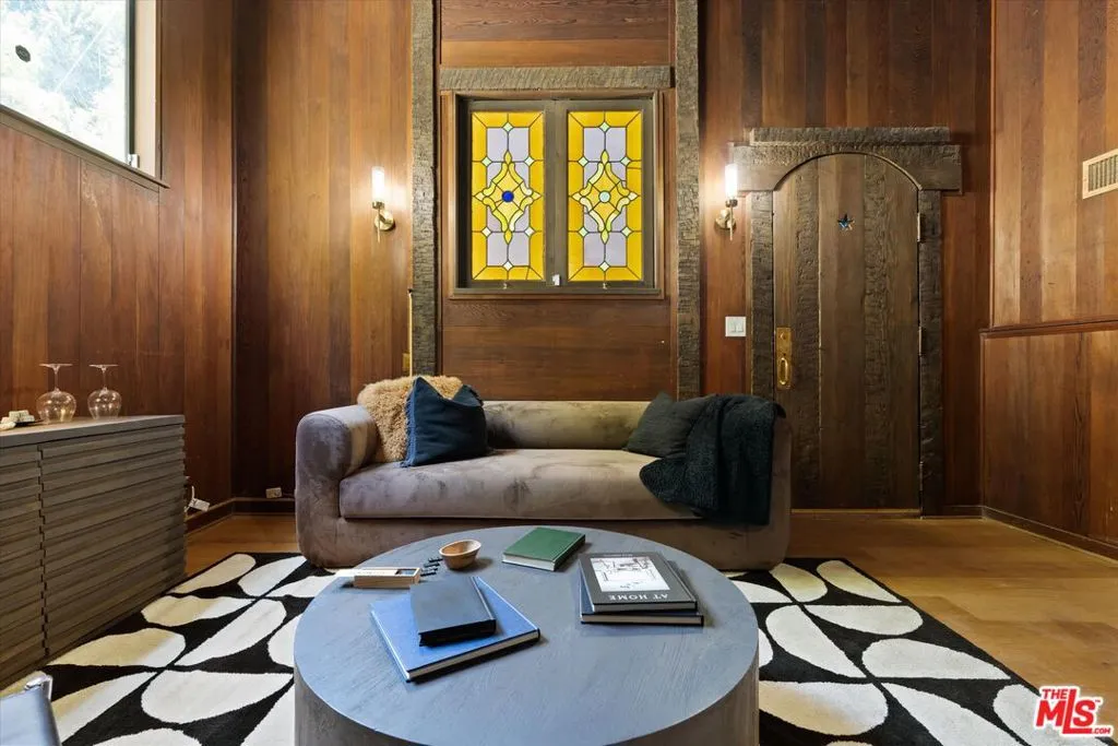 Nestled on a quiet cul-de-sac in the heart of iconic Laurel Canyon, 8506 Oak Court is a truly special and character-rich retreat surrounded by canyon views, mature trees, and legendary history. Originally built in the 1950s, this unique home blends timeless charm with thoughtful updates, showcasing original wood siding, stained glass details, and an inviting lower-level den in the original portion of the residence. As you move through the home, a separate upper level offers incredible creative flexibility with a desk area ideal for a studio or workspace, plus a closet potential for use as a vocal booth. At the top of this wing, you'll find a living room, dining area, kitchenette, bedroom, bathroom, and a beautiful patio overlooking the canyon.An expansive addition completed in 1970 introduces a spacious second wing with 3 bedrooms and 2.5 baths, highlighted by dramatic two-story ceilings in the living room, a beautiful fireplace, engineered hardwood floors, updated lighting, and a well-appointed kitchen featuring a wine rack, beverage fridge, pantry, and adjacent laundry room. A powder room and formal dining area add convenience, while the oversized two-story, two-car garage includes a dumbwaiter that brings bags and groceries directly up to the dining level. Upstairs, soaring arched wood ceilings create a striking architectural statement. This level includes an office or bedroom with fireplace and canyon views, an additional bedroom, a full hallway bath, sauna, second laundry area, and an extraordinary primary suite with sweeping views, a walk-in closet, freestanding tub, large shower, double vanity, private water closet, and direct access to a private deck.Outside, the terraced hillside is lined with lush plantings and a built-in walkway leading upward for even more immersive views of Laurel Canyon. Just moments from Hollywood, Laurel Canyon Market, beloved hiking trails, and the rich music history of the neighborhood, this one-of-a-kind property offers an inspiring lifestyle in one of Los Angeles' most storied enclaves. Come experience it in person.