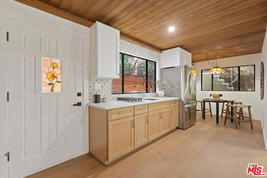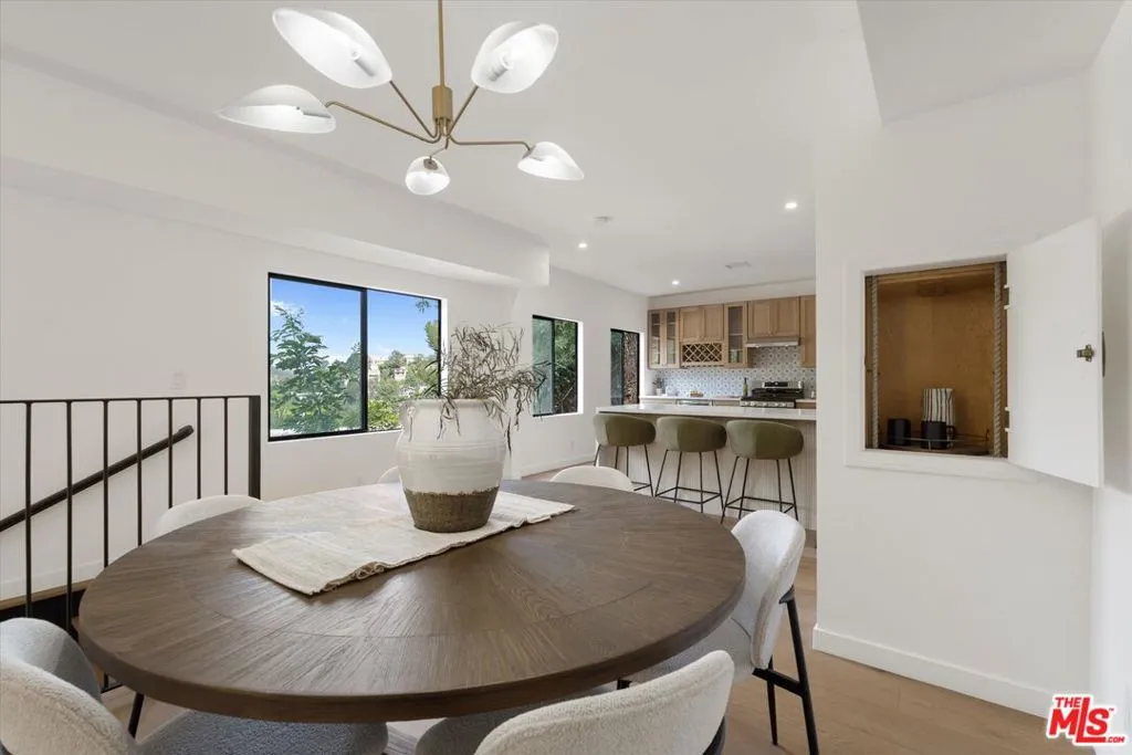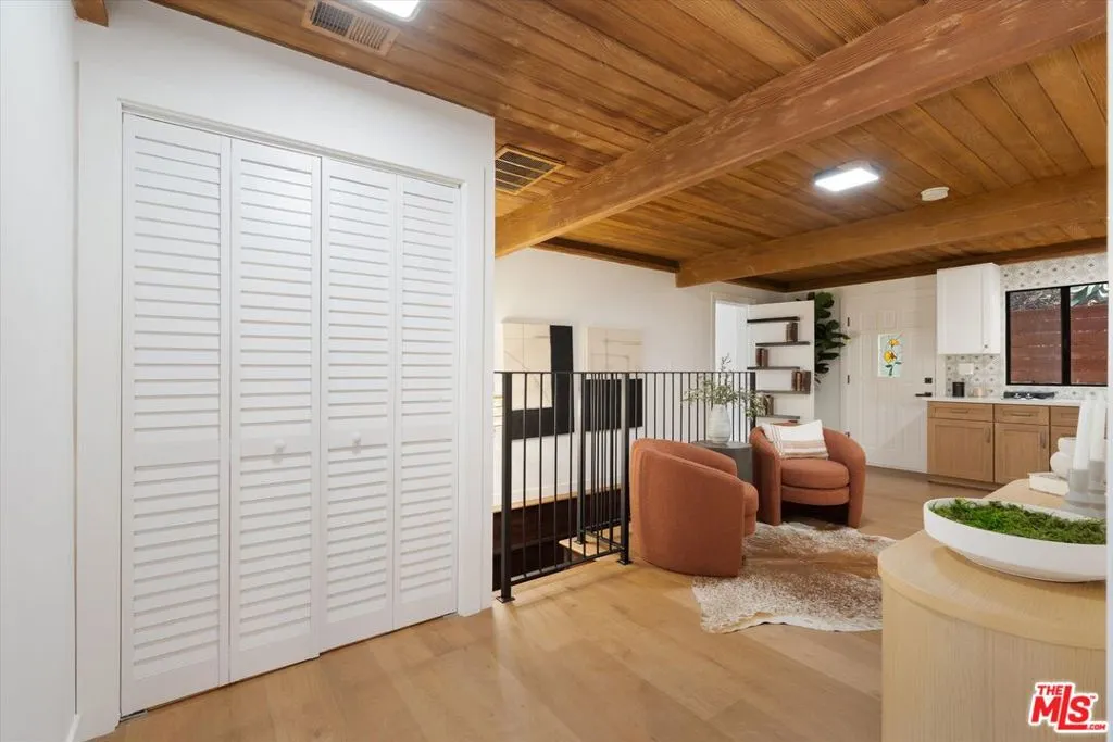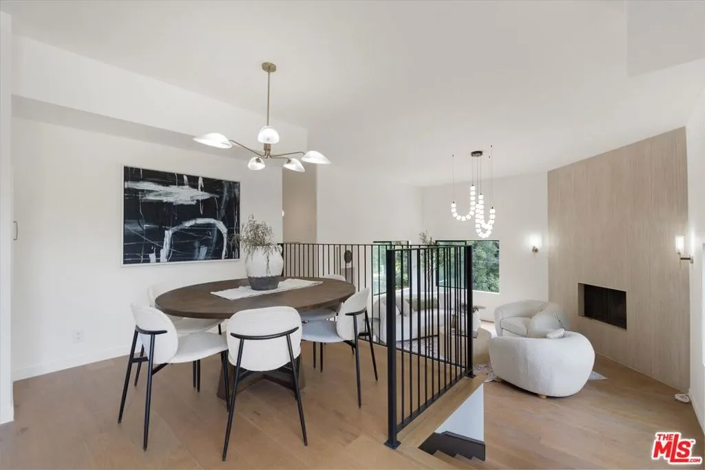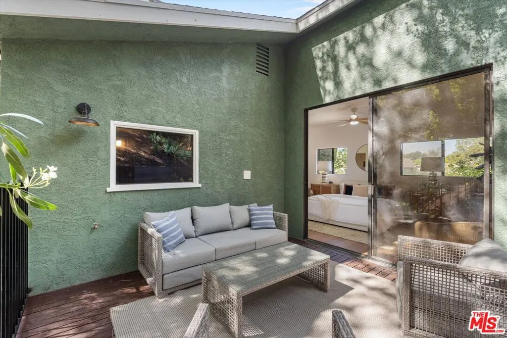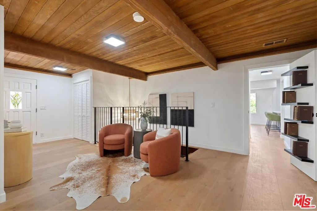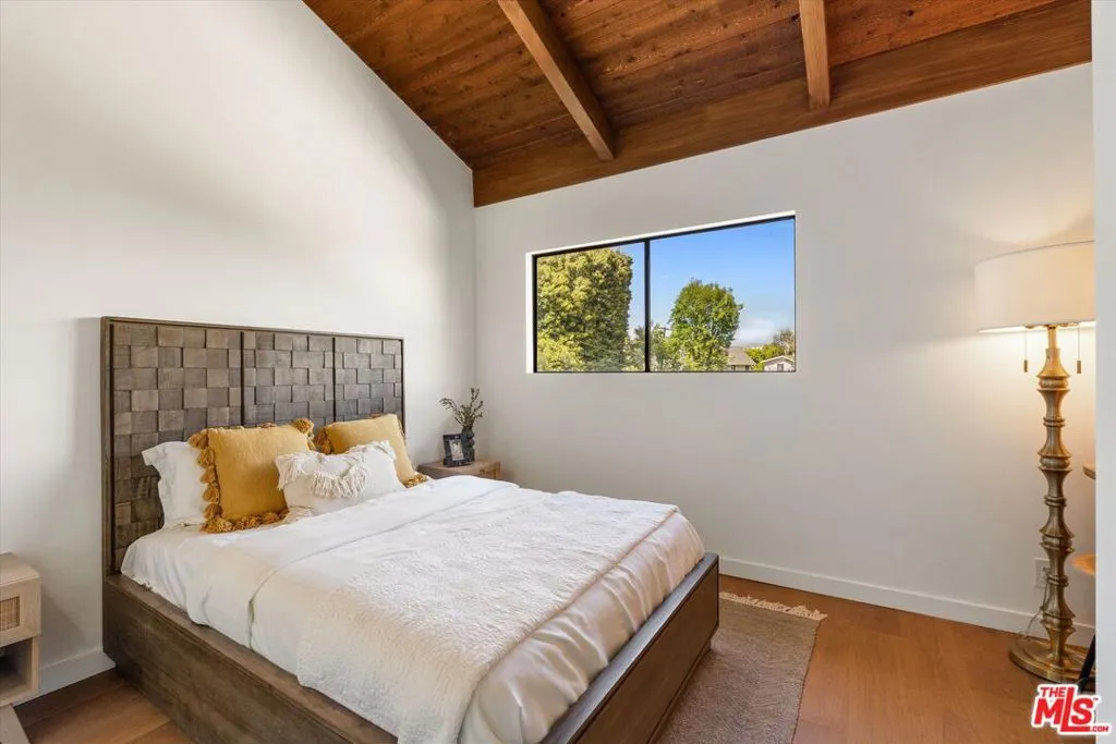Nestled on a quiet cul-de-sac in the heart of iconic Laurel Canyon, 8506 Oak Court is a truly special and character-rich retreat surrounded by canyon views, mature trees, and legendary history. Originally built in the 1950s, this unique home blends timeless charm with thoughtful updates, showcasing original wood siding, stained glass details, and an inviting lower-level den in the original portion of the residence. As you move through the home, a separate upper level offers incredible creative flexibility with a desk area ideal for a studio or workspace, plus a closet potential for use as a vocal booth. At the top of this wing, you'll find a living room, dining area, kitchenette, bedroom, bathroom, and a beautiful patio overlooking the canyon.An expansive addition completed in 1970 introduces a spacious second wing with 3 bedrooms and 2.5 baths, highlighted by dramatic two-story ceilings in the living room, a beautiful fireplace, engineered hardwood floors, updated lighting, and a well-appointed kitchen featuring a wine rack, beverage fridge, pantry, and adjacent laundry room. A powder room and formal dining area add convenience, while the oversized two-story, two-car garage includes a dumbwaiter that brings bags and groceries directly up to the dining level. Upstairs, soaring arched wood ceilings create a striking architectural statement. This level includes an office or bedroom with fireplace and canyon views, an additional bedroom, a full hallway bath, sauna, second laundry area, and an extraordinary primary suite with sweeping views, a walk-in closet, freestanding tub, large shower, double vanity, private water closet, and direct access to a private deck.Outside, the terraced hillside is lined with lush plantings and a built-in walkway leading upward for even more immersive views of Laurel Canyon. Just moments from Hollywood, Laurel Canyon Market, beloved hiking trails, and the rich music history of the neighborhood, this one-of-a-kind property offers an inspiring lifestyle in one of Los Angeles' most storied enclaves. Come experience it in person.