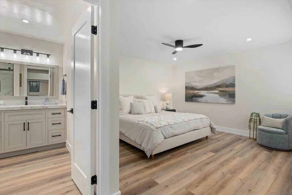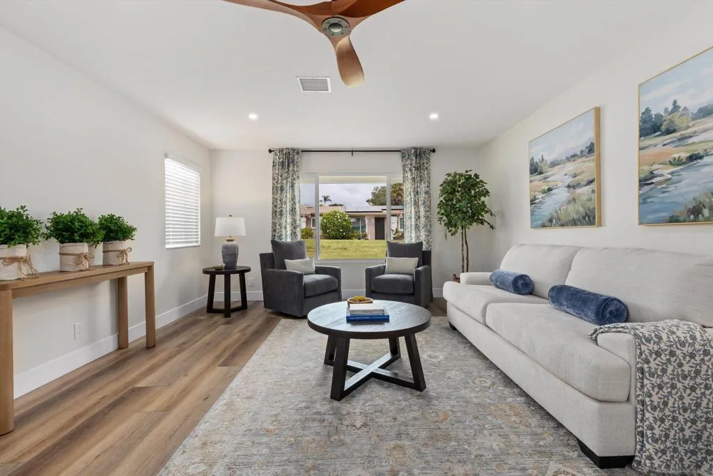 This fully remodeled, single-story home in Oceana East III has been completely redone from top to bottom, and it shows. A new owner can move in and enjoy the comfort and peace of mind that comes with a new roof, new kitchen and appliances, new floors, updated bathrooms, new gutters, and a completely refinished garage. The finishes are current, but timeless. The open kitchen features beautiful countertops, stainless appliances, and peninsula seating that flows naturally into the living area, with plenty of natural light and views of greenery out the windows. Wide-plank flooring runs throughout, along with recessed lighting and ceiling fans. The primary suite is spacious and quiet, with a double-vanity en-suite bath. The home shares a wall with only one neighboring unit and includes an attached two-car garage with newly installed epoxy floors. The community is currently in the middle of a significant state-funded grounds improvement project — with no special assessments passed on to homeowners. The well-maintained pool, spa, and clubhouse are all within easy walking distance. Oceana East III is a 55+ community that is brimming with life and constantly improving, with easy access to shopping, dining, and the coast.