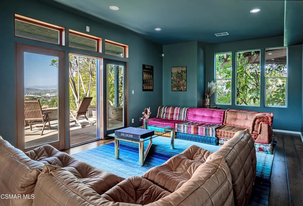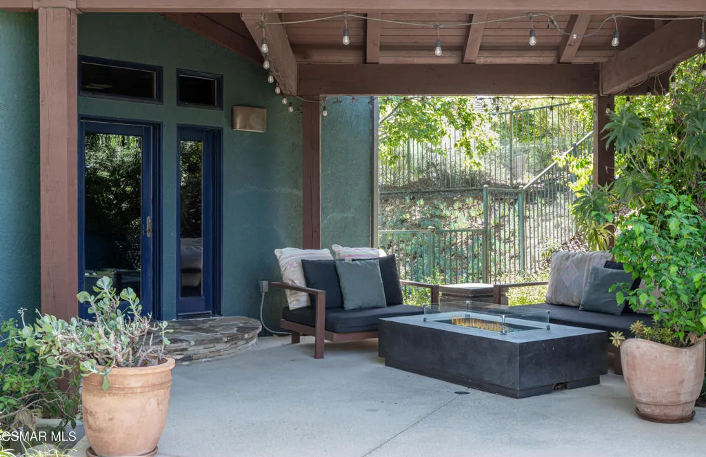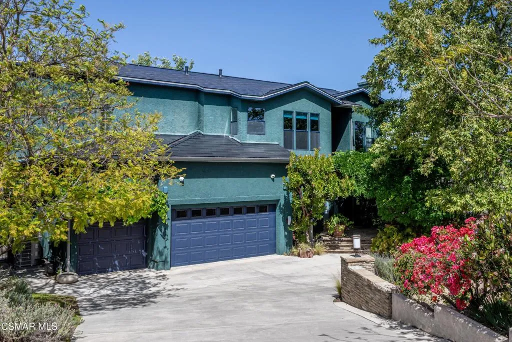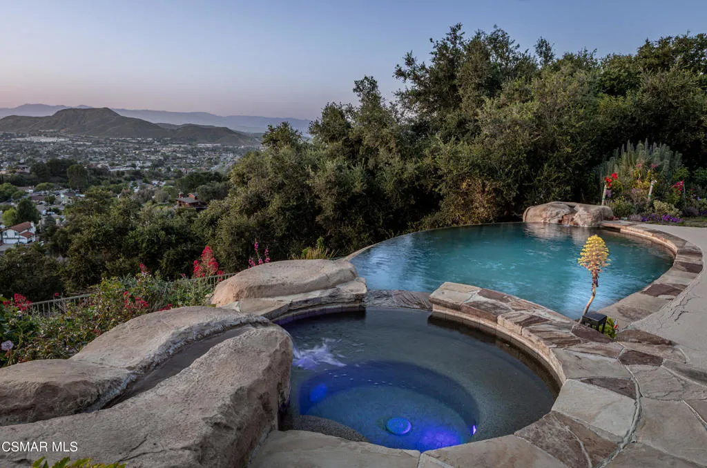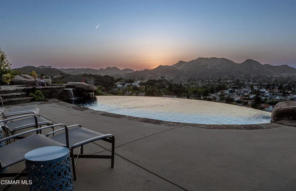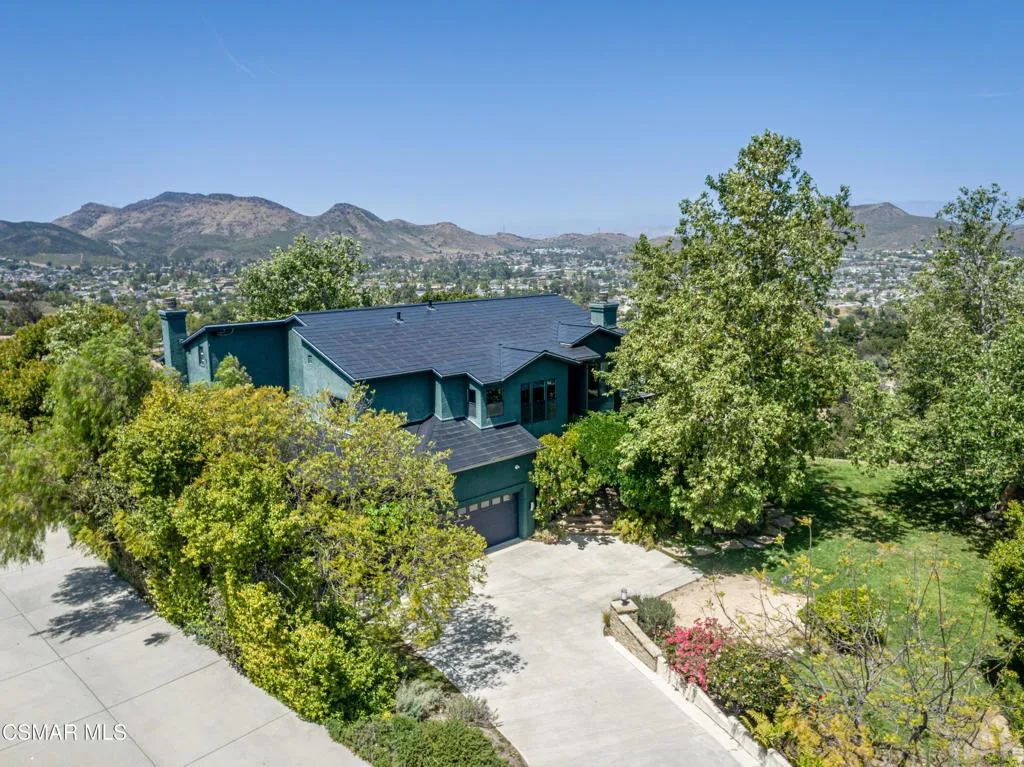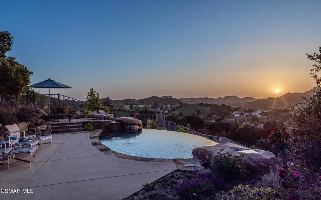 STUNNING custom estate with breathtaking PANORAMIC VIEWS of the Conejo Valley! Perched atop a scenic mountain on over 3 acres, this exceptional property offers nearly 4,000 square feet of refined living space, featuring 4 bedrooms and 4 bathrooms. Step inside to soaring ceilings, hardwood flooring, recessed lighting and an abundance of windows that flood the home with natural light while perfectly framing the incredible vistas. The expansive chef's kitchen is designed for both everyday living and entertaining, showcasing granite countertops, stainless steel appliances, rich maple cabinetry and an oversized center island with seating--all opening seamlessly to the inviting family room with a striking fireplace. The main level also features a gorgeous side deck with mountain views, a dedicated office, formal dining room, guest bathroom, laundry room, pantry and direct access to the 3-car garage, offering both functionality and convenience. Upstairs, the luxurious primary suite is a true retreat, complete with its own fireplace, private balcony capturing sweeping mountain views, a spacious ensuite bathroom with dual vanities and a generous walk-in closet. A secondary bedroom boasts a large glass slider leading to a private balcony with more stunning views, while the additional bedrooms offer ample closet space and picturesque surroundings. Two full guest bathrooms, a brand new infrared sauna for everyday luxury living, an office and a large gym or bonus room complete the upper level. Designed for ultimate indoor-outdoor living, the entertainer's backyard is nothing short of spectacular, featuring a pristine infinity pool, spa, cascading waterfall, fire pit and rose garden, all set against a dramatic natural backdrop. The expansive grounds provide ample space for entertaining/gardening and include a fruit orchard, as well as numerous outdoor amenities, with direct access to scenic community trails. Best yet, the home includes a Tesla roof with three backup batteries, so you can power your home with the sun and never miss a beat in a blackout. This one-of-a-kind view estate offers a rare opportunity to experience serene, elevated living surrounded by nature--yet just minutes from city conveniences. Welcome home!