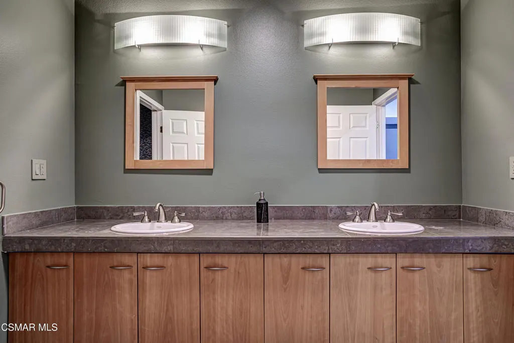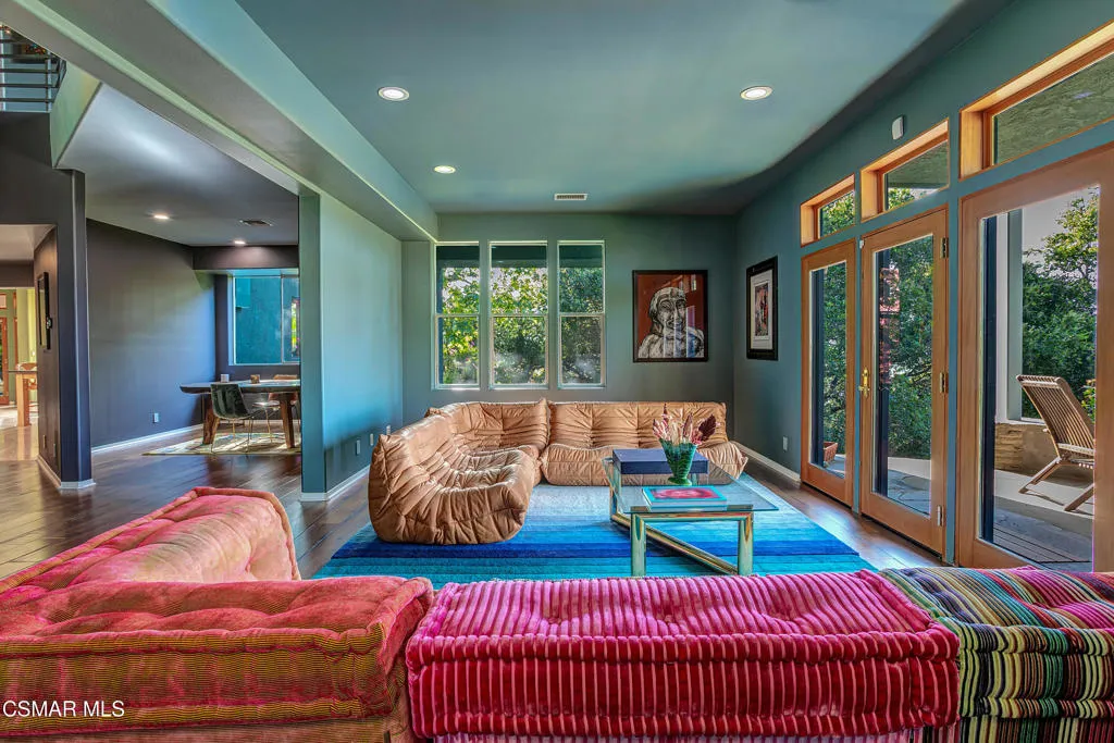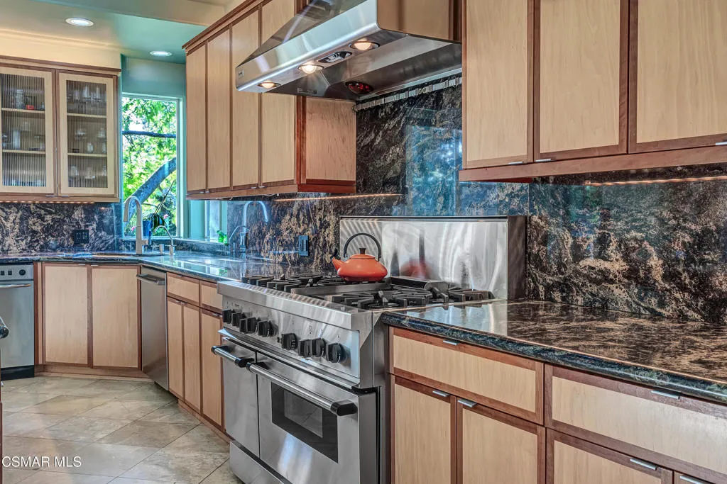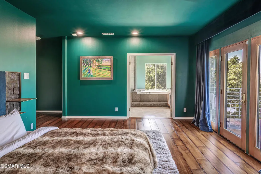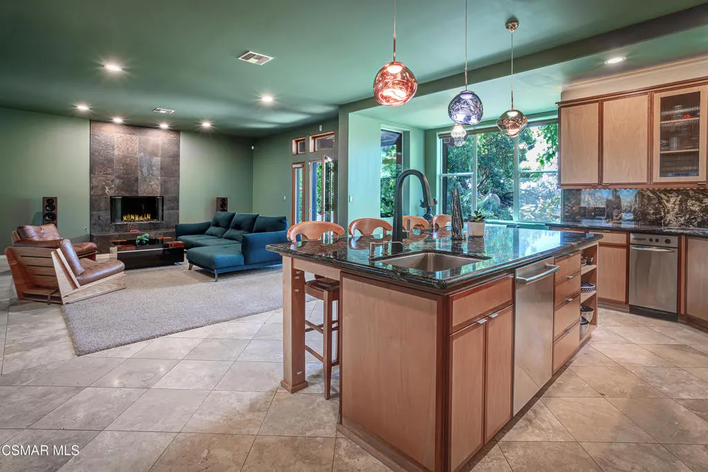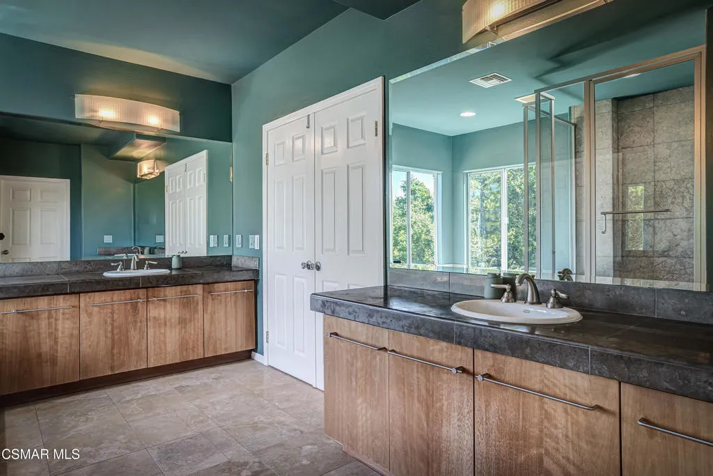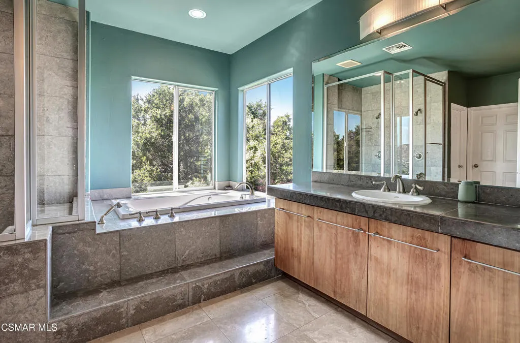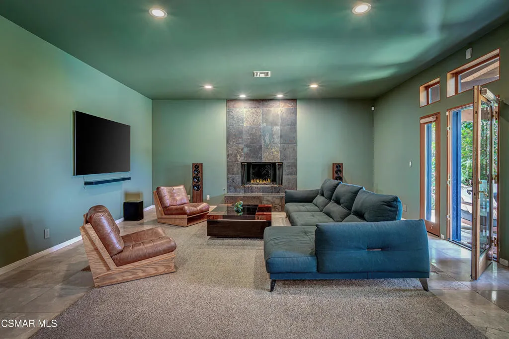 STUNNING custom estate with breathtaking PANORAMIC VIEWS of the Conejo Valley! Perched atop a scenic mountain on over 3 acres, this exceptional property offers nearly 4,000 square feet of refined living space, featuring 4 bedrooms and 4 bathrooms. Step inside to soaring ceilings, hardwood flooring, recessed lighting and an abundance of windows that flood the home with natural light while perfectly framing the incredible vistas. The expansive chef's kitchen is designed for both everyday living and entertaining, showcasing granite countertops, stainless steel appliances, rich maple cabinetry and an oversized center island with seating--all opening seamlessly to the inviting family room with a striking fireplace. The main level also features a gorgeous side deck with mountain views, a dedicated office, formal dining room, guest bathroom, laundry room, pantry and direct access to the 3-car garage, offering both functionality and convenience. Upstairs, the luxurious primary suite is a true retreat, complete with its own fireplace, private balcony capturing sweeping mountain views, a spacious ensuite bathroom with dual vanities and a generous walk-in closet. A secondary bedroom boasts a large glass slider leading to a private balcony with more stunning views, while the additional bedrooms offer ample closet space and picturesque surroundings. Two full guest bathrooms, a brand new infrared sauna for everyday luxury living, an office and a large gym or bonus room complete the upper level. Designed for ultimate indoor-outdoor living, the entertainer's backyard is nothing short of spectacular, featuring a pristine infinity pool, spa, cascading waterfall, fire pit and rose garden, all set against a dramatic natural backdrop. The expansive grounds provide ample space for entertaining/gardening and include a fruit orchard, as well as numerous outdoor amenities, with direct access to scenic community trails. Best yet, the home includes a Tesla roof with three backup batteries, so you can power your home with the sun and never miss a beat in a blackout. This one-of-a-kind view estate offers a rare opportunity to experience serene, elevated living surrounded by nature--yet just minutes from city conveniences. Welcome home!
