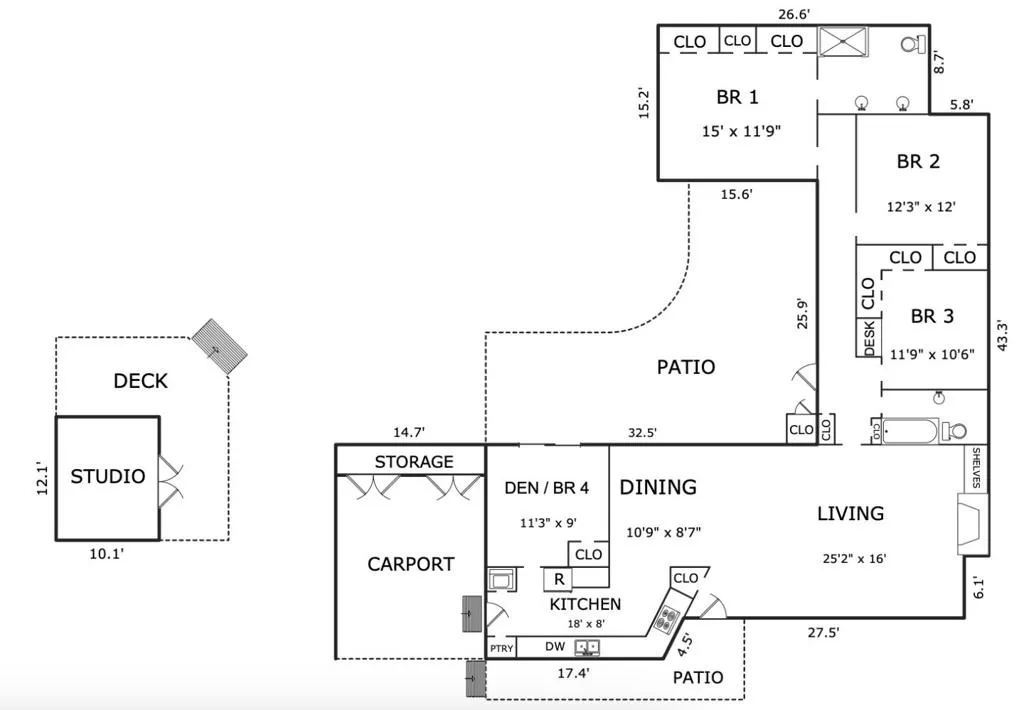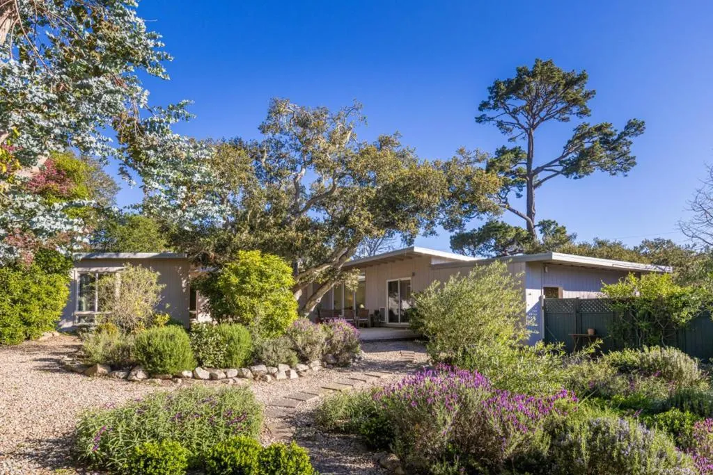 Experience the perfect harmony of iconic design and modern amenities in this single-level mid-century modern gem. Tucked away on a tranquil cul-de-sac, this property offers a "best of both worlds" location in a peaceful park-like setting just minutes from the vibrant energy of downtown Carmel and prestigious Carmel High School. Step inside to a bright, airy living space defined by open-beam ceilings, a classic fireplace, and dining area with floor-to-ceiling windows framing your view of a spacious outdoor patio and meandering garden paths leading to a separate studio. The layout is designed for flexibility, featuring 3 bedrooms plus den that could serve as a 4th bedroom or home office. The two baths have been updated with soothing tones, and new kitchen features quartz countertops, clever abundant storage, & stainless steel appliances. Experience the natural beauty of this 13,000+ sqft fully fenced, beautifully landscaped private oasis from every room. Other features include air conditioning and a wealth of parking options. Whether youre relaxing in the lush backyard or hosting friends in the open-concept living/dining areas, youll feel worlds away from the hustle while remaining at the doorstep of the Peninsulas finest dining and beaches.