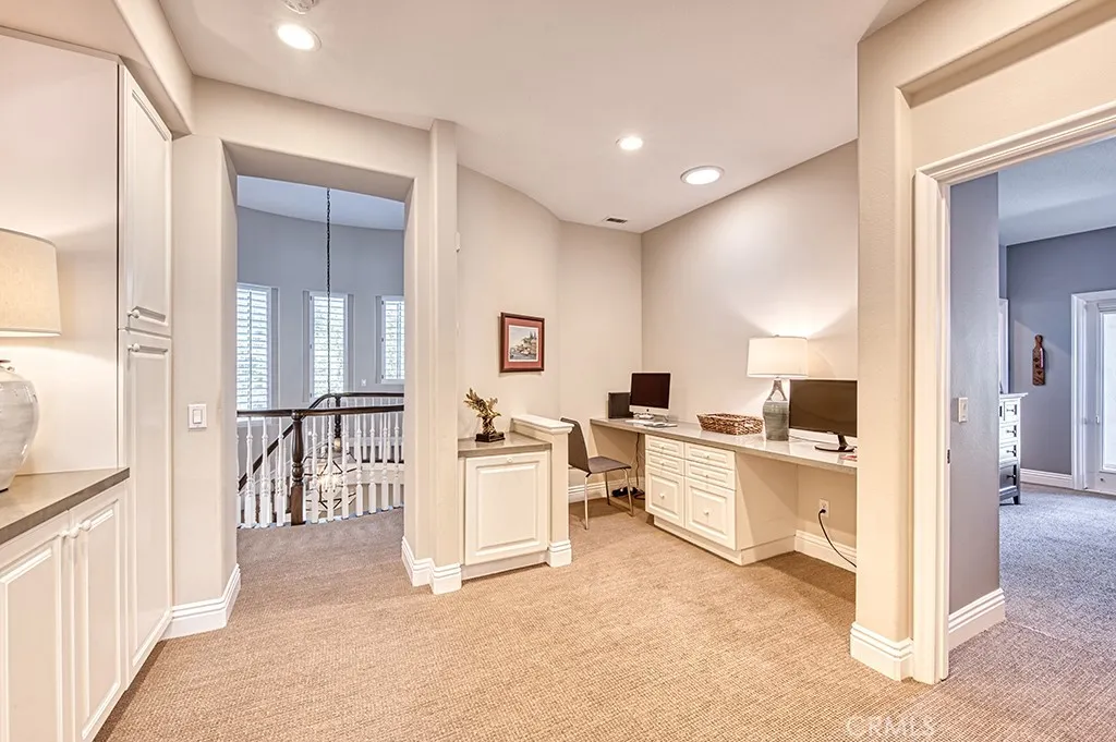 Nestled just beyond the gates of Coto de Caza, this updated corner lot golf course view residence is designed for both functionality and comfort. The grand entryway makes a lasting impression with its soaring two-story foyer, spiral staircase, leaded glass door, and wood plank flooring that extends seamlessly into the kitchen and family room. The formal living room with two story ceilings showcases a beautiful space for special occasions. Connected by by a striking double-sided fireplace, the spacious family rooms sits adjacent to the remodeled kitchen, which is equipped with premium stainless steel appliances, a large island, and a breakfast nook. A formal dining room, guest suite and private office framed by glass double doors and custom-built bookshelves, complete the main level. Upstairs, the luxurious primary suite offers a serene retreat with dual vanities, a spacious walk-in closet, a walk-in shower, a jet-spa tub, a cozy sitting area, and a private balcony showcasing breathtaking views of Coto's south golf course, complete with a picturesque pond. Down the hall are two additional en-suite bedrooms connected by a shared study space with built-in desks. The backyard is great for entertaining and showcases a desirable southeast exposure with a sparkling swimming pool, a sun deck and a built-in BBQ island. Situated on a coveted corner lot along a single-loaded street, this home benefits from an adjacent recreational park and an open greenbelt across the way, creating an extended outdoor space perfect for relaxation and play. Experience the best of Coto de Caza, where premier living meets award-winning schools, a world-class Golf & Racquet Club, scenic sports parks, and easy access to hiking, biking, and equestrian trails. No Mello roos=low tax rate.