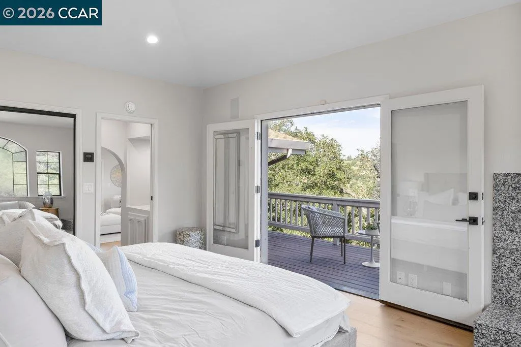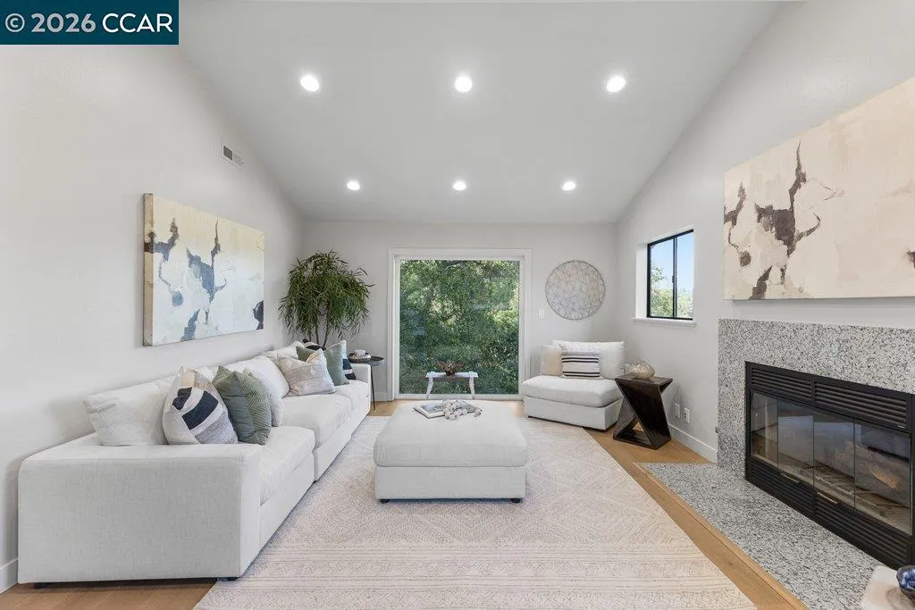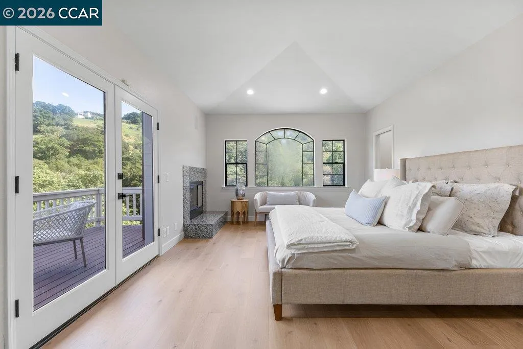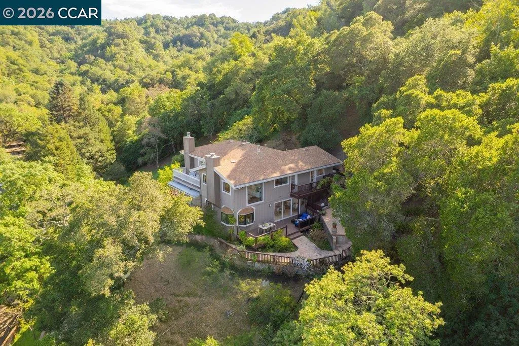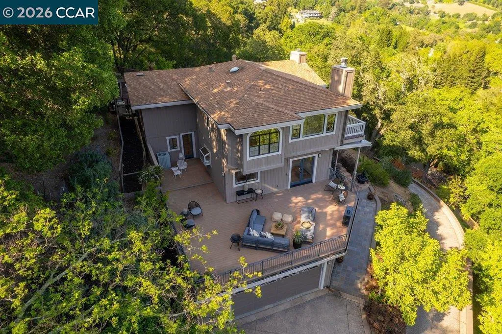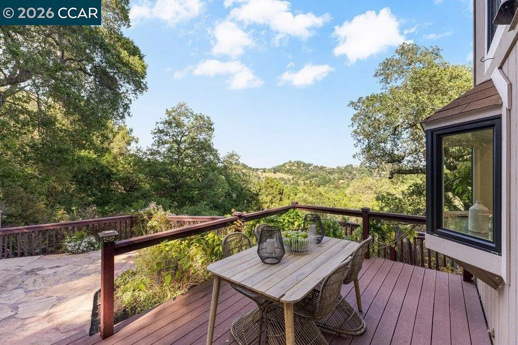 Enjoy breathtaking views from nearly every room in this beautifully updated 4-bedroom, 3-bath home. Flooded with natural light and surrounded by scenic beauty, this home offers a superb blend of luxury and serenity. Property features include: engineered hardwood floors, fresh interior paint, and custom lighting throughout. The main level offers a bright kitchen that opens to a spacious dining and living area, with sliding doors leading to multiple tiered decks—wonderful for seamless indoor-outdoor living. A separate living room with an expansive deck provides an ideal setting for entertaining or relaxing. This level also includes a bedroom, full bath, private office, and a walk-in pantry. Upstairs, you will enjoy a generous family room with a fireplace showcasing stunning treetop views. The spacious primary suite features a walk-in closet and private balcony, while two additional bedrooms provide flexibility for guests or work-from-home needs. Multiple decks create inviting spaces for dining, entertaining, play, or quiet retreat. The property is enhanced by mature landscaping, a dog run, and a long, private, estate-like driveway. Ideally located in the coveted Springhill neighborhood, just minutes from hiking trails, top-rated Lafayette schools, downtown, BART, and highways.