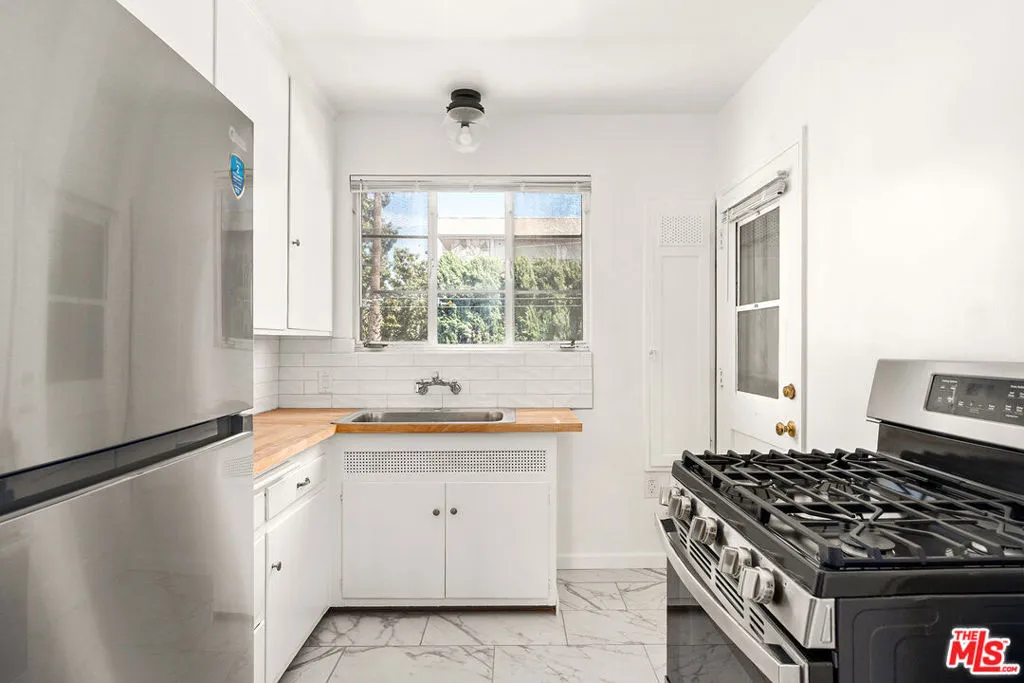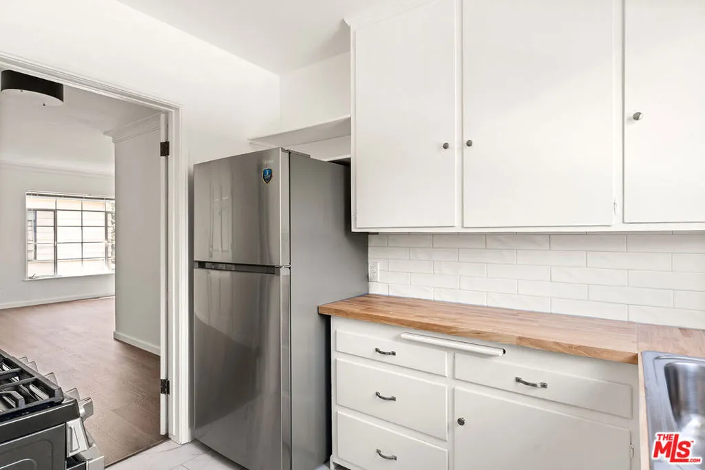 This bright upper-level 1-bedroom, 1-bath residence is set in a charming Beverly Hills courtyard building, just moments from the Four Seasons Hotel and Robertson Blvd. Filled with natural light, the home showcases crown molding, updated flooring, and stylish modern lighting throughout. The spacious living area opens to a cozy dining nook adjacent to the kitchen, which features generous cabinet storage and a convenient secondary entrance for added functionality. The bathroom has been tastefully refreshed with a sleek vanity and a full tub/shower combination. Additional highlights include one assigned parking space, on-site laundry, and water and trash included. Ideally situated near Cedars-Sinai, the Beverly Center, The Ivy, Alfred Coffee, and some of LA's best shopping, dining, and entertainment.