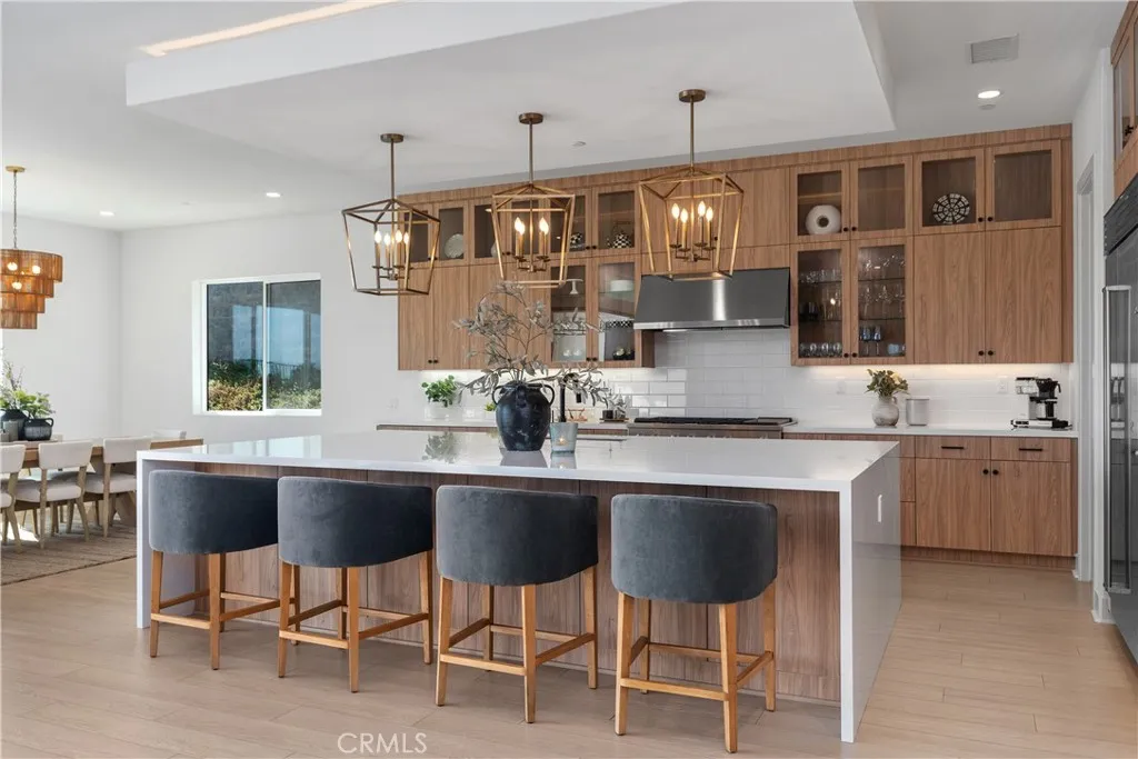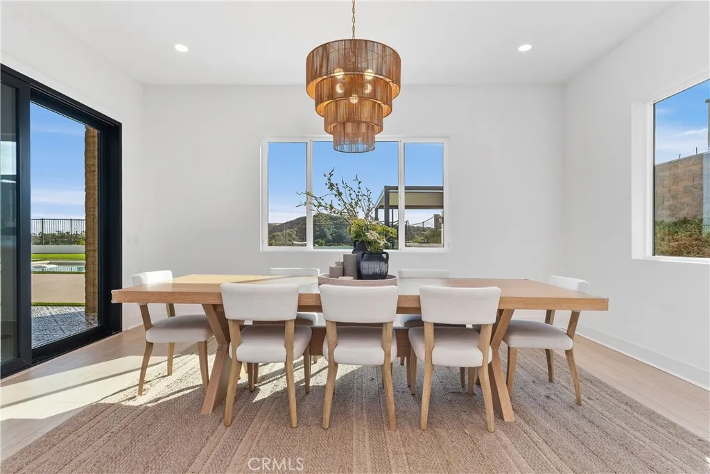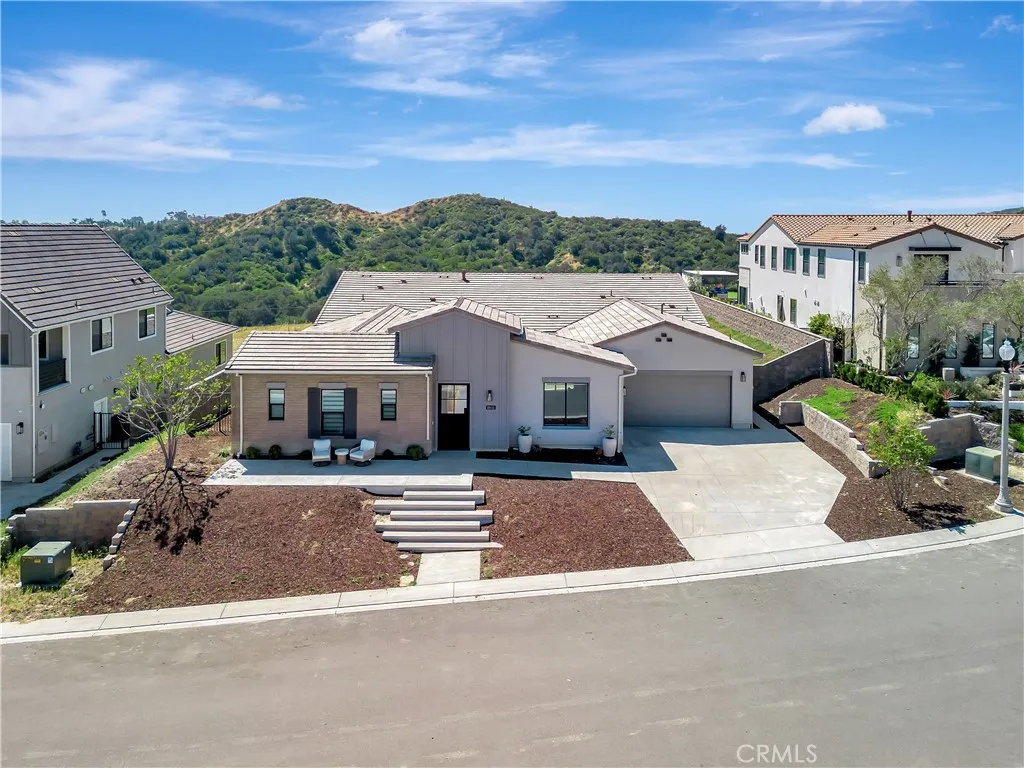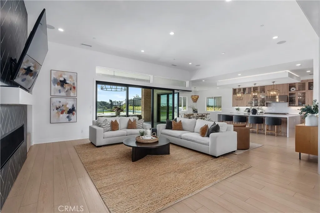 A rare offering of refined, single-story luxury, this exceptional estate seamlessly blends modern design with effortless California elegance—set on an expansive 18,336 square foot lot within the exclusive gated enclave of Saddle Crest, with breathtaking panoramic views of Silverado Canyon and Saddleback Valley. Thoughtfully curated with elevated finishes throughout, the home features four spacious bedrooms, four bathrooms, and a versatile office or flex space. Wide-plank flooring, designer LED lighting, and sophisticated details create a warm yet contemporary ambiance. At the heart of the home, the chef’s kitchen is both stunning and functional—appointed with professional-grade Café appliances, a 6-burner range with grill and griddle, a built-in Sub-Zero refrigerator, and a dramatic quartz waterfall island. The space opens seamlessly to the expansive family room, where a statement fireplace, surround sound, and seamless 90-degree glass doors that open to the outdoors. The true centerpiece of this property is the resort-caliber backyard—an extraordinary private retreat designed for both elevated entertaining and everyday enjoyment. Featuring a sparkling pool, a luxury outdoor BBQ and bar, and an inviting firepit lounge, the space is complemented by a rare private pickleball court—offering a one-of-a-kind lifestyle experience seldom found in Orange County. Whether hosting gatherings or enjoying quiet evenings under the stars, this backyard delivers an unmatched blend of recreation, relaxation, and resort-style living. The primary suite offers a serene escape with direct access to the outdoors, sweeping views, and a spa-inspired bath with soaking tub, rain shower, dual vanities, and a spacious walk-in closet. Secondary bedrooms are generously sized, including an en-suite. Additional highlights include owned solar with battery storage, tankless water heaters, EV prewire, and an oversized three-car garage, including an option for a gym. A rare opportunity to own a premier single-story estate—your own private resort with sweeping views, privacy, and exceptional amenities.
