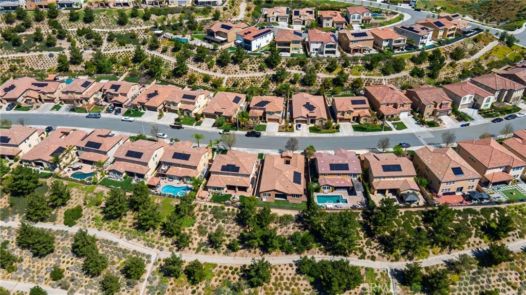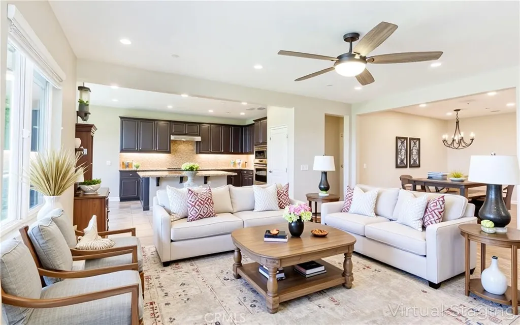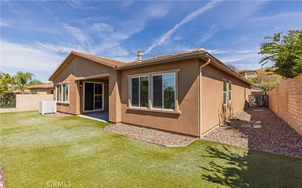Welcome to this beautifully maintained single-story home offering 3 bedrooms, 2 bathrooms, and approximately 1,964 square feet of thoughtfully designed living space. Featuring fully paid-off, integrated solar roof tiles, this home combines modern efficiency with everyday comfort—all set against a backdrop of breathtaking views and a low-maintenance landscape. Step inside to a light-filled, open floor plan enhanced by elegant tile flooring throughout. A versatile formal living room at the entry provides the perfect space for entertaining or can easily function as a formal dining area. The spacious family room, located just off the kitchen, is designed for both relaxation and gathering, complete with recessed lighting, ceiling fans, and large picture windows that frame the stunning backyard views. The kitchen is both stylish and functional, offering granite countertops, custom wood cabinetry, stainless steel appliances, and a charming eat-in dining area—perfect for casual meals and morning coffee. All three bedrooms are generously sized, including the inviting primary suite featuring a walk-in closet and a comfortable, private retreat feel. Adding to the home’s functionality is a well-appointed indoor laundry room complete with its own sink and faucet, providing convenience for daily tasks. From here, enjoy direct access to the expansive three-car garage, which is equipped with power for electric vehicle charging as well as a modern tankless water heater—delivering both efficiency and forward-thinking upgrades. Step outside to your own backyard oasis, designed for year-round enjoyment. A covered “rain or shine” patio with an outdoor fireplace creates the ideal setting for entertaining or unwinding. The yard is beautifully finished with artificial turf, native plants, and rock landscaping, providing both visual appeal and easy upkeep. The expansive view from the backyard truly sets this home apart, offering a peaceful and scenic backdrop. Ideally located within a centrally situated community, residents enjoy access to a well-appointed pool and spa complex featuring lounge areas, barbecue facilities, and convenient amenities—perfect for enjoying sunny days with family and friends. This is a rare opportunity to own a turn-key home that blends comfort, efficiency, and exceptional outdoor living.