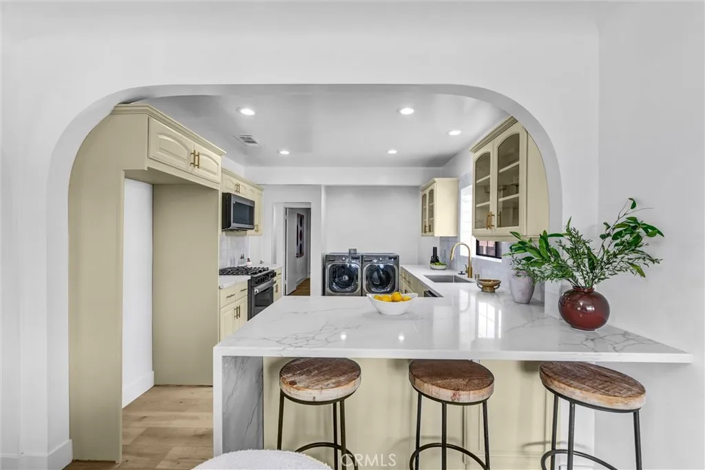 Remodeled 5 bed, 4 bath home in a prime LA location near Pasadena and Alhambra. Flexible floor plan with upstairs primary suite and 3 bedrooms on the main level, including one ideal for an office and one with en-suite bath. Detached converted garage serves as a private guest unit with full kitchen, bath, and closets—perfect for extended family or rental income. Both units offer washer/dryer hookups. Updated kitchen with new appliances, quartz counters, and bar seating opens to living and dining areas. New vinyl flooring throughout and abundant natural light. Fireplace in living room.
