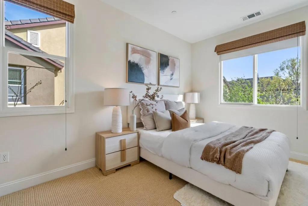 Centrally located in Sunnyvale, this elegant Toll Brothers end-unit townhome offers an exceptional blend of space, natural light, and modern luxury. This 3-bedroom, 2.5-bath residence spans 1,649 square feet and features an expansive open-concept main level with soaring ceilings, creating a bright and inviting atmosphere. The gourmet kitchen is designed for both everyday living and entertaining, complete with a gas range, center island, and premium stainless-steel appliances. Upstairs, the private retreat includes generous sized bedrooms and a spacious primary suite with a walk-in closet and a spa-inspired bathroom. Additional highlights include whole house customized blinds, beautiful hardwood flooring, recess lights throughout and a side-by-side two-car garage for convenience and storage. Enjoy a luxury lifestyle just steps from the tennis courts and water park at Seven Seas Park, and only minutes from Silicon Valleys major tech campuses, including Apple, Google, Amazon, and Meta. Dont miss the opportunity to call this beautiful property your home.
