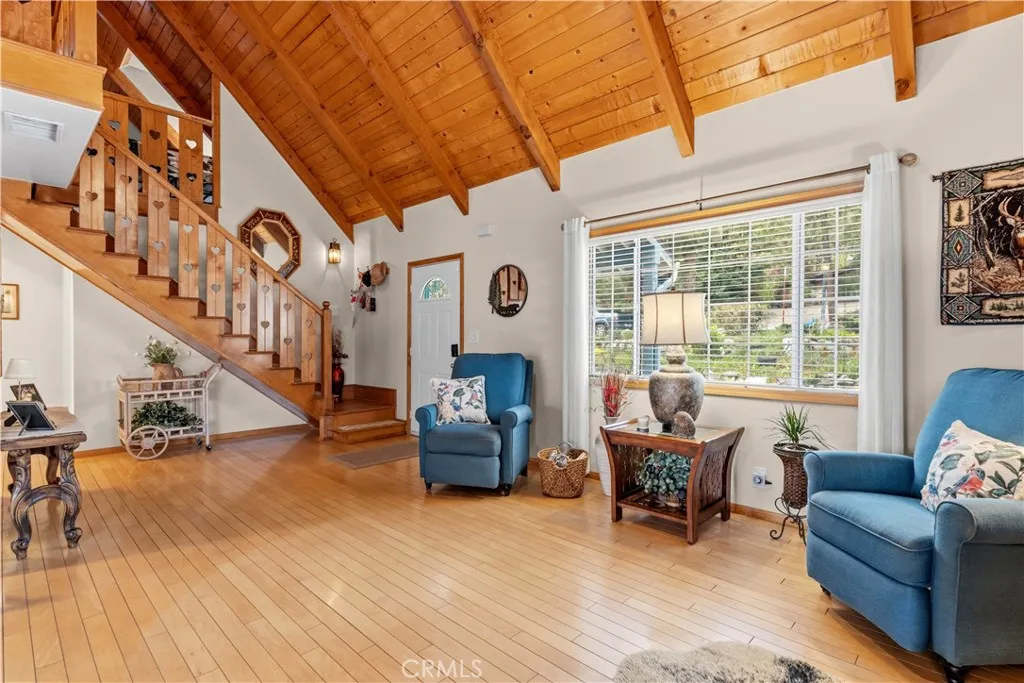Nestled in the scenic San Gabriel Mountains, this exceptional home offers a rare blend of peaceful mountain living and welcoming small-town charm. Enjoy an easy drive home—free of winding switchbacks—where neighbors greet you with a friendly wave and community spirit thrives. Local conveniences include charming churches, a neighborhood market, post office, library, and a helpful, community-focused hardware store. Situated on sought-after Chaumont Drive, this meticulously maintained residence features approximately 2,216 square feet of thoughtfully updated living space. Inside, you’ll find carefully curated finishes, an inviting living room anchored by a beautiful brick fireplace with gas logs and a glass enclosure, and an open-beam wood ceiling that adds warmth and character. A striking wall of illuminated glass bookcases with a built-in faux fireplace creates a cozy and elegant focal point. The private upstairs suite comfortably accommodates 1–4 guests, making it perfect for extended family or visitors. Additional highlights include central heating and air conditioning, a full-home fire sprinkler system for added peace of mind, and instant hot water in the kitchen. Outdoors, the property is enhanced by extensive lighting and includes two large storage buildings, both set on permanent foundations. Come, visit and be charmed.