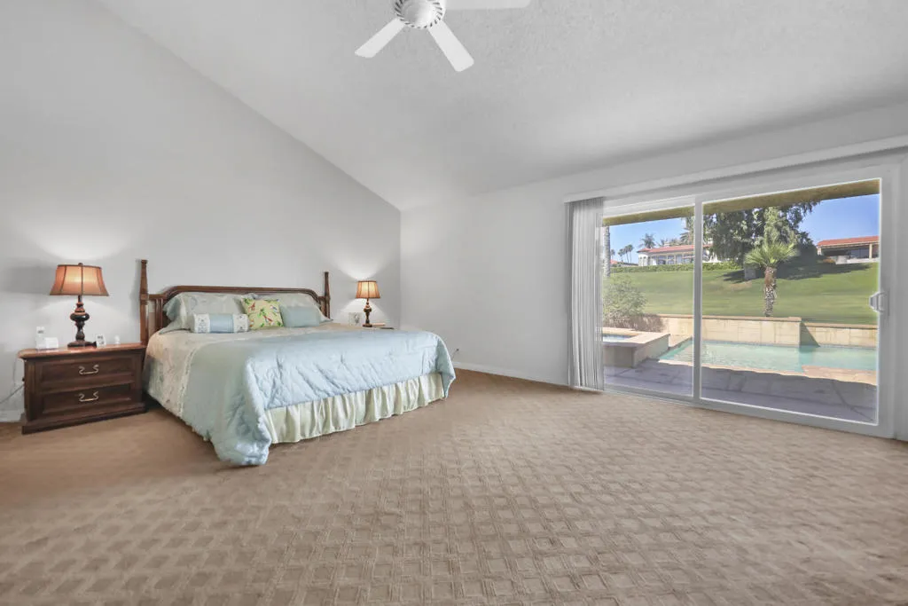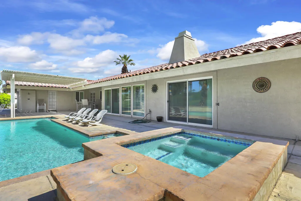 Custom home on a 12,197 square foot lot ON the golf course with mountain views in the exclusive gated community of Bermuda Dunes Country Club. This 2,760 sq.ft. home has three bedrooms, each with their own bathroom. Primary suite with sliders to the pool area is spacious with private bathroom with separate shower and soaking tub, plus French doors to a side patio. There is a formal living room with a fireplace and dining room; the kitchen with slab granite counters is open to a separate family room. The third bedroom, which is adjacent to the family room, has a 3/4 bathroom with a door to the pool area. The sparkling pool/spa has views of the 2nd fairway and mountains with a convenient alumawood patio cover on one side for those who prefer a little shade!! The direct access garage houses a tankless water heater and can accommodate two cars with an area for a golf cart which has access to a side paved area which leads directly onto the golf course. The low HOA of only $214 a month includes cable TV and internet with Spectrum as well as 24-hour guard gated security. IID for lower electric.
