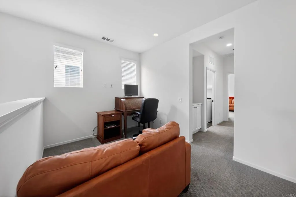 Welcome to Harmony Grove Village, where comfort, style, and community come together. Built in 2017 and offered for the first time, this beautifully maintained two-story home is lightly lived in and truly move-in ready. Situated on a premium corner lot, you’ll enjoy added privacy along with close proximity to Village Park is just a short stroll away. Designed with both function and modern living in mind, the home features a formal entry that opens into an inviting living space. The chef’s kitchen is a standout, showcasing a granite island with seating for three, upgraded appliances, and thoughtful builder enhancements throughout. Step outside to an oversized, low maintenance backyard complete with a spacious patio, built-in planter beds, and drought-tolerant landscaping which is perfect for relaxing or entertaining year-round. The flexible floor plan includes a convenient downstairs bedroom and full bath, ideal for guests or multigenerational living. Upstairs, the primary suite is positioned at the front of the home, enjoying northeast exposure for natural light and energy efficiency. The en-suite bath offers dual sinks, an expansive vanity, soaking tub, separate shower, and a generous walk-in closet. A versatile loft separates the primary suite from two additional bedrooms, creating a functional layout with added privacy. The secondary bath is thoughtfully designed with a separate sink area and water closet, and the upstairs laundry room adds everyday convenience. Residents of Harmony Grove Village enjoy scenic walking trails, sidewalks, and access to two community parks. Ideally located near shopping, dining, and easy freeway access to both I-15 and Hwy 78, this home offers the perfect balance of tranquility and connectivity. Don’t miss this rare opportunity to own in one of Escondido’s most desirable communities.