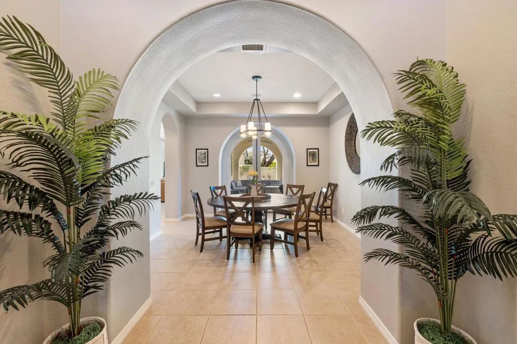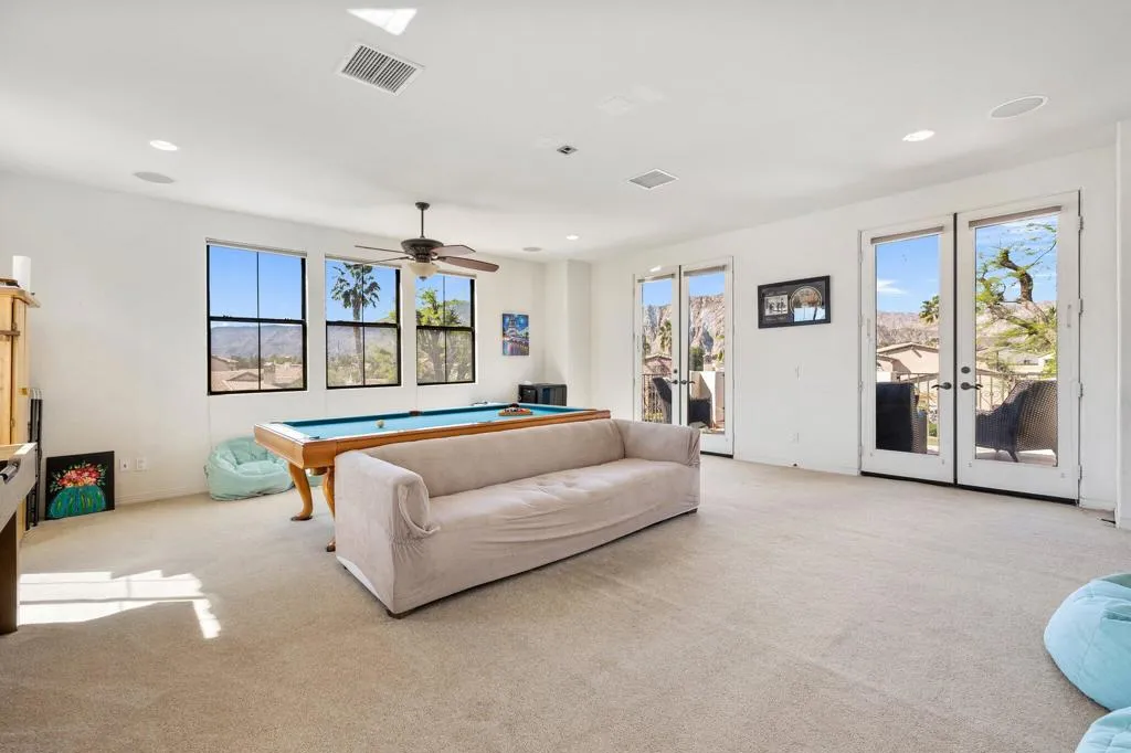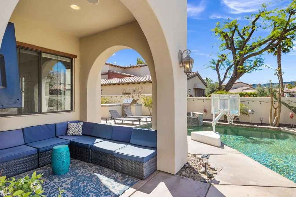 Discover the largest floorplan in the exclusive La Cantera community--an exquisite 4-bedroom, 4-bathroom residence situated on an oversized corner lot with breathtaking southern mountain views. This beautifully designed home offers a bit of Mediterranean charm with arched details and large neutral tile running throughout, offering an unparalleled desert retreat. Step inside to find rich wood cabinetry, granite countertops with a matching backsplash, and a walk-in pantry in the chef's kitchen, equipped with high-end Thermador stainless steel appliances. Entertaining is effortless with a wet bar and an inviting open-concept layout. The main-floor primary suite is a private oasis featuring dual vanities, a separate tub and shower, with a secondary main floor bedroom including a private en suite- great for a home office or guest room. Upstairs, a spacious loft/bonus room offers a large screen tv for movie nights and leads to a private deck, where you can take in the panoramic mountain views from two sets of french doors. 2 additional upstairs bedrooms include mirrored closet doors, newer carpeting and share a spacious bathroom with dual vanities. Outside, the gorgeous rear yard is a true entertainer's paradise, complete with a pool and spa, firepit, and a built-in BBQ island--perfect for relaxing under the desert sky. Located just minutes from world-class golf, dining, and shopping, this La Cantera gem offers the best of La Quinta living!