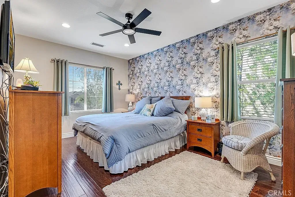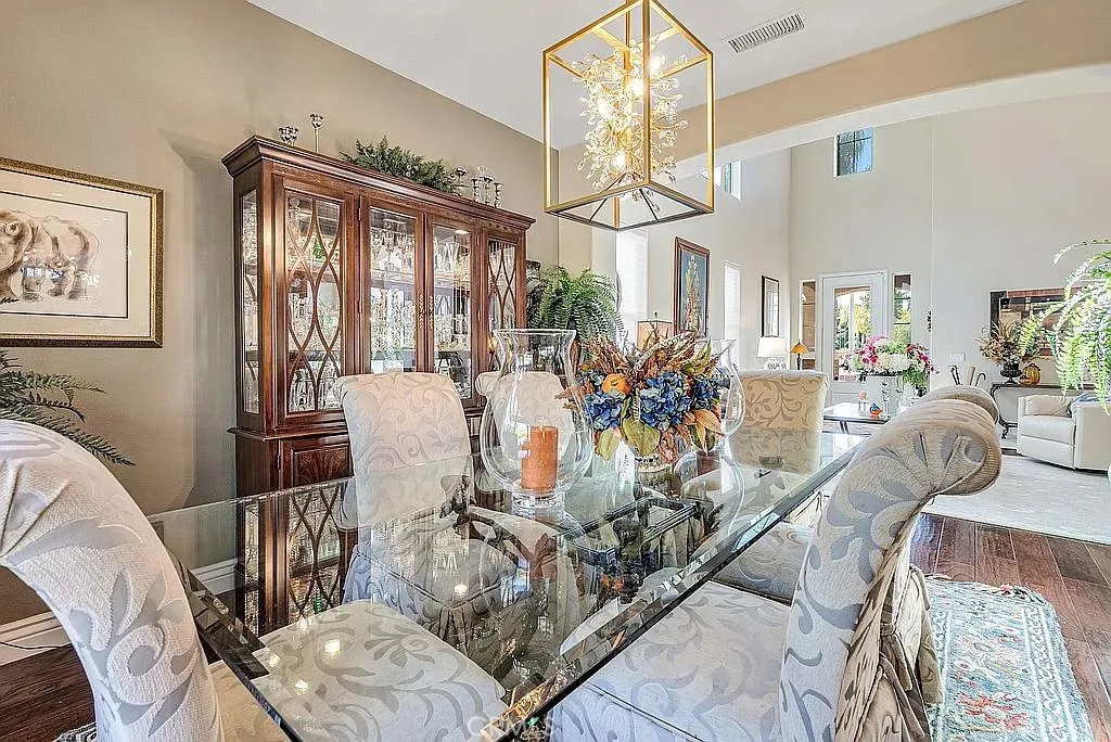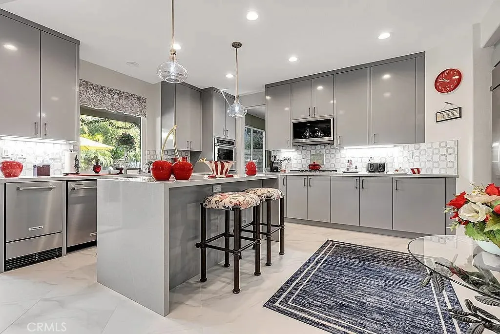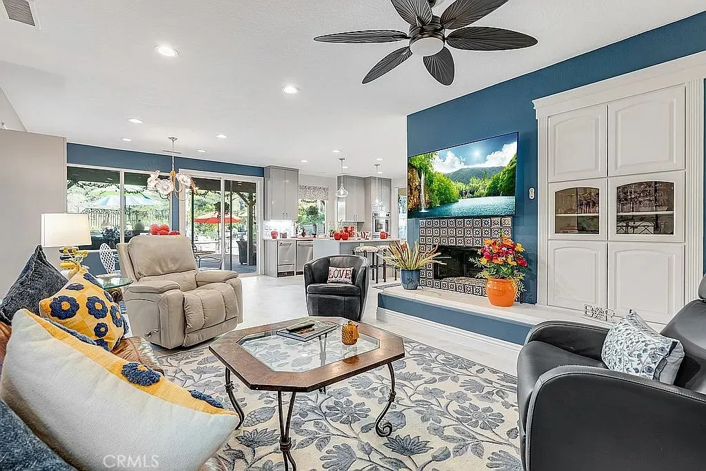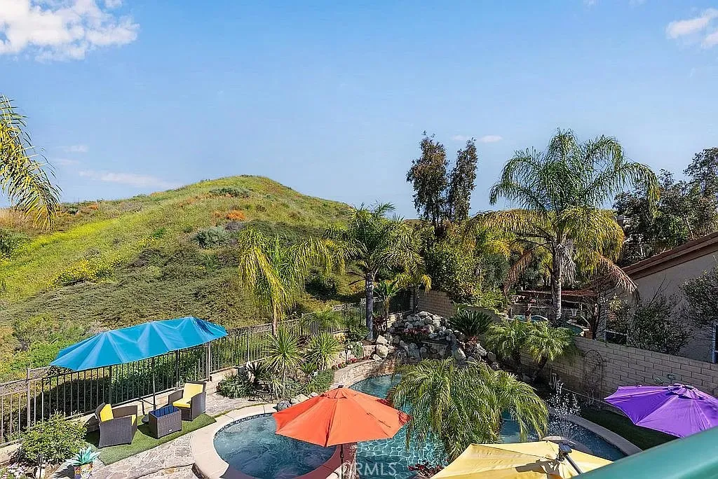 A half acre lot located at the end of a cul-de-sac features a tropical grotto pool setting with water spouts, waterfalls, and fountain. A ten person spa provides party fun. Privacy is the key word to describe this home as a picturesque hill provides backyard privacy. Exterior side walkway is perfect for guests arrival when entertaining. Large Master bedroom is enhanced by French door opening onto a 300 sf deck overlooking pool and private hillside. Master Bedroom with Bidet. Two fully built out walk in closets lead you to your large bath with spa tub, new glass enclosed shower, and remote controlled window coverings. Your kitchen was taken down to the studs in 2025 and designed to work with any color you choose as it has a blend of various shades of cool grays and cream in countertops and cabinets that extend clear to the ceiling. New soft white porcelain floors throughout kitchen, family room, laundry and hallways. Kitchen offers an island and separate informal eating area with designer chandelier. Family room has new window shades and fireplace tile. Home has two full and two half baths, one half bath serves the pool with outside entry, no wet feet in your home. Enjoy a private, formal dining room with gold and crystal chandelier. Fourth large bedroom offers wall to wall built ins for alternate choice as office. Flooring: Porcelain, Wood throughout. Roof: Concrete. Exterior: Stucco, Wood. Fireplace in Family Room. Deck: 300 sq. ft., glass railing, off master bedroom, beautiful pool/hillside view. Garage: 3 bay, built ins, one bay used for storage with shelving at this time. Landscaping: Full yard, professional, tropical. Pool: Concrete Tile, three waterfalls, two spouts, 1 Fountain, tropically landscaped. Solar Electricity, Excellent 25 year fixed lease. Large patio, slate flooring, fire pit. Barbecue with fridge, sink, and sitting bar. Landscape Lighting. Exterior Motion Security Lighting. Wired for interior security system, ADT at present. Included in This Sale: Kitchen Aid Refrigerator, Ice Maker and Double Oven, Garbage Disposal, LG Stove top and Range Hood plus Microwave, Washer/Dryer Pool equipment.