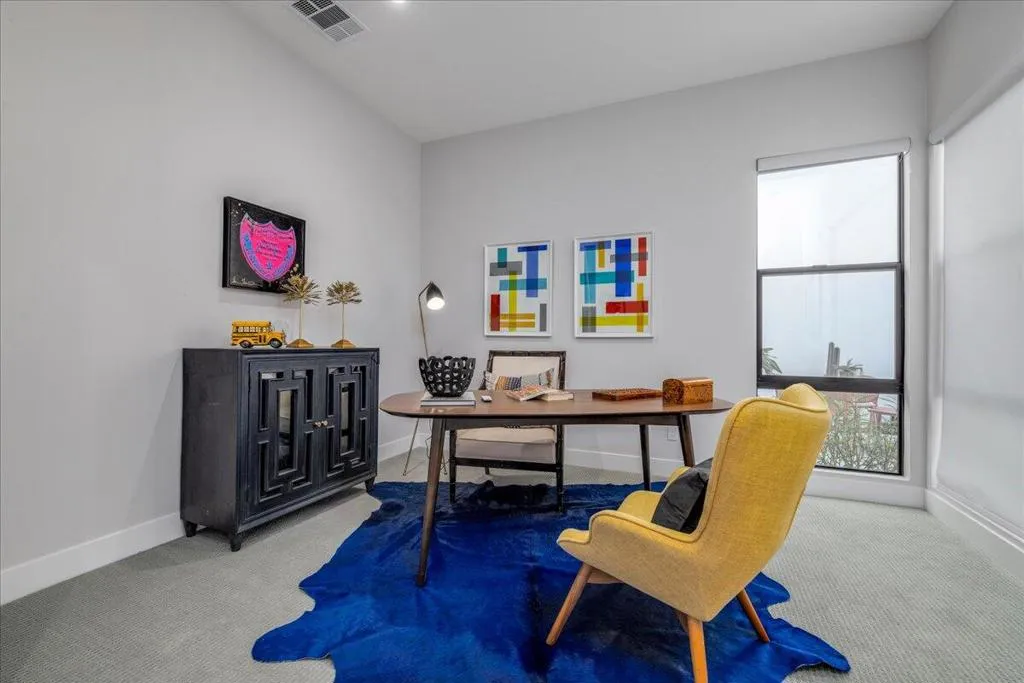 Iconic mid-century design meets modern luxury in The Vue, a gated enclave in the heart of central Palm Springs. Completed in 2023, this single-story architectural residence offers refined design, seamless indoor-outdoor living, and timeless desert appeal. The home's striking butterfly roof sets the tone, while an open-concept layout is flooded with natural light from expansive clerestory windows. Thoughtfully designed for both entertaining and everyday comfort, the residence features 2 spacious bedrooms, 2.5 bathrooms, and a versatile office/den.The chef's kitchen commands attention with premium Thermador appliances, quartz countertops, and a dramatic waterfall island, flowing effortlessly into the living area for a clean, contemporary aesthetic. Dual multi-slide glass doors open to a private backyard retreat with a covered patio ideal for dining and relaxation. A south-facing cocktail pool with Pebble Tec finish and three cascading waterfalls delivers a true resort-style experience, complemented by stunning views of the San Jacinto Mountains. Notable upgrades include built-in speakers with Sonos system, custom electric blinds throughout, a hardwired alarm system, and owned solar panels, blending luxury with energy efficiency. Just minutes from Palm Springs' top restaurants, shopping, and iconic hotels, this is a rare opportunity to own a nearly new architectural home in one of the city's most desirable locations.