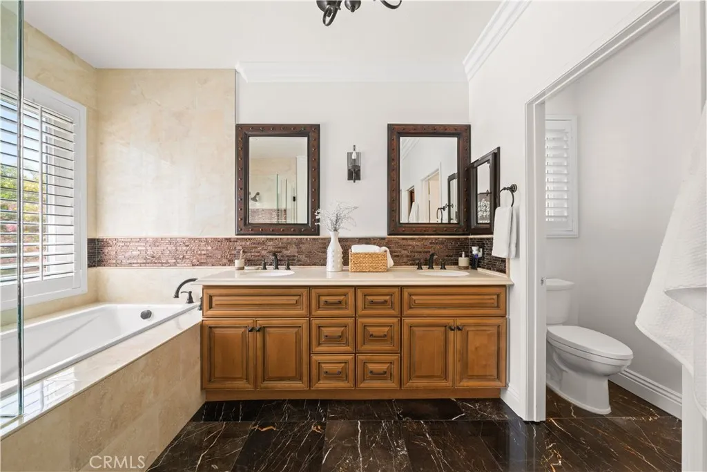 Location! Very Well Maintained! Upgraded! Located in the gated Diamond Valley community, this beautiful home offers 5 bedrooms, 3 bathrooms (1 bedroom 1 bathroom downstairs), 3-car garage. Enter through double-door with glass panels into a bright living room with high ceilings and large windows, creating an open and airy feel. The formal dining room with custom chandelier. The gourmet kitchen with granite counter tops, center island, upgraded cabinets, stainless-steel appliances, and walk-in pantry. The layout flows into the family room with a fireplace and a media center. One bedroom and one full bathroom are conveniently located on the first floor. Upstairs offers four additional bedrooms and two bathrooms. The primary suite includes a walk-in closet with organizes, retreat area and overlooks the spacious backyard. Primary bathroom was remodeled with two sinks, bathtub, separate shower with frameless glass enclosures, and marble flooring. Three secondary bedrooms provide flexibility, with one suitable as a bonus or entertainment room. Other features include, fresh interior paint, wood shutters, crown moldings, recessed lights, ceiling fans, laundry room with sink, two A/C units, epoxy paint flooring garage. The backyard is generously sized with extensive concrete hardscape and a large aluminum patio cover, designed for low maintenance and practical outdoor use, professionally landscaped with palm trees and flowers. Well maintained community with tennis court, BBQ area, and park. Conveniently located near Grand Avenue park, English Springs Park, shopping, dining, and city facilities. Blue Ribbon Award Country Springs Elementary. California Distinguished Canyon Hill Junior High and Ayala High.