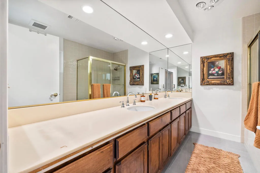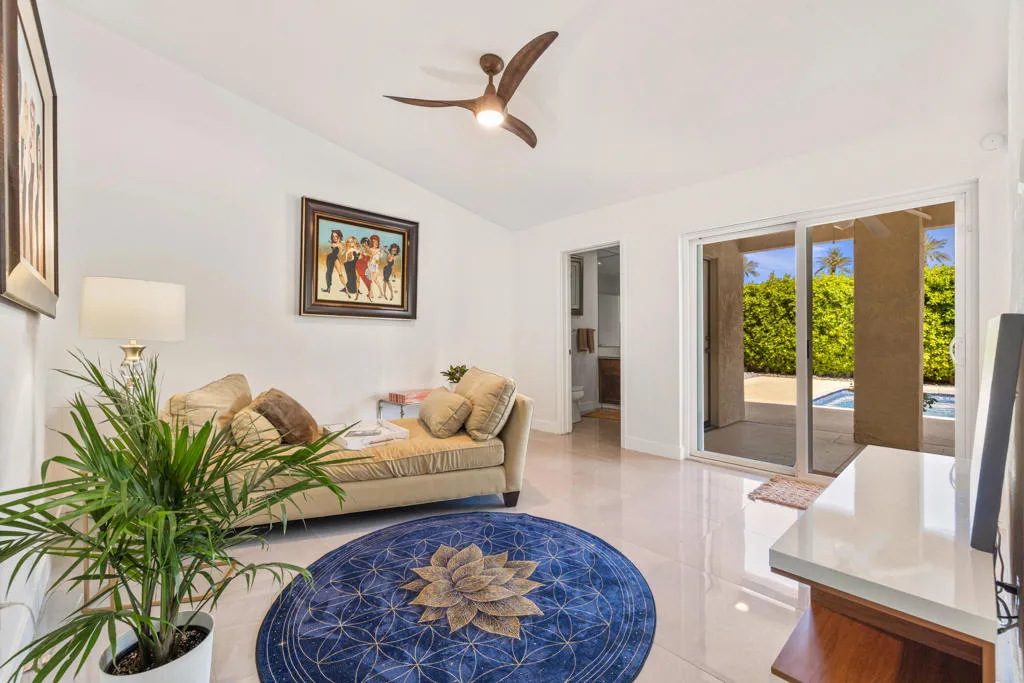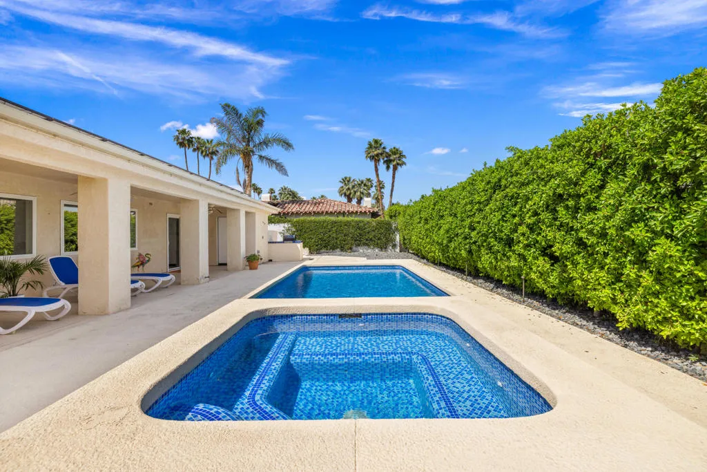 Set within one of Indian Wells' most desirable neighborhoods, this beautifully maintained furnished residence offers 2,124 square feet, 3 bedrooms, 2.5 baths, and a 2-car plus golf cart garage on an expansive 10,019 square foot lot. Ideally situated near shopping, dining, and the exceptional benefits enjoyed by Indian Wells residents, this inviting home offers comfort, space, and an effortless desert lifestyle. A newly landscaped south-facing courtyard and double-door entry create a gracious sense of arrival. Inside, the spacious great room is enhanced by high ceilings, a handsome stucco fireplace, and beautiful sightlines drawing the eye to the pool and outdoor spaces. The floor plan also features a formal dining area and a versatile bonus room, ideal for a library, office, or fitness space. Designed for seamless indoor-outdoor living, the backyard showcases a large rectangular, blue-tiled pool, jet spa, covered patio, extended patio spaces, and a built-in barbecue--perfect for entertaining or relaxation. The north-facing rear yard offers privacy, while the front courtyard captures south mountain views, The kitchen features granite countertops and backsplash, a center island with storage, stainless steel appliances, a Viking cooktop, large refrigerator, and updated fixtures. The private primary suite offers a high ceiling, large walk-in closet, dual vanity, soaking tub, spacious walk-in shower, and sliders opening directly to the pool and spa. One guest bedroom enjoys a beautiful south-facing mountain view and hard wood floors. Additional highlights include new paid solar, new HVAC and Lennox thermostat, new modern ceiling fans, new glazed gray porcelain tile flooring, plush carpet in select bedrooms, generous built-in storage, and no HOA.