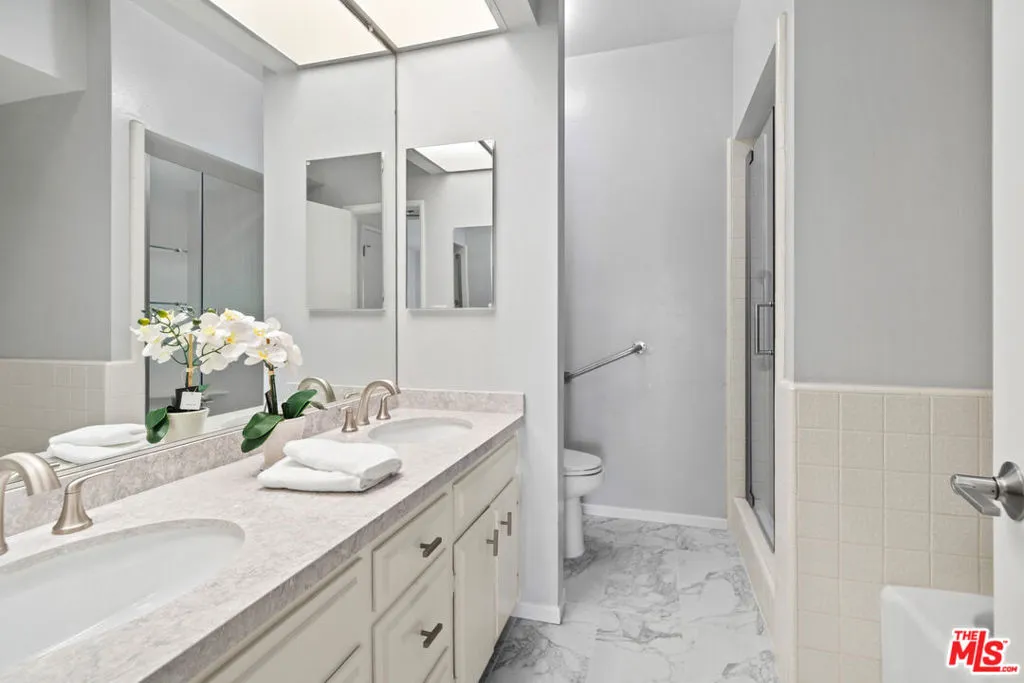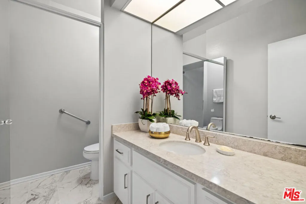 This stunning, newly renovated top-floor condo offers 2 bedrooms and 2 bathrooms, filled with abundant natural light and featuring treetop city views, including views of the Hollywood Sign, from the private balcony. The home boasts vaulted ceilings, a built-in office space ideal for working from home, and a spacious primary suite with en-suite bathroom and walk-in closet. Additional highlights include an in-unit washer and dryer, secure building and mail room, and convenient tandem two-car parking in a gated garage. Residents enjoy access to a heated pool and other amenities, all just blocks from Beverly Hills shopping, dining, parks, and entertainment and only 1 block from Roxbury Park. a small pet may be considered, no smoking. Excellent credit required. Deposit amount is negotiable. Available immediately.