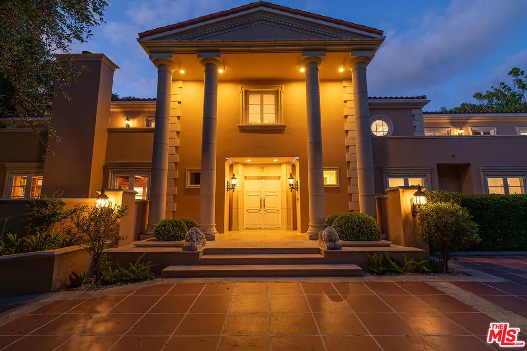 Perched above a long gated driveway, this Grand Mediterranean sits on over an acre of gorgeous resort-like grounds with night lit tennis court. Step inside double doors to discover impressive 2-story entry with skylights and marbled staircase. Enormous stepdown living room highlighted by fireplace, beautiful wood paneled office with wet bar, large formal dining room and decorative kitchen with top-of-the-line appliances, oversized center island and adjacent breakfast room. Extraordinary primary suite features another full living room with fireplace and two separate sumptuous baths highlighted by skylights, jacuzzi tubs, sauna and large walk-in closets. There are 4 additional family bedrooms upstairs, each en suite with walk-in closets and balcony access. Second staircase leads down to spacious family room with fireplace and game room/nook. French doors from almost every living space lead to expansive verandas with outdoor seating, built-in BBQ and pizza oven, and manicured gardens with lush grassy lawn perfect for entertaining! Detached 2-story 2bedroom guest house with kitchen overlooks enticing sparkling pool and spa. Temp controlled wine cellar, 2 staff quarters with shared living space, 2 laundry rooms, solar panels and 3-car garage complete this magnificent estate.