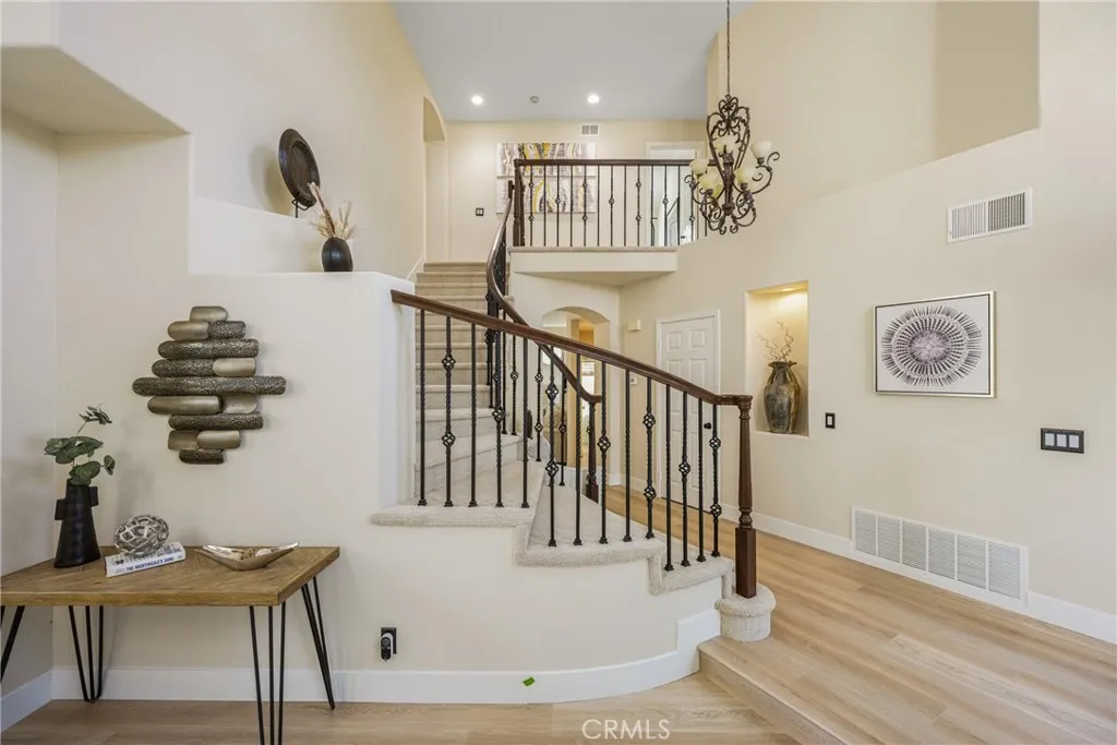 Nestled on a quiet, tree-lined street in the wonderful hillside community of Foothill Ranch, this stunning residence has all the bells and whistles and will surely capture your heart! Built by William Lyon, this inviting home boasts 4 bedrooms, 2.5 bathrooms, and 2,233 square feet of stylish, open-concept living space, with upgraded finishes and outdoor spaces that invite comfortable living and entertaining. Guests are welcomed through custom iron double doors into a bright foyer that opens to a spacious formal living room and dining room with soaring ceilings and walls of windows that bring in natural light. The heart of the home is the remodeled kitchen with granite countertops, custom backsplash, upgraded appliances, and a breakfast nook that opens to the family room—the perfect place for gatherings. Custom upgrades include new luxury vinyl flooring, new carpet, plantation shutters, vinyl windows, recessed lighting, upgraded baseboards, fresh paint, a remodeled guest bathroom, a newer water heater, and an upgraded electrical panel. There is also a convenient downstairs laundry room. The spacious primary suite boasts a vaulted ceiling, a large walk-in closet, and a fully remodeled bathroom with a tiled shower, a seamless glass enclosure, a custom free-standing tub, a quartz vanity with dual sinks, new mirrors, and light fixtures. Three additional bedrooms share a remodeled secondary bathroom. The backyard offers a private setting for relaxation and entertaining, with a built-in BBQ and a fire pit. With custom upgrades throughout, a three-car garage, and a peaceful cul-de-sac location, this Foothill Ranch home offers a rare opportunity and is in true move-in condition.