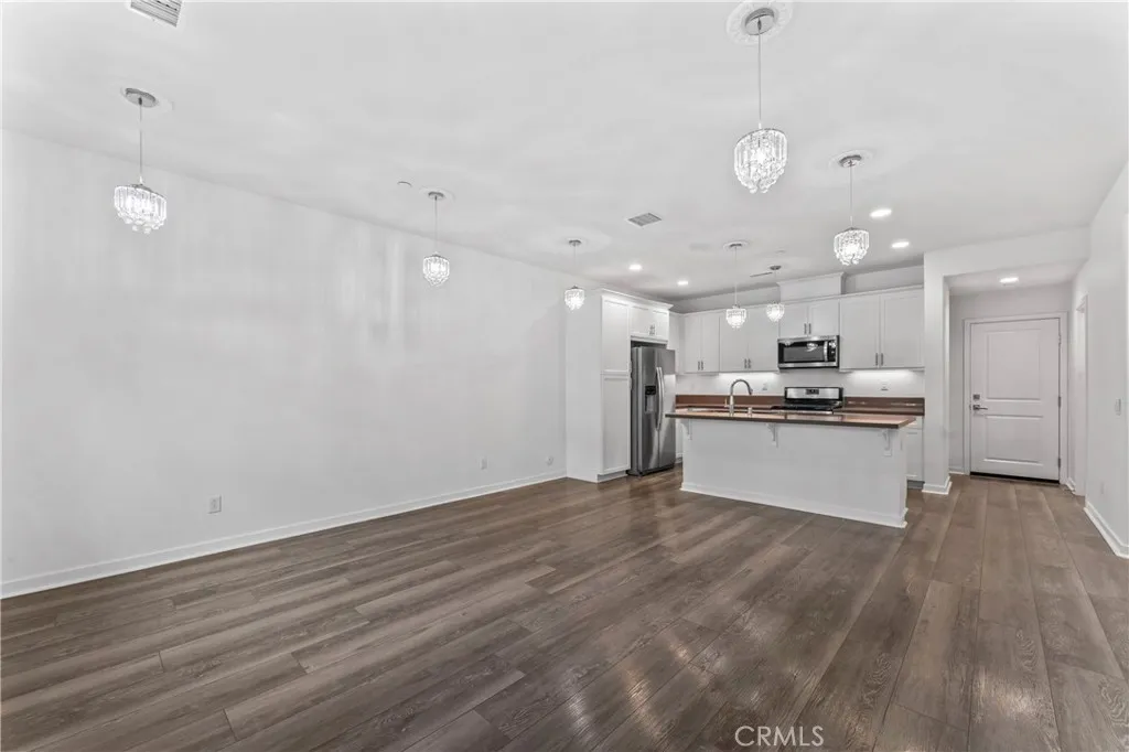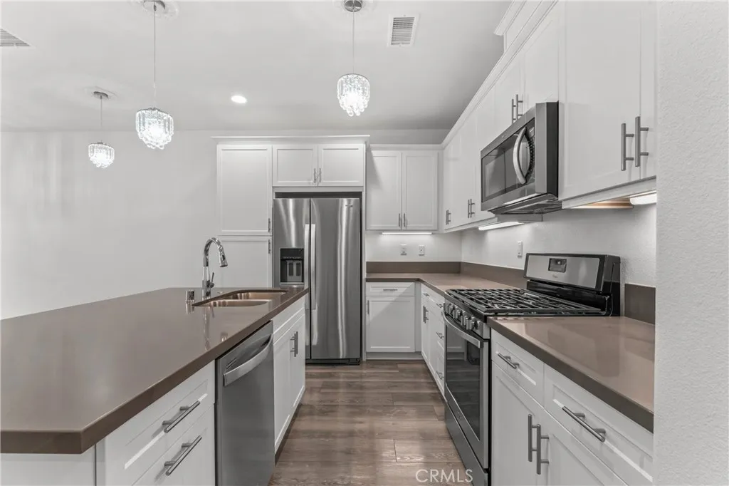 Enjoy upscale living in this luxury townhome in the sought-after Paloma community in West Creek, Valencia. This well-appointed 3 bedroom, 2.5 bath home is 1440 square feet on two levels and built in 2019. A step-up entry way with an extra wide patio leads into an open floor plan featuring high ceilings and luxury vinyl floors. Recessed, energy efficient LED lighting, elegant light fixtures and well-placed windows make this home light and bright. The kitchen includes sharp white shaker cabinets, sleek grey quartz countertops and backsplash, breakfast bar, a stainless steel appliance package, and an included refrigerator. There’s also a convenient “drop zone” just inside the garage door with a location to drop keys, books & bags and to charge phones. The spacious second level primary suite features a walk-in closet and spa-inspired bathroom with dual sinks and a glass-enclosed walk-in shower. Two additional full-size bedrooms share a bathroom with a shower/tub combo. The upstairs laundry room includes a front-loading washer and dryer. Homesmart energy efficient elements include a QuietCool whole-house fan, tankless water heater, low-E glass windows, app-controlled lighting, wifi-enabled insulated garage door, smart thermostat and Ring doorbell. Flat screen TV pre-wiring is available in both the living room and the master bedroom and high-speed internet wiring, data outlets and USB ports are included throughout. LED recessed lighting accents the stairway. A downstairs expanded coat closet and a separate nook with cabinets provide extra storage. Additionally, a Taexx built-in pest control system allows for targeted service that limits contact with family and pets. Residents enjoy access to West Creek & West Hills HOA’s resort-style amenities including a recreation center, multiple pools, basketball courts, parks, and paseo trails. Located near award-winning West Creek Academy, Rio Norte Junior High, and Valencia High. Easy freeway access and close proximity to Westfield Valencia Town Center, dining, and entertainment. This home is like-new and move-in ready!