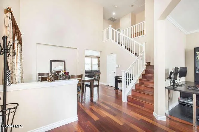 Beautiful modern home that is eco-friendly in West Simi Valley featuring, 4 spacious bedrooms with 3 full bathrooms (1 Bedroom and full bathroom downstairs), solar panels to reduce those electric bills, formal living & dining room. Family room with built-in surround sound with 5 speakers ready to hookup. Open-style kitchen with a large granite island breakfast bar, beautiful backsplash, stainless steel appliances,4 door refrigerator and tile flooring. Lovely wood flooring, crown molding, custom paint, 2.5 inch blinds, upstairs work area, upstairs laundry room with large capacity washer and dryer, built-in storage in the closets,. Well-manicured backyard, with stone pavement patio, Teak wood table & chairs, ample area for gardening. Tile flooring in the kitchen, bathrooms, laundry room and master closet. Fabulous garage with electric car charging outlets for 2 cars, epoxy flooring, wall-to-wall cabinets, mirror, TV & game hook up, HOA amenities include a gated pool and spa, and a gated park. Ring home security system with 3 cameras, ring doorbell and Nest Wi-Fi thermostat can be used for a added fee to the rent. You don't want to miss this beauty.