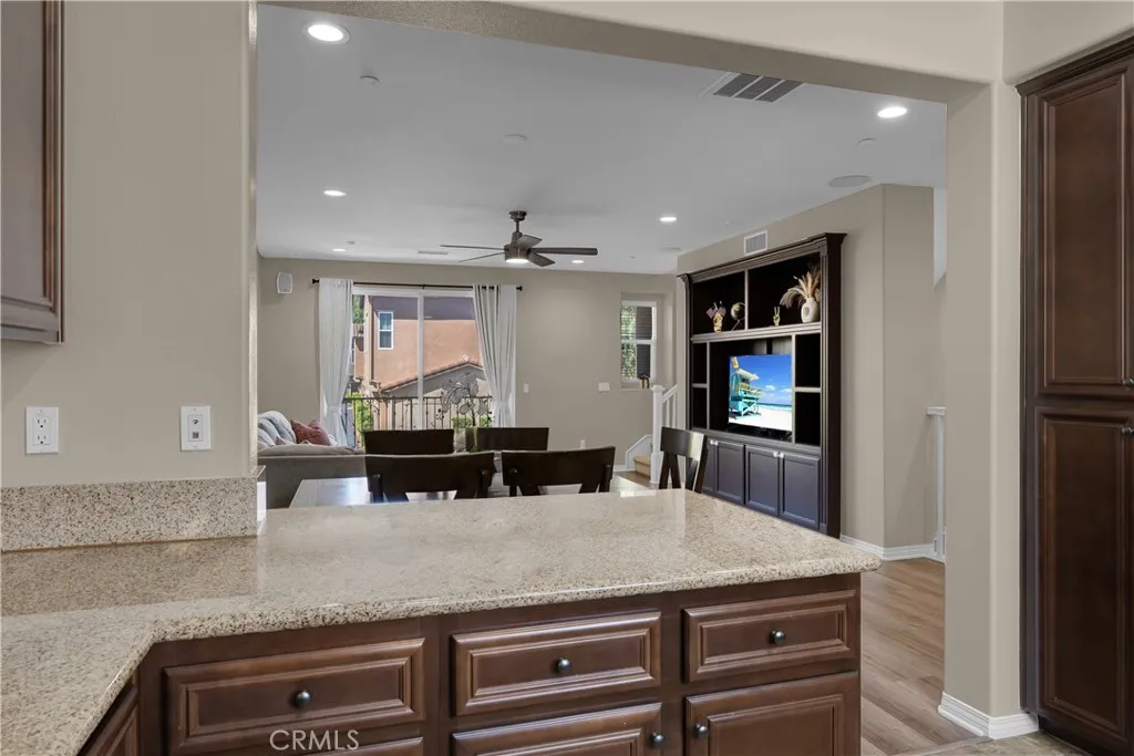 Beautiful 3-story townhome in Harbor Station, part of the desirable Glenwood Master-Planned Community. This light and bright, freshly painted home features new recessed lighting and tasteful upgrades throughout. The remodeled kitchen offers granite countertops, stainless steel appliances, and ample cabinet space, while blinds are installed on all windows for added privacy and style. Bathrooms include updated finishes with a standing shower. This versatile floor plan includes a bedroom and bathroom on the first level, ideal for guests, extended family, or a home office. The middle level features spacious living and dining areas with a private balcony, along with a large kitchen perfect for entertaining. The living room showcases a built-in entertainment center and bookshelves, plus a convenient guest bathroom. The third level includes two bedroom suites, offering comfort and privacy. Additional highlights include a two-car garage with direct access and an enclosed patio for outdoor enjoyment. This home has been well maintained. Residents enjoy the amenities of the Glenwood community, featuring 6.4 acres of public park space, two tot lots, park areas, and scenic trails with fitness stations. Conveniently located near the Aliso Viejo Aquatic Center, with easy access to shopping, dining, and major transportation routes.
