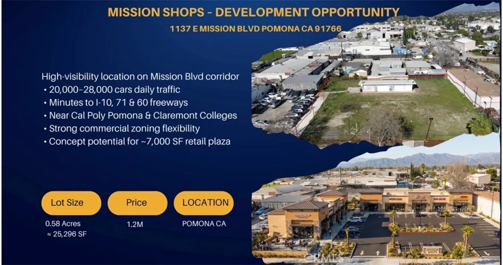 Prime development opportunity located at 1137 E Mission Blvd in Pomona, CA, offering approximately 0.58 acres (25,296 SF) of highly visible commercial land along one of the city’s busiest corridors. Strategically positioned with excellent access to Interstate 10, SR-71, and SR-60, the site benefits from strong commuter exposure with an estimated 20,000–28,000 vehicles per day. The property falls under the Pomona Corridors Specific Plan, allowing for a wide range of commercial and mixed-use developments including retail, restaurant, medical office, personal services, and more. Additional uses such as drive-thru establishments, fitness facilities, and automotive-related businesses may be permitted with city approval. This offering presents a compelling value-add development opportunity, with a proposed concept for approximately 7,000 SF neighborhood retail plaza, featuring 6–7 units and ~30 parking spaces. Surrounded by a strong population base and major educational institutions including Cal Poly Pomona, Western University of Health Sciences, and the Claremont Colleges, the site is ideally positioned to serve both residential and student-driven demand. With proximity to Downtown Pomona and continued city support for corridor revitalization, this site is well-suited for investors, developers, and owner-users seeking a high-growth opportunity in the heart of Southern California.