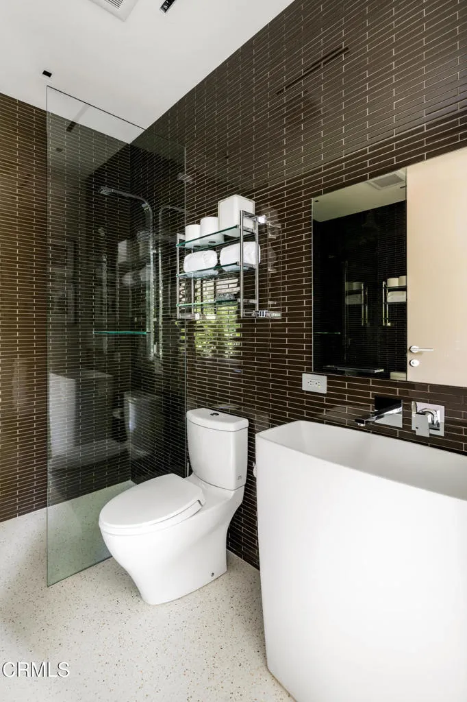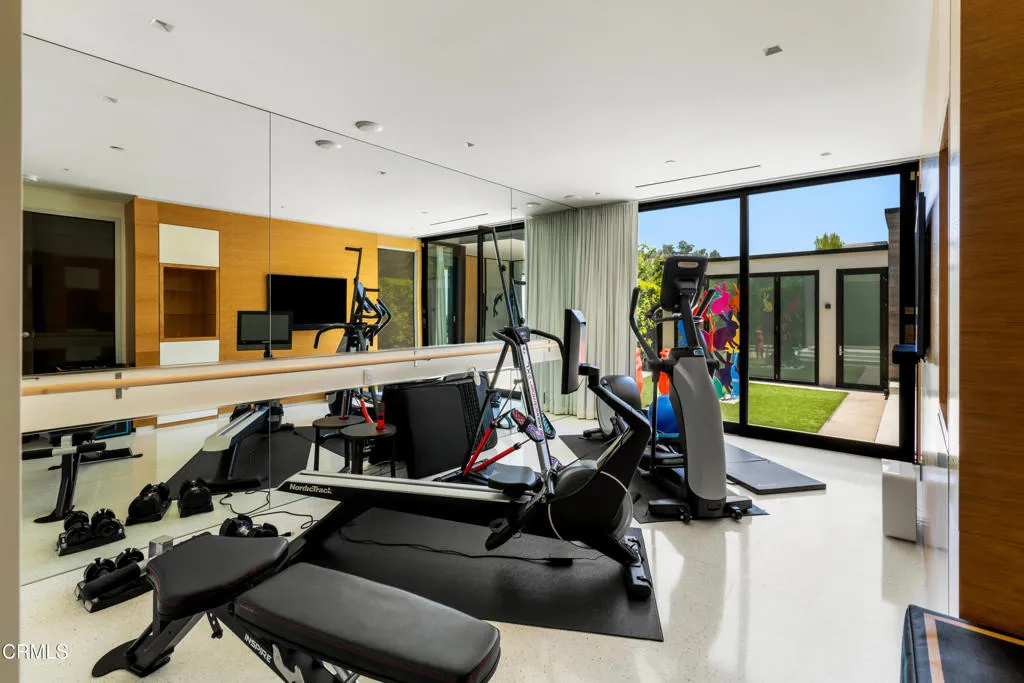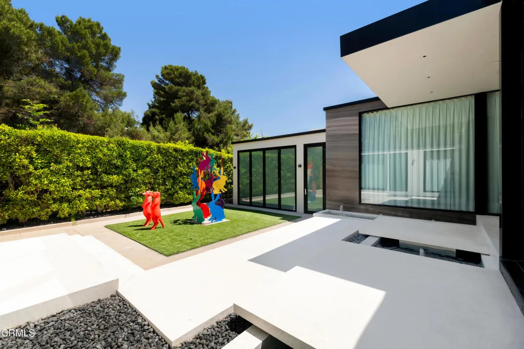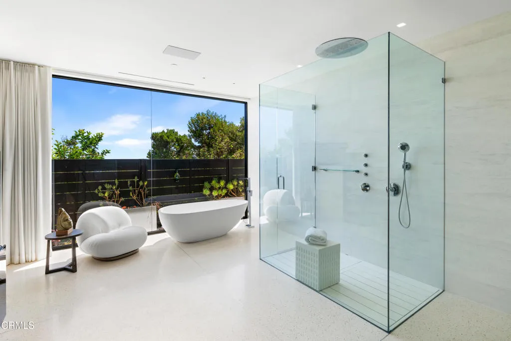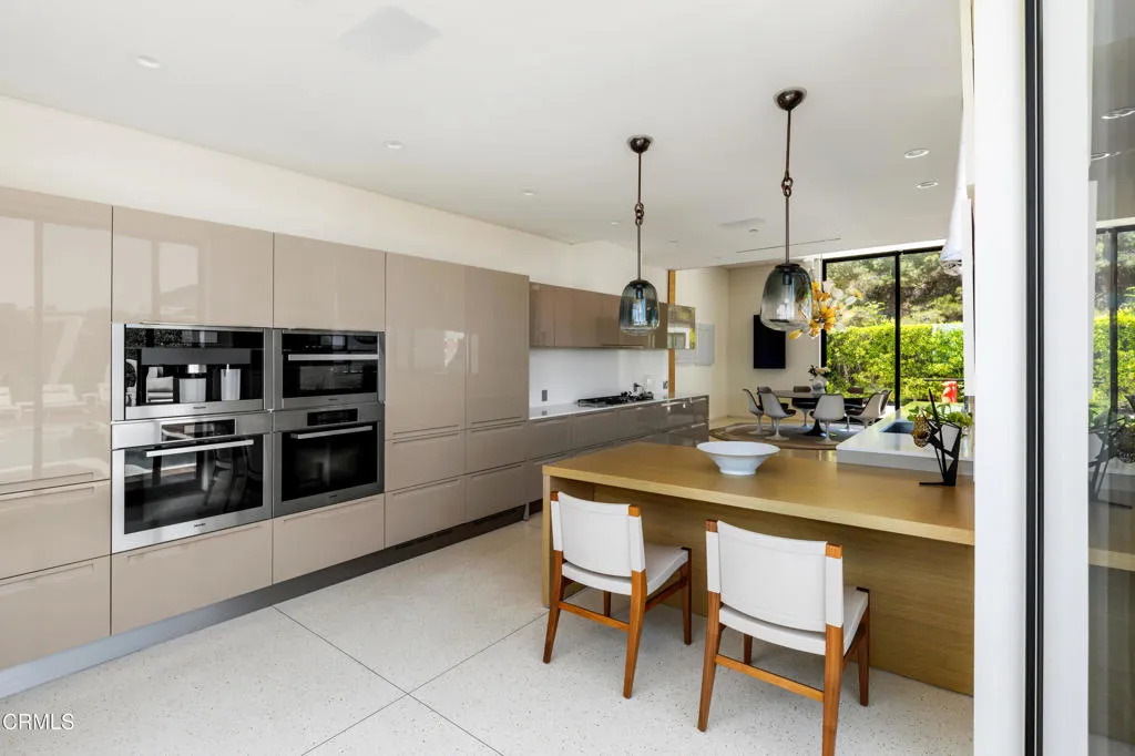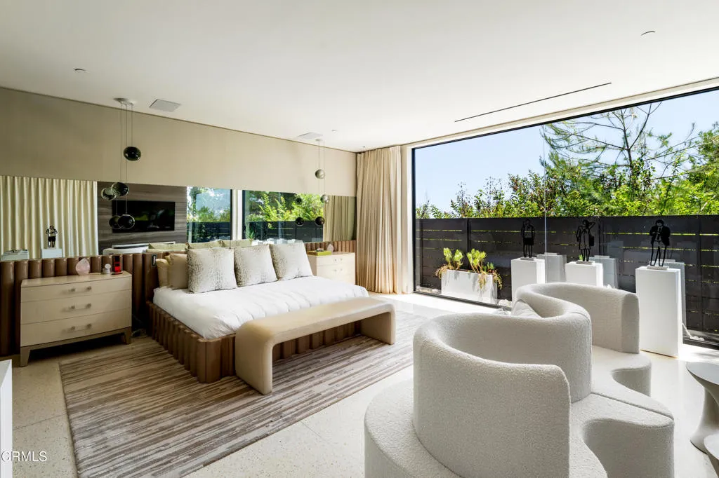Situated on one of the most esteemed streets in Trousdale Estates, this exceptional contemporary home overlooks the Pacific Ocean, Catalina Island, and Los Angeles' dazzling city lights. Designed by Steve Hermann, the residence features soaring 12-foot ceilings, walls of glass, and a rare layout with five en-suite bedrooms. It is built with meticulous attention to detail and the highest-quality finishes throughout.The sleek kitchen boasts glossy Poliform cabinetry and top-of-the-line Miele appliances. Beneath a statement suspension lamp by Barovier & Toso, the formal dining room is surrounded by glass sliding doors that open to the front courtyard. The breakfast area and outdoor dining spaces provide additional seating for entertaining, all while capturing stunning backyard views.The primary retreat is worthy of its own private wing, complete with a stone fireplace, a glass-enclosed dressing area, and an opulent en-suite bathroom featuring dual sinks, an Antonio Lupi bathtub, and a generous rainfall shower. Four additional en-suite bedrooms each showcase unique wallpaper, lighting fixtures, and decor. A Control4 smart home system, surround sound system, security cameras, and automatic window treatments are among the many state-of-the-art features.A truly magnificent home that seamlessly combines location, views, privacy, modern design, and warm textures.