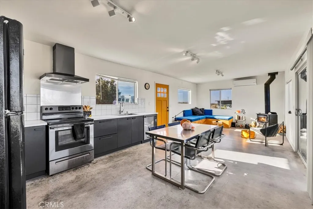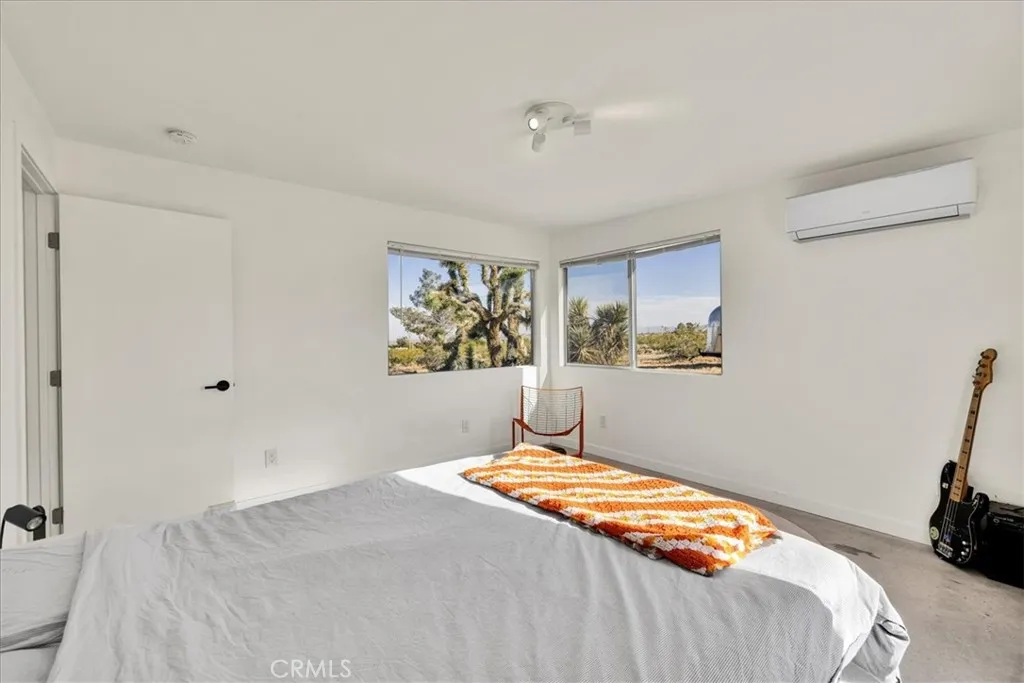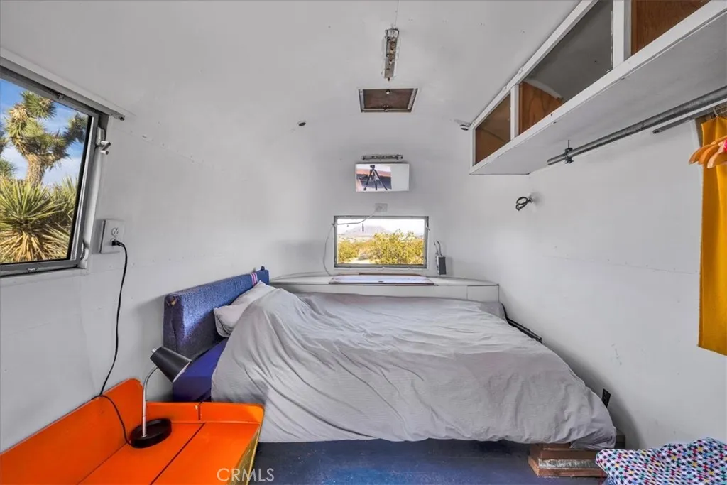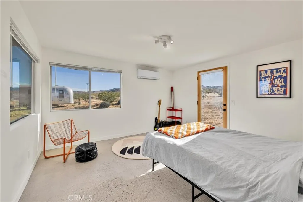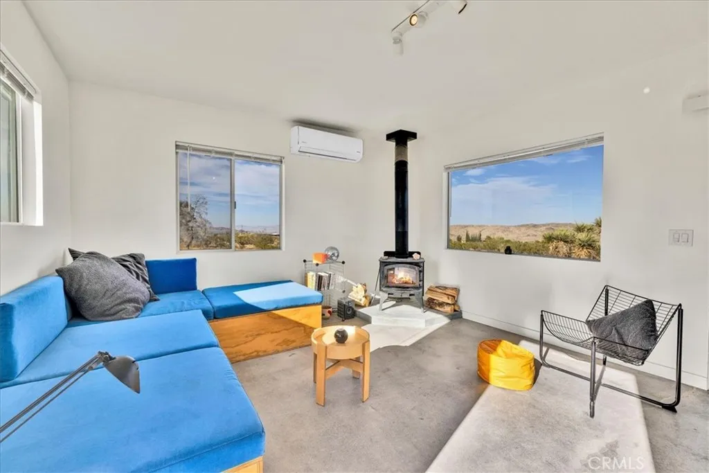 Set on 2.5 acres in the heart of Landers, this fully rebuilt and thoughtfully expanded 2-bedroom, 2-bath home offers striking, unobstructed views of Goat Mountain right from the center of the property. Nearly everything is brand new, blending modern efficiency with artistic character. Inside, the bathrooms are a true highlight, featuring a deep soaking tub perfectly positioned beneath a window and finished with vibrant, colorful grout that adds a unique designer touch. The living room is anchored by a cozy wood stove and a custom-designed sofa with integrated storage (removable if desired), while energy-efficient mini splits provide year-round comfort in both hot desert summers and cool winter nights. A dedicated laundry area adds everyday convenience. Outdoors, two patios create ideal spaces for relaxing or entertaining under the wide-open desert sky, highlighted by a mature Joshua tree—a special and increasingly rare feature in this part of Landers. The property also includes two sheds—one well-suited as an art studio or home office—and a vintage Airstream that can be included in the sale, adding extra charm and flexibility. Located just one block from pavement for easy access, and within close proximity to local favorites like the Integratron, Gubler’s Orchids, and La Copine, this home is also just 25 minutes to Joshua Tree National Park and 20 minutes to Pappy & Harriet’s, making it a perfect full-time residence, weekend escape, or investment opportunity.