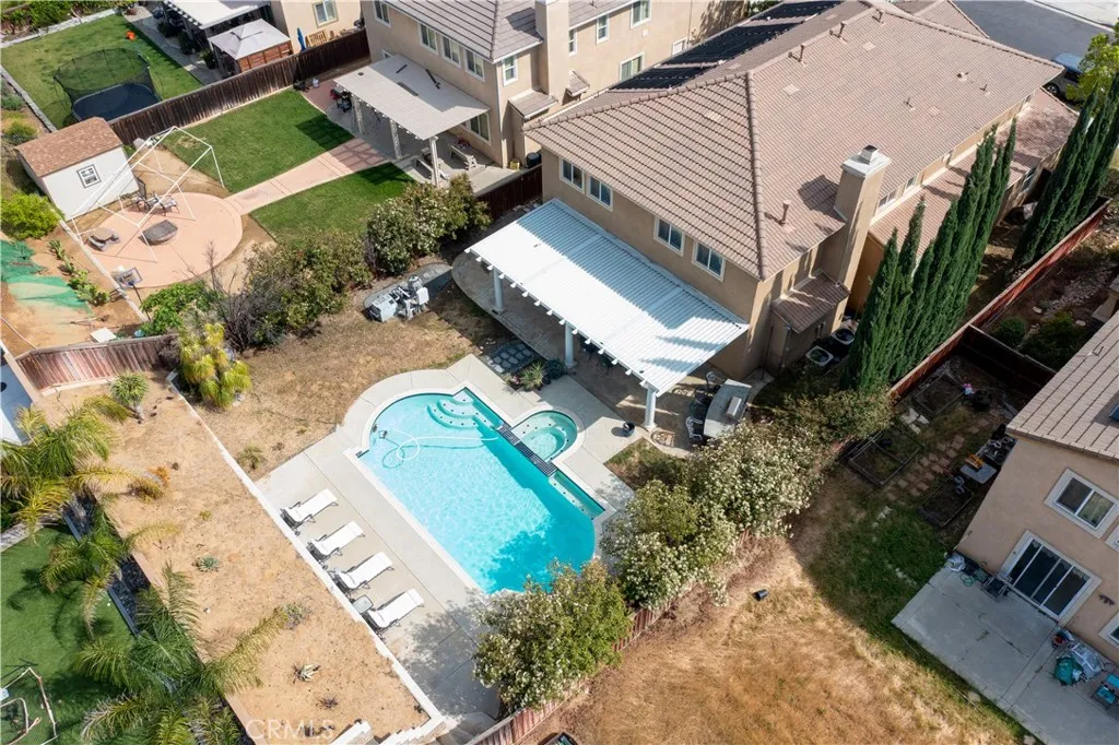 Located in the Shadow Creek community of Beaumont with No HOA. This stunning two-story residence with 5 bedrooms and 3 baths offering 3935sqft of living space. Two bedrooms downstairs with a mix of pergola and tile floors throughout. The open concept layout features an expansive chef’s kitchen with a large granite island and honey-toned cabinetry that opens directly into a spacious family room, anchored by a cozy tile-surround fireplace. Upstairs you have an open loft/game room with pool table and bar perfect for entertaining. Laundry upstairs for easy convenience. The primary bedroom is oversized and includes a private retreat with a fireplace. Large bathroom with separate tub and shower and access to the walk-in closet. Rear yard features a spectacular swimming pool and spa that takes center stage. Covered patio with built on BBQ perfect for gathering with family and friends. Split zone AC unit, solar pool heater and whole house water filtration are a few of the amenities included with this property. It is conveniently located close to schools, shopping, freeway access, and parks. Turnkey and ready to move in.