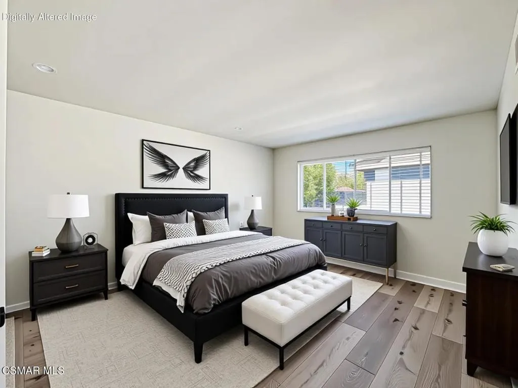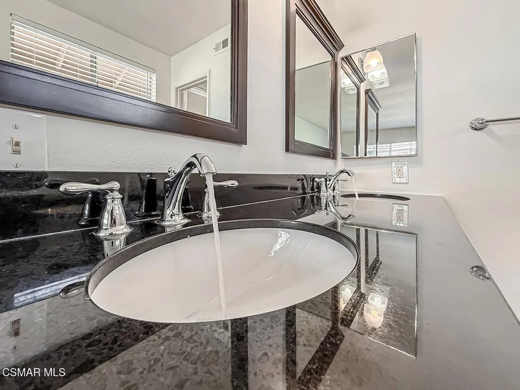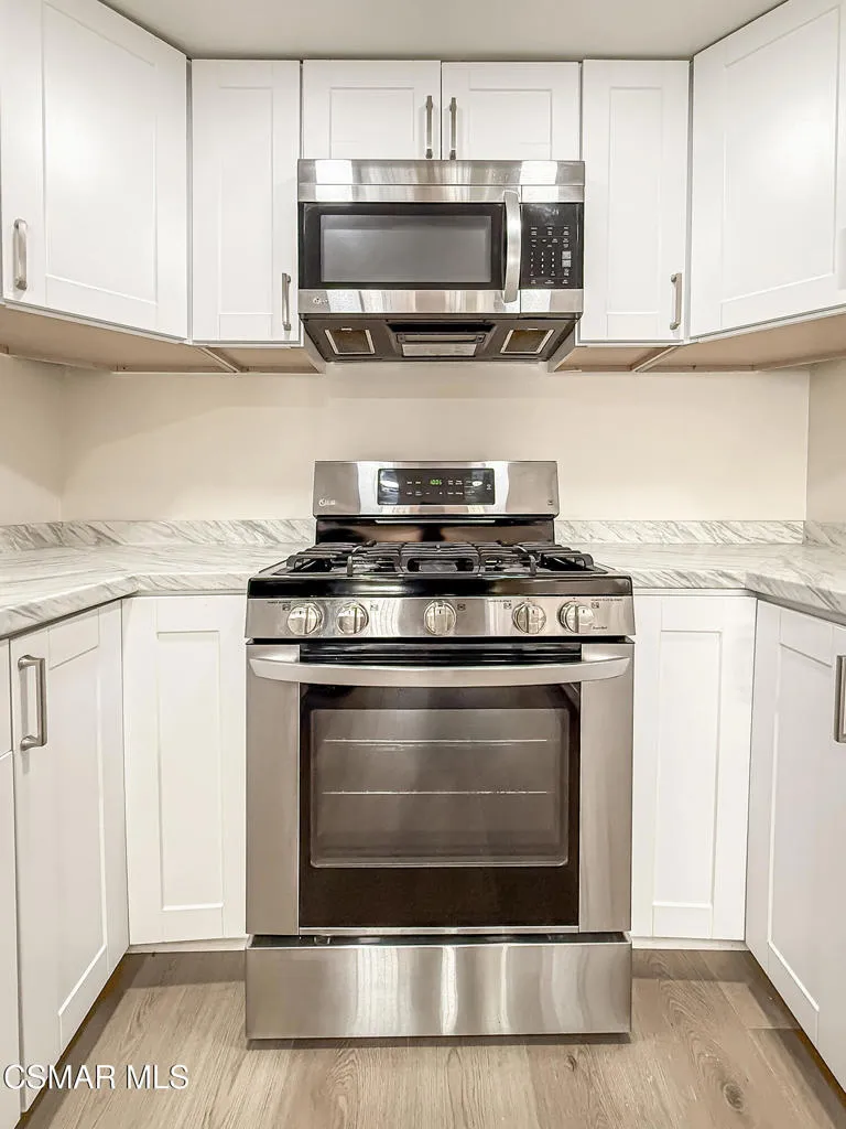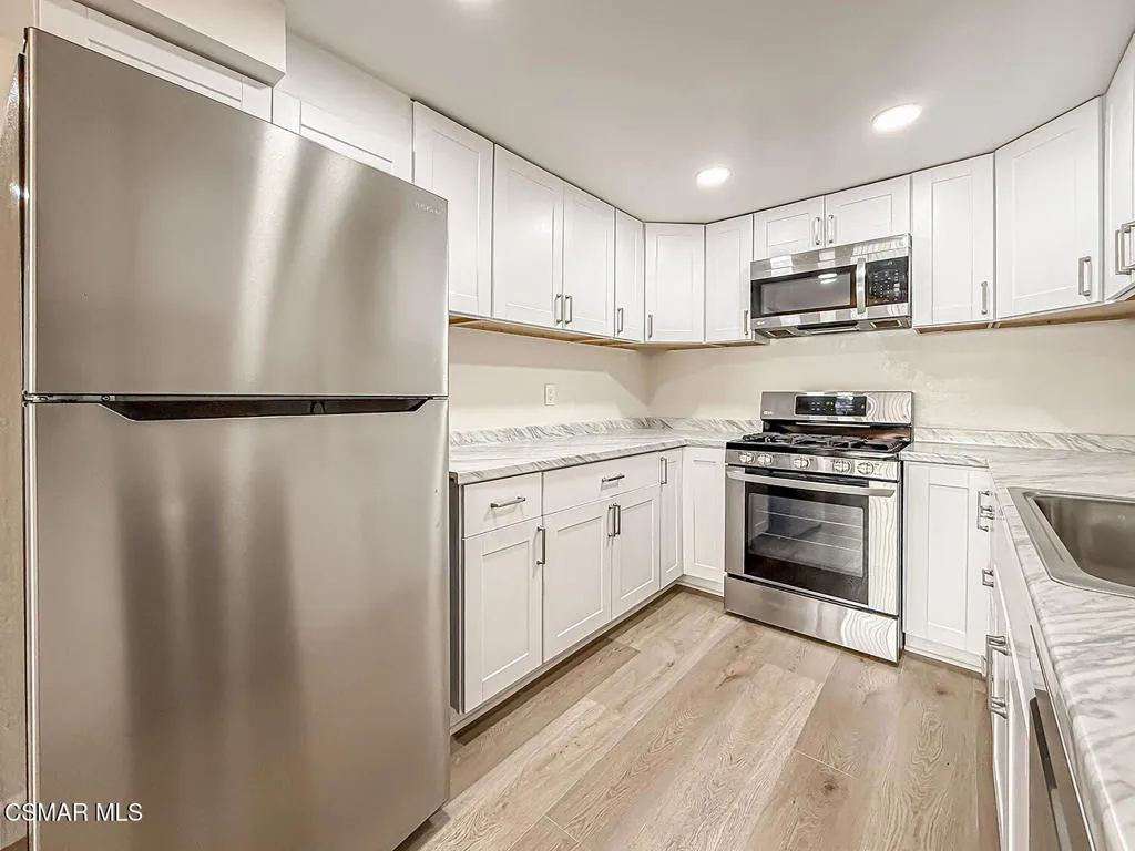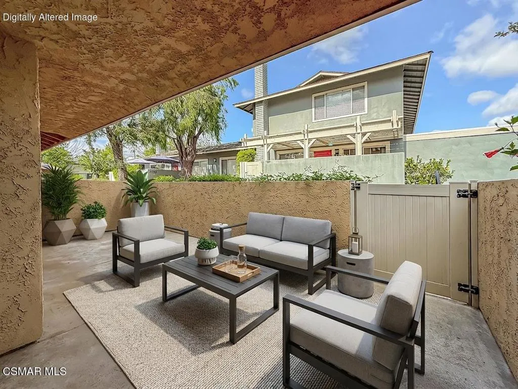 Upgraded Las Flores Villas townhome located at the END of the street--just one home away from the community Pool, Spa, and Tennis Court! This 2 bedroom, 2.5 bathroom home offers 1,188 Sq Ft of BRIGHT and inviting living with thoughtful upgrades throughout.The roomy front patio creates a tranquil setting for morning coffee or evening relaxation. Inside, the Entry introduces you to HANDSOME wide-plank vinyl flooring and upgraded baseboards that continue throughout the home. The Living Room is anchored by a charming brick-surfaced gas fireplace and highlights numerous recessed lights along with large treated windows overlooking the patio. The Dining Room sits just off the Kitchen and is FULL of natural light from sliding glass doors that open to the front patio.The Kitchen has been REMODELED with quartz-like countertops, modern shaker-style cabinetry, added recessed lighting, a large stainless-steel sink, and stainless-steel appliances including a 5-burner LG gas range with matching built-in LG microwave. A Powder Room downstairs features an upgraded vanity and ceramic tile flooring.Upstairs, the hallway continues the wood-like vinyl flooring and provides a CONVENIENT laundry area with stacked units. The Secondary Bedroom offers large windows and a long closet with sliding mirrored wardrobe doors. The SPACIOUS Primary Bedroom boasts a WALK-IN closet, upgraded flooring, and a REDONE en-suite bathroom featuring wood-like tile flooring, an upgraded granite-topped dual-sink vanity, and a separate water room with redone shower and sliding glass doors. The Hall Bathroom has also been refreshed with an upgraded granite-topped vanity, revamped tub shower, and ceramic tile flooring.Parking includes a DIRECTLY accessible single-car garage plus an assigned parking space. Additional highlights include SCRAPED ceilings throughout and a NEWER HVAC system.Las Flores Villas offers excellent community amenities including a glimmering pool and spa, a beautiful tennis court, and a large grass area. The home enjoys ACCESS to award-winning Conejo Valley Unified Schools, WALKABILITY to Los Cerritos Middle School, and CLOSE proximity to shopping at Gelson's, Vons, CVS Pharmacy, Fitness19 gym, and ACE Hardware, as well as the AMAZING Lang Ranch hiking and biking trails.