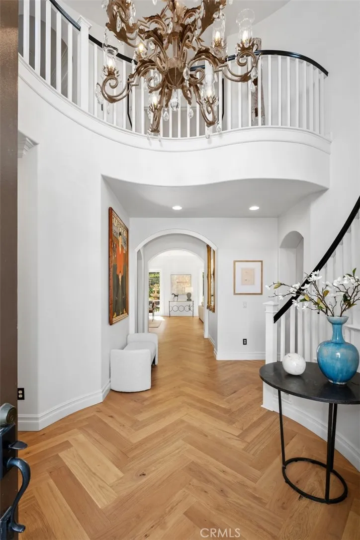 Experience luxury living in this highly upgraded residence located in the prestigious gated community of San Juan Hills Estates. Set on an expansive, beautifully landscaped lot, the home offers exceptional curb appeal, privacy, and refined design throughout. A private courtyard entry leads to a grand foyer highlighted by a statement chandelier and hand-laid European oak flooring. Sun-filled living and dining rooms provide an elegant setting and open to the backyard through French doors, creating seamless indoor-outdoor flow. The open-concept family room and kitchen form the heart of the home, ideal for everyday living and entertaining. The kitchen features a large center island with quartzite countertops, custom finishes, premium appliances, pot filler, a generous walk in pantry and exquisite herringbone-pattern white oak flooring. The adjoining family room includes a fireplace, custom built-in cabinetry, and direct backyard access. A main-level en suite bedroom is ideal for guests, along with a separate powder room. Additional highlights include a Butler's pantry, plantation shutters through-out , recessed and designer lighting, a new HVAC system, Nest thermostat, hardwired EV charging, new washer and dryer, new dishwasher, and Best of All, having a 30+ solar panels which guarantee minimal electric bills and maximum efficiency. Upstairs, a sweeping curved staircase leads to the spacious primary suite, complete with dual walk-in closets and a spa-inspired bath featuring a soaking tub, separate shower, dual vanities, and abundant natural light. A versatile loft offers space for a home office, media room, or play area. Two additional bedrooms share a Jack-and-Jill bathroom. The expansive backyard is designed for relaxation and entertaining, featuring generous outdoor living space, an outdoor fireplace, tranquil water features, and peaceful hillside surroundings. Ideally located near hiking and biking trails, dining, shopping, and historic downtown San Juan Capistrano, with easy access to beaches, resorts, top-rated schools, and major freeways.